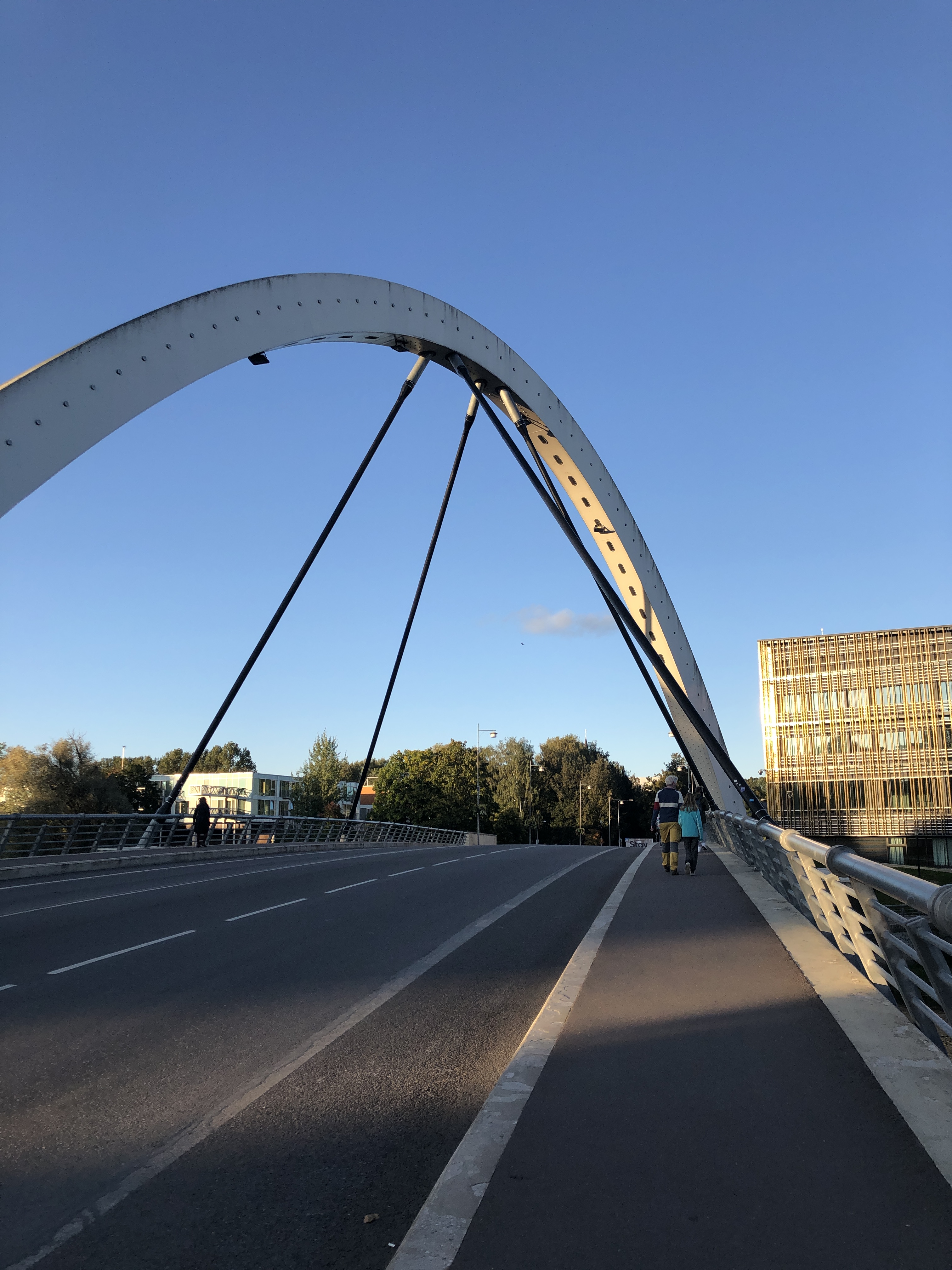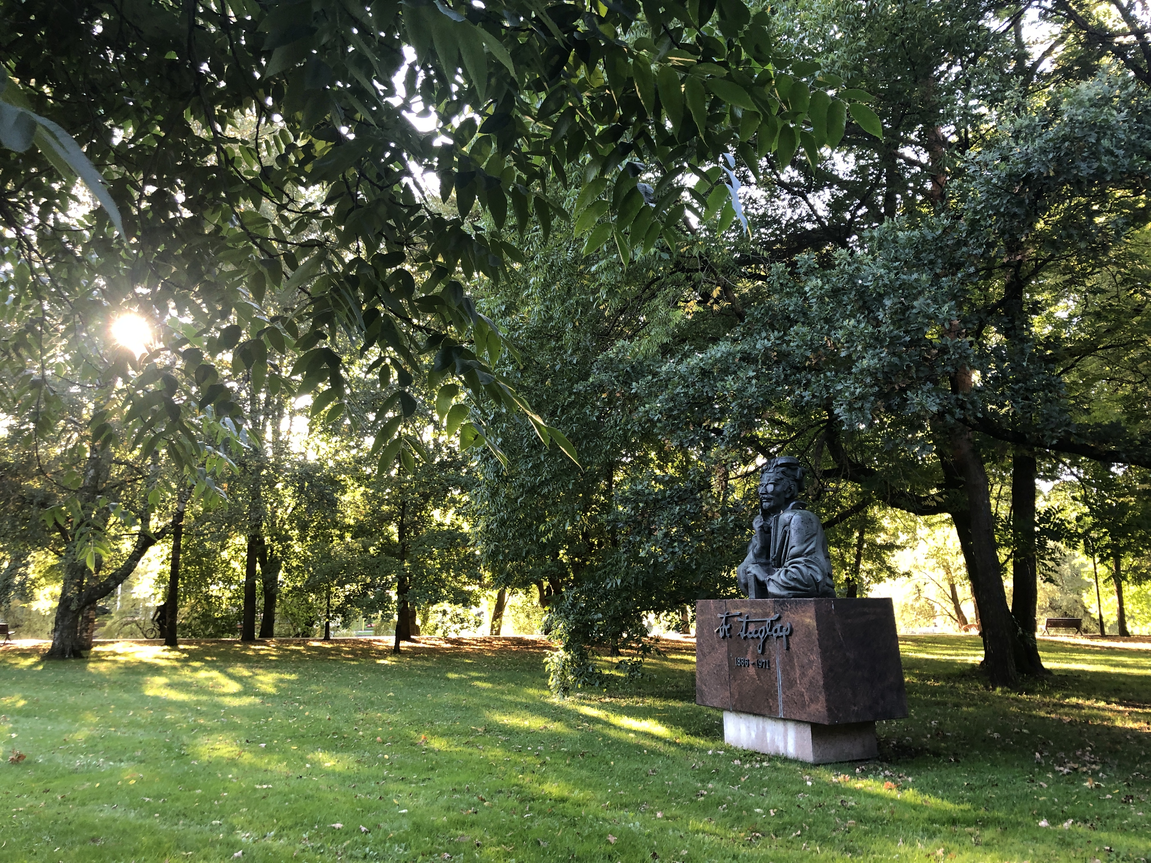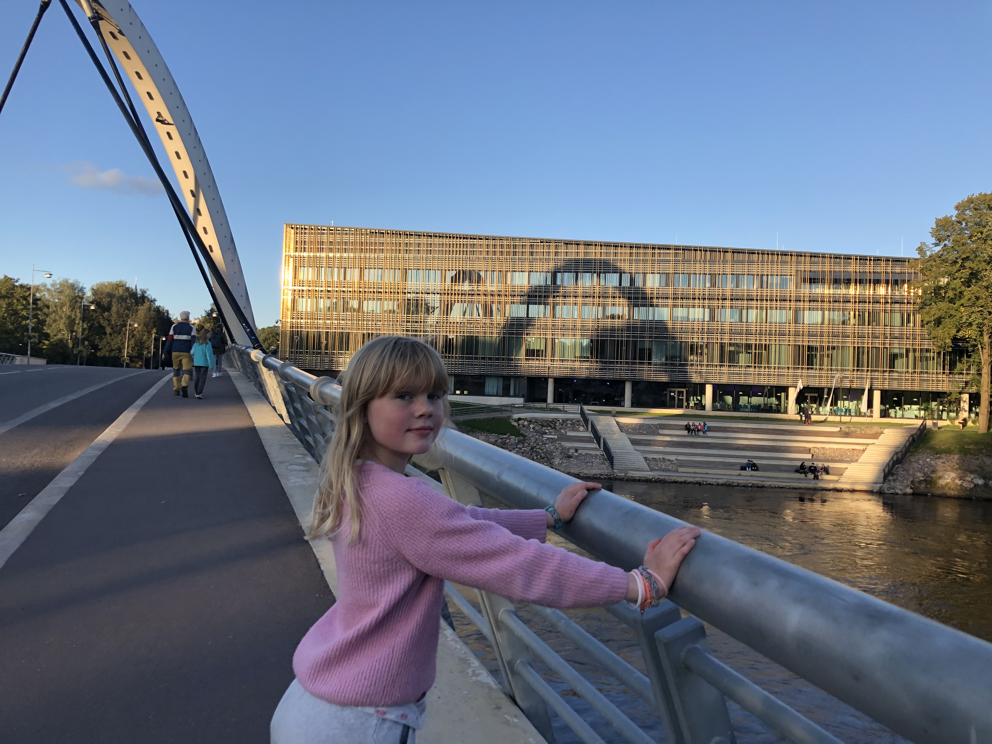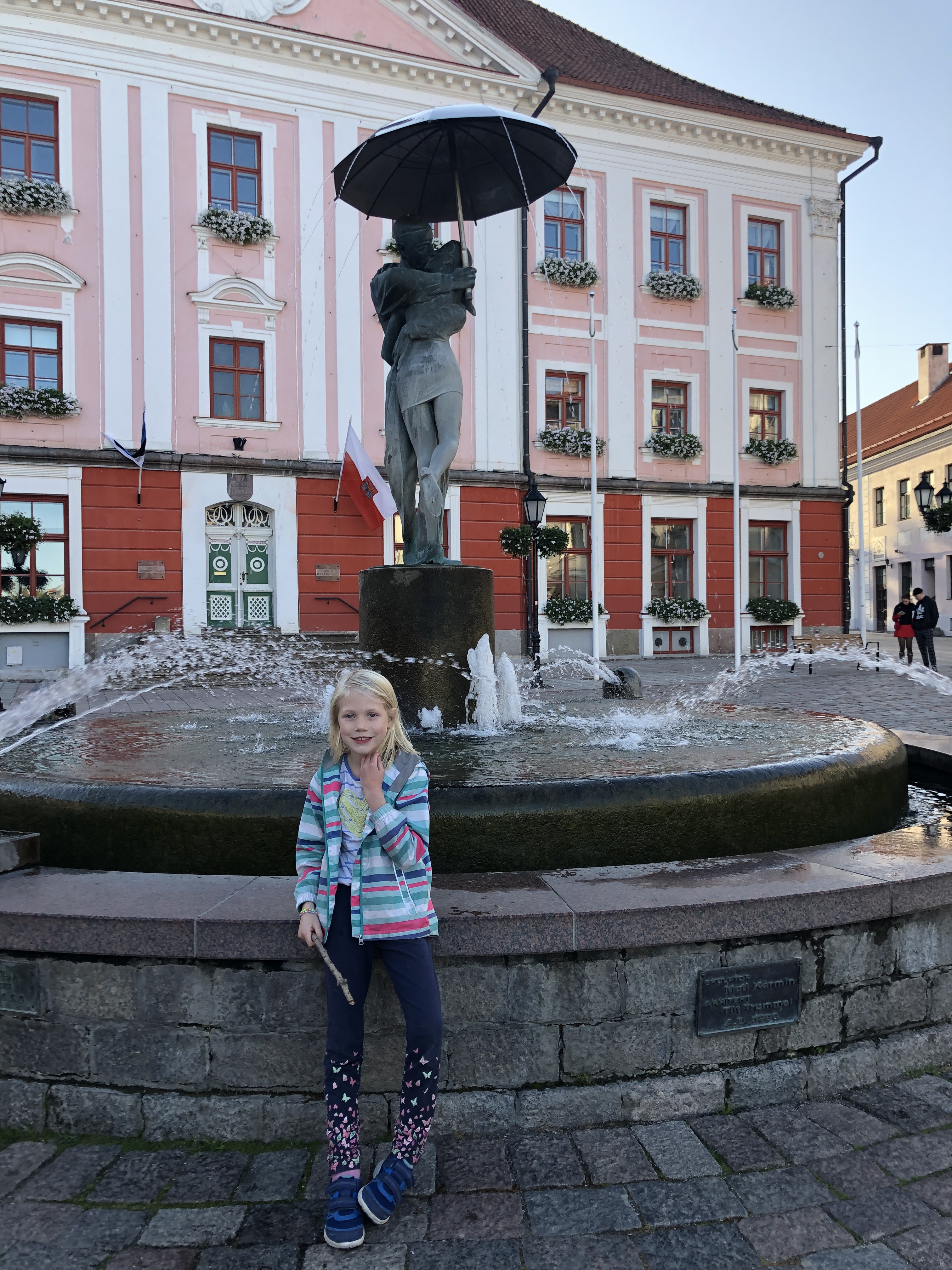 Then we walked into the city center and took a look around. It is right on a river, which I love, with a large park on one side. The old town centers on the University building, a lot of cool cafes and this statue that Luisa was obsessed with. 🙂