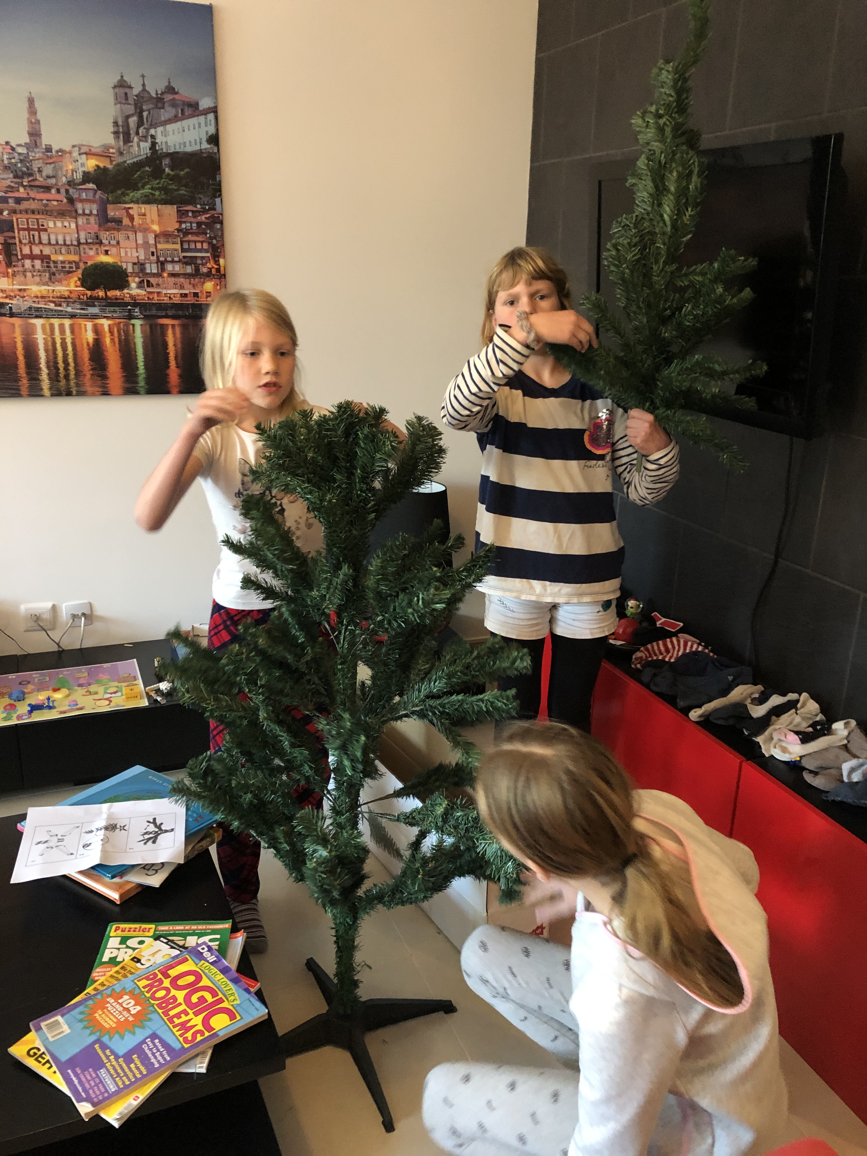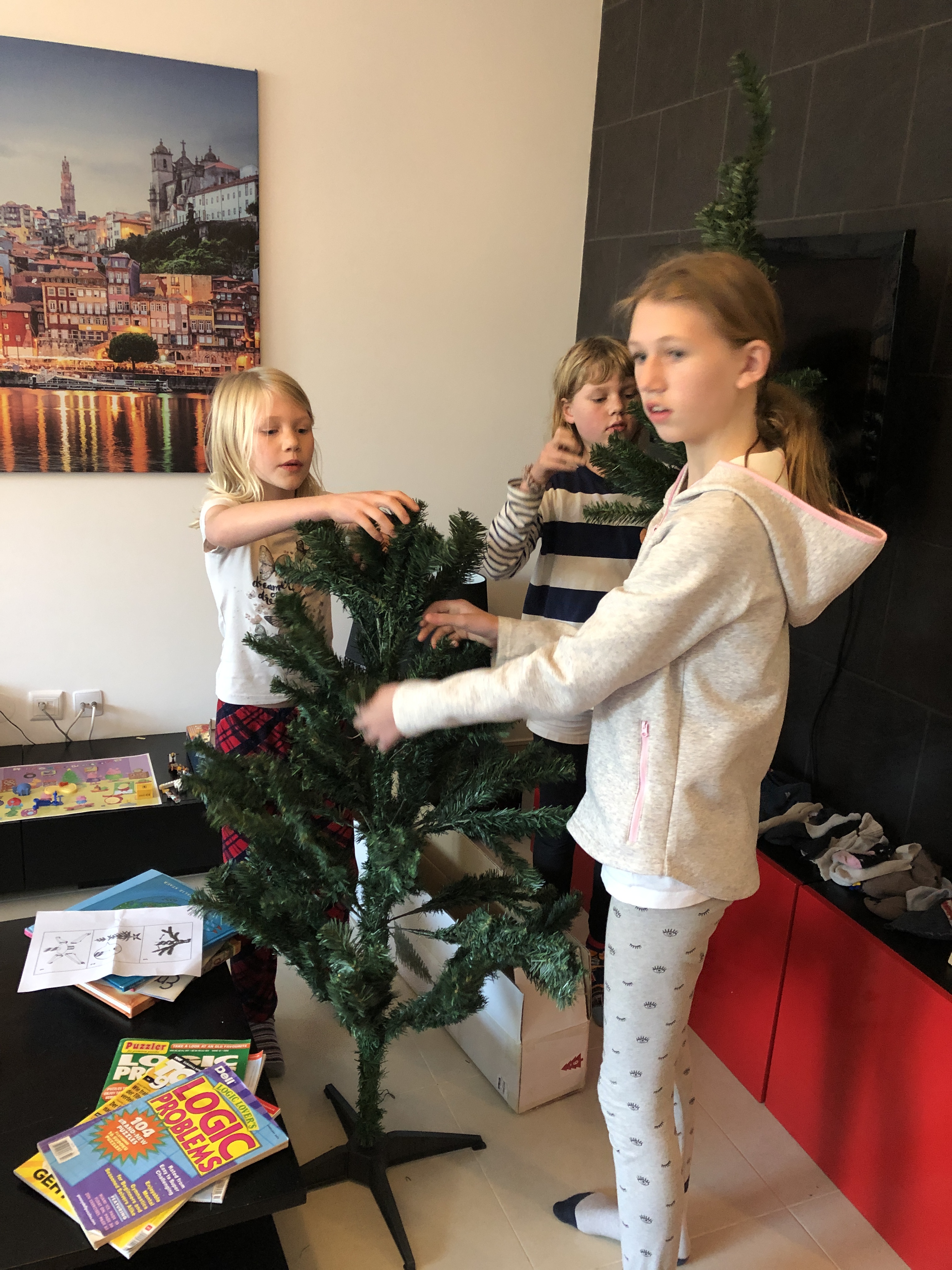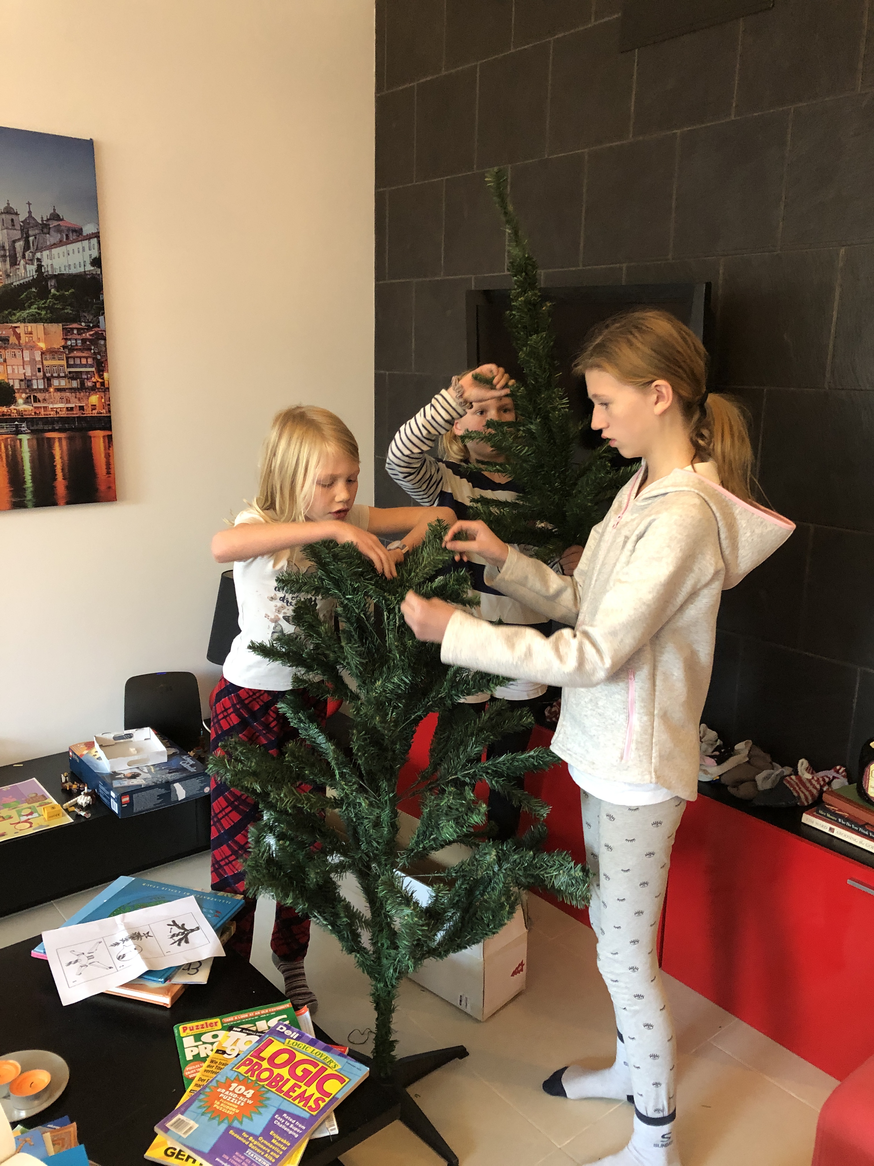 Yesterday when Steffen and I braved rye grocery store, we saw a small fake tree so we picked one up as a surprise for the girls. They were so excited! They got to work right away making decorations to get into the holiday mood. I love their creativity and initiative.