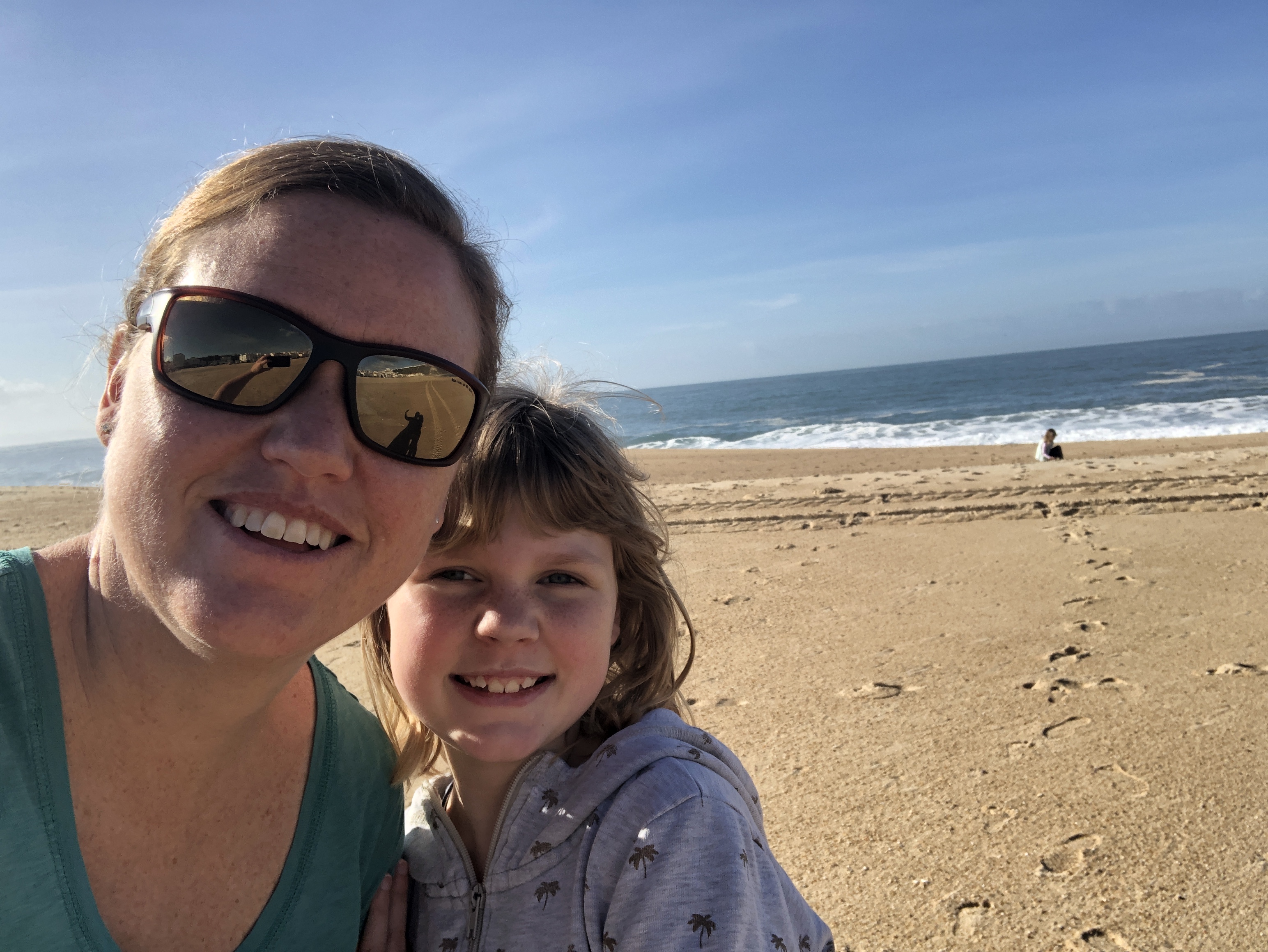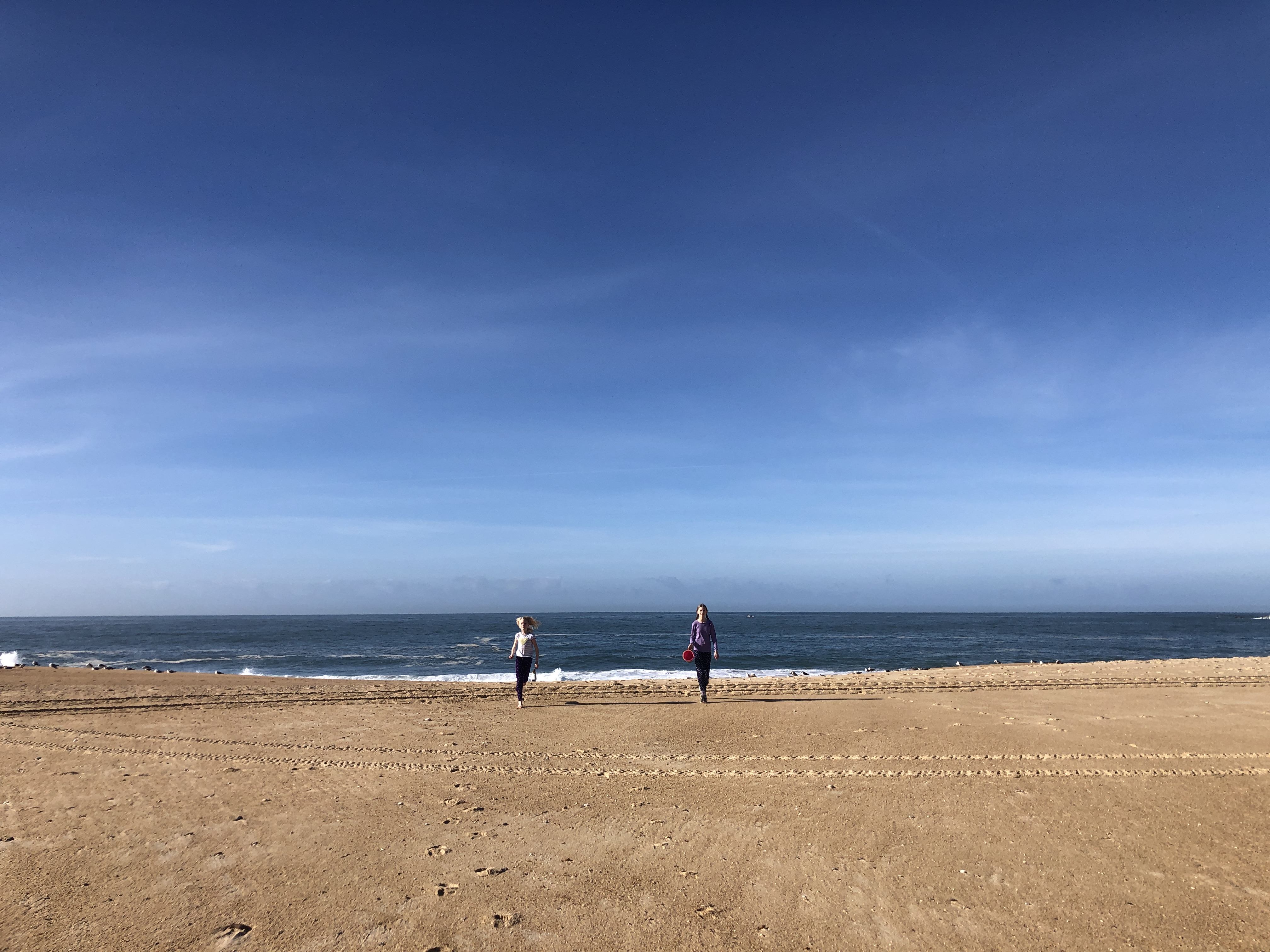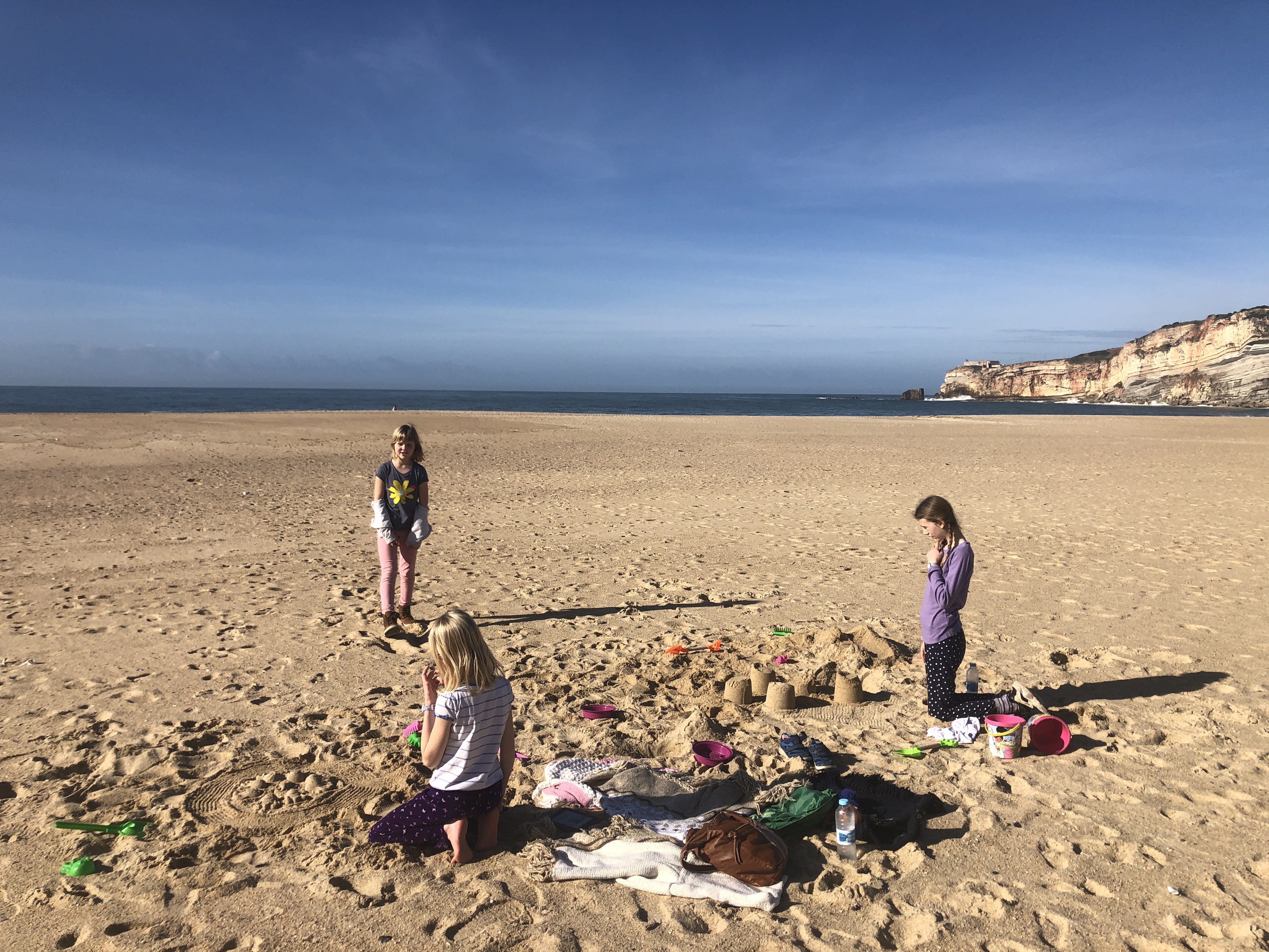 On Thursday the weather was so beautiful, we couldn’t stand to stay in the house and do our schoolwork! So we walked over to the tram and headed down to the beach. We picked up some sand toys at a local vendor and spent hours playing on the beach. Steffen came down for lunch (pizza, of course!), and then we played some more. We headed back to the apartment in time for a beautiful sunset. Then the girls finished the day with a video/games call with Grandma; a good day all around!