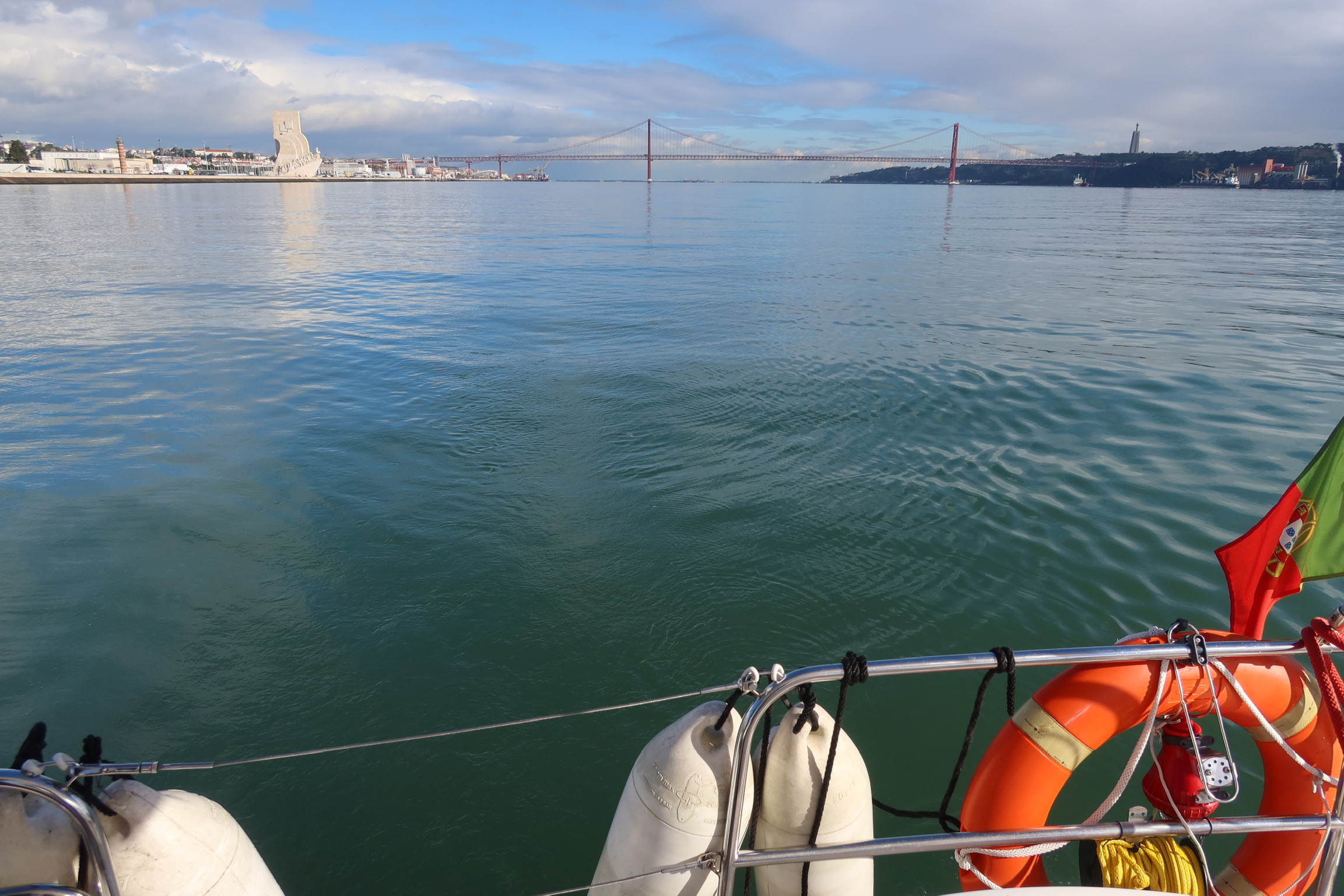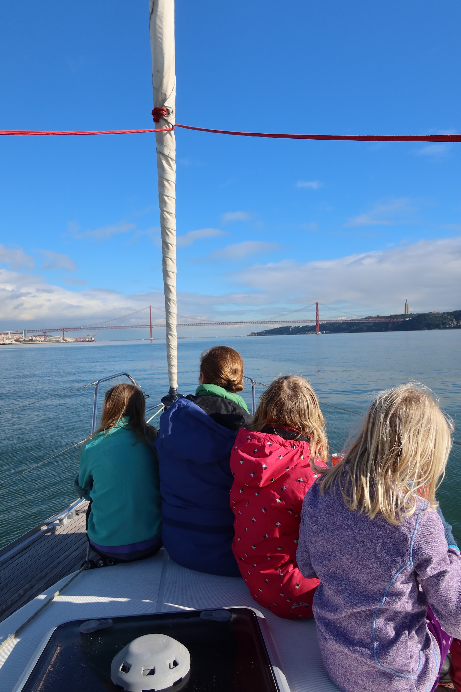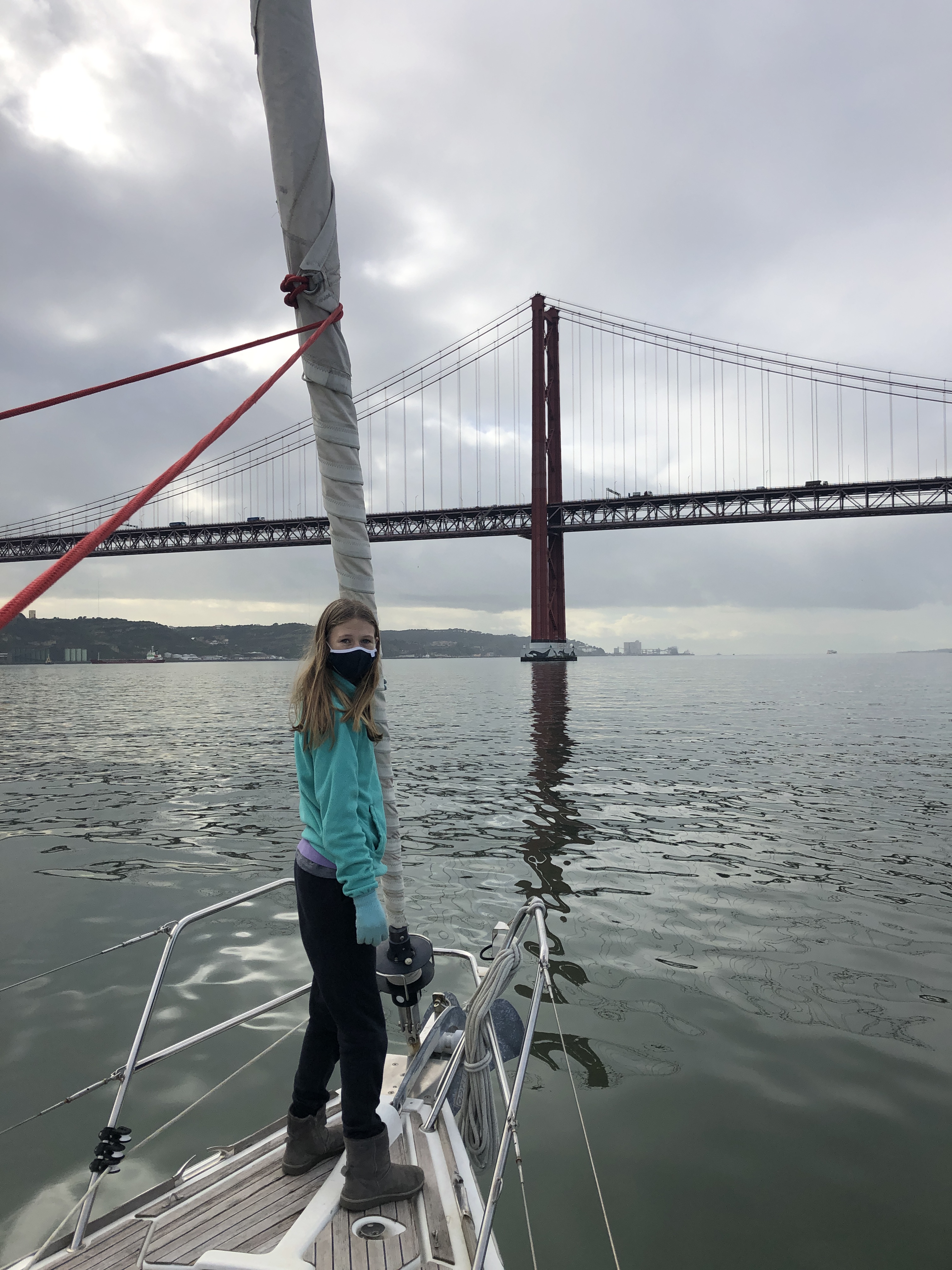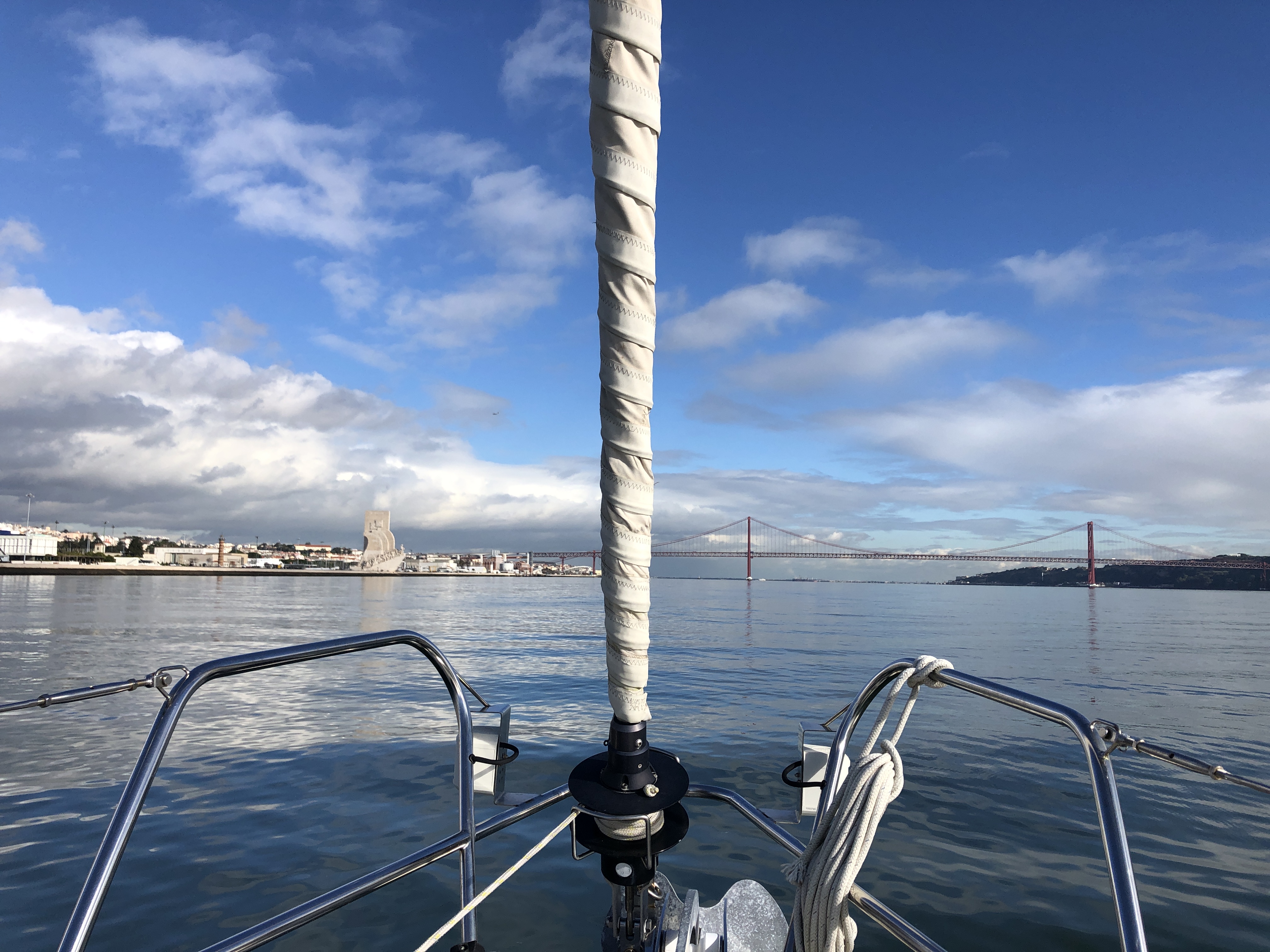 Then it was time to sail! We met up with Tiago and Tiago at the port and were pleasantly surprised by the beauty of the boat and the kindness of our hosts. It was a bit overcast/rainy when we started but quickly turned into a gorgeous afternoon. There wasn’t enough wind to put the sails out, so we just cruised along, enjoying the sunshine, calm seas and learning about Lisbon. It really was a wonderful afternoon and we all enjoyed ourselves more than expected! 🙂 Luisa spent a lot of time driving the boat, and Hannah and I sat on the bow almost the whole time. We also felt very safe, both as far as boat safety goes but also “coronavirus safe”. We know that the tourist industry all over the world has been decimated by this pandemic, so we are always happy when we find safe activities where we can support local tour operators. And we have met some lovely people here in Portugal through these type of experiences. Win, win.
