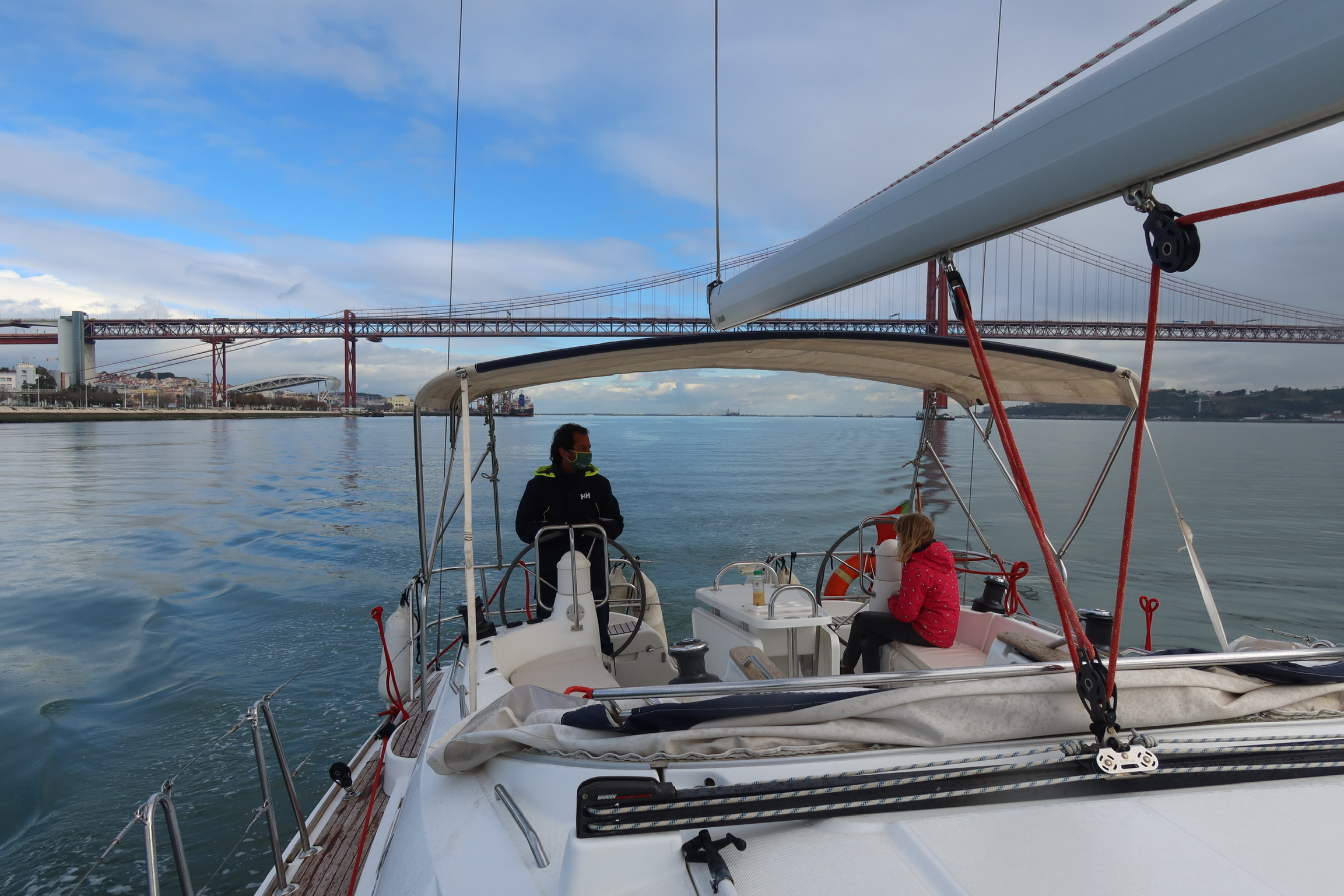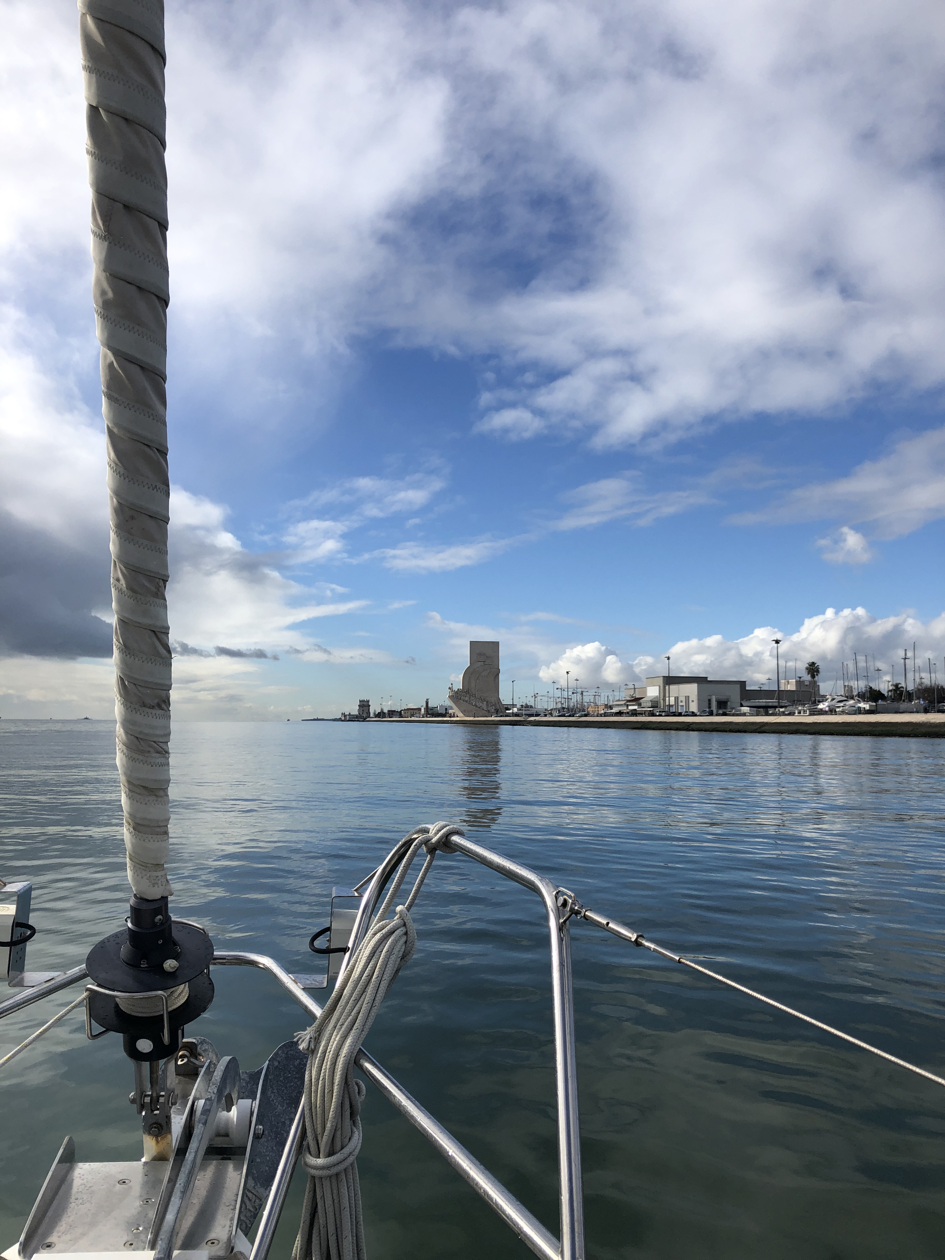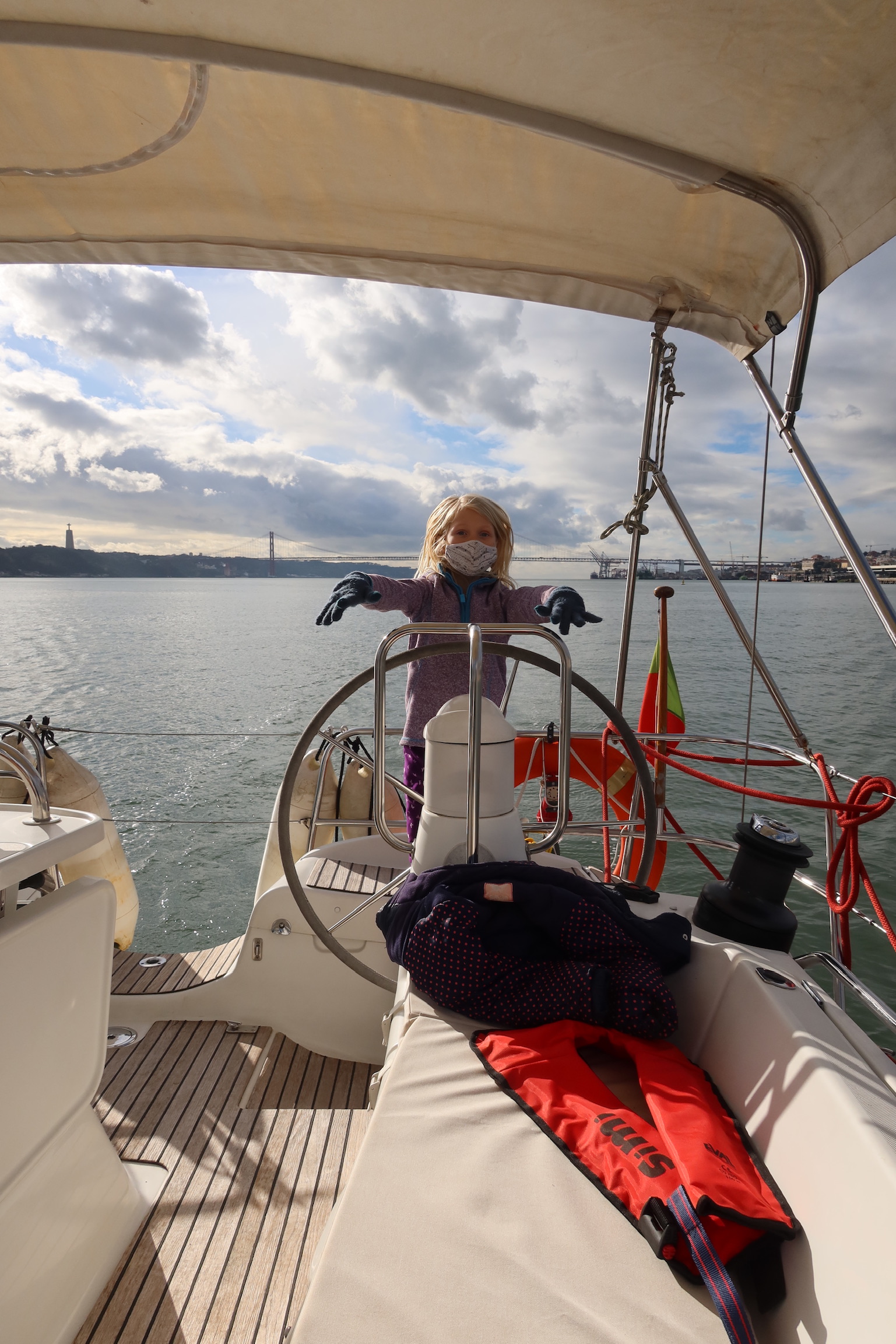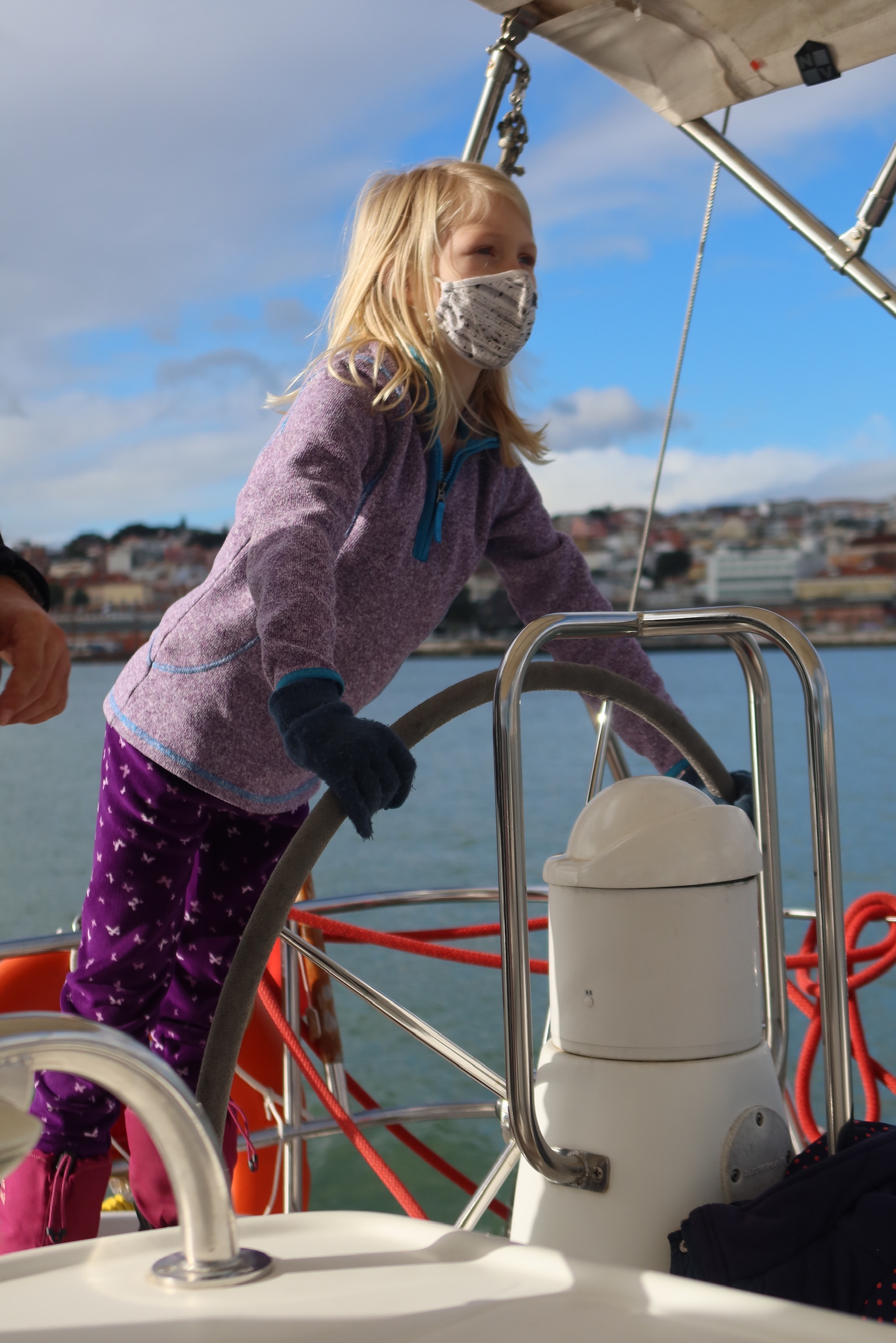 Then it was time to sail! We met up with Tiago and Tiago at the port and were pleasantly surprised by the beauty of the boat and the kindness of our hosts. It was a bit overcast/rainy when we started but quickly turned into a gorgeous afternoon. There wasn’t enough wind to put the sails out, so we just cruised along, enjoying the sunshine, calm seas and learning about Lisbon. It really was a wonderful afternoon and we all enjoyed ourselves more than expected! 🙂 Luisa spent a lot of time driving the boat, and Hannah and I sat on the bow almost the whole time. We also felt very safe, both as far as boat safety goes but also “coronavirus safe”. We know that the tourist industry all over the world has been decimated by this pandemic, so we are always happy when we find safe activities where we can support local tour operators. And we have met some lovely people here in Portugal through these type of experiences. Win, win.