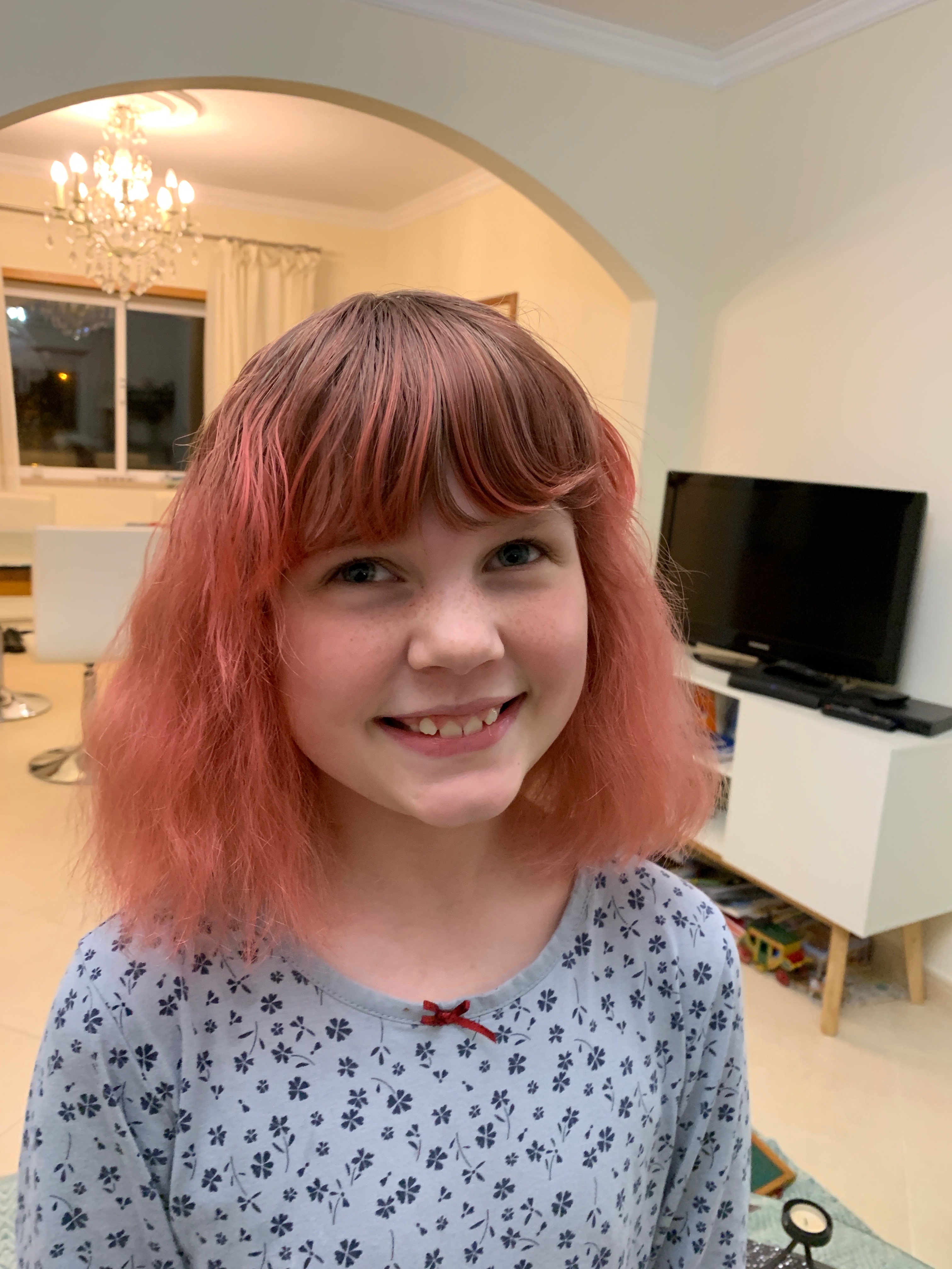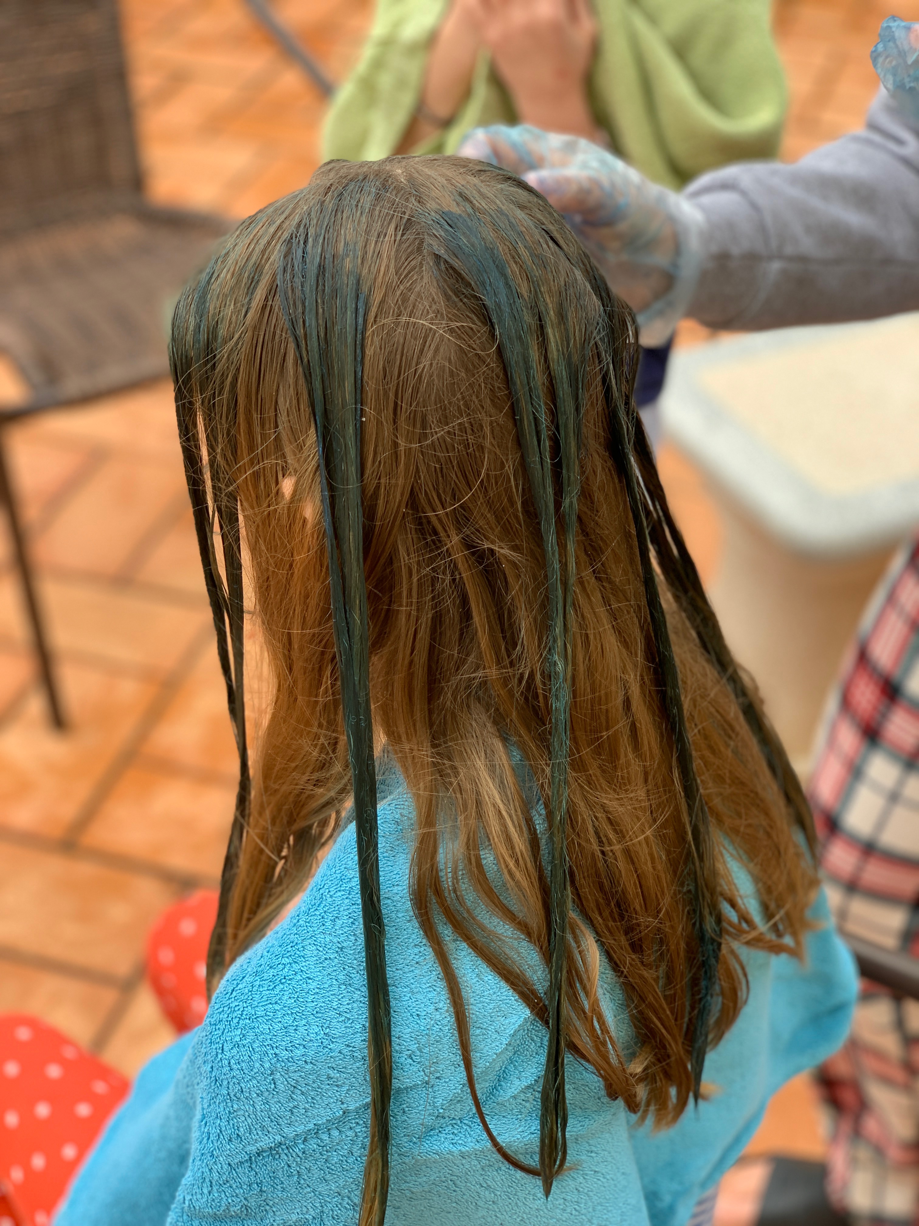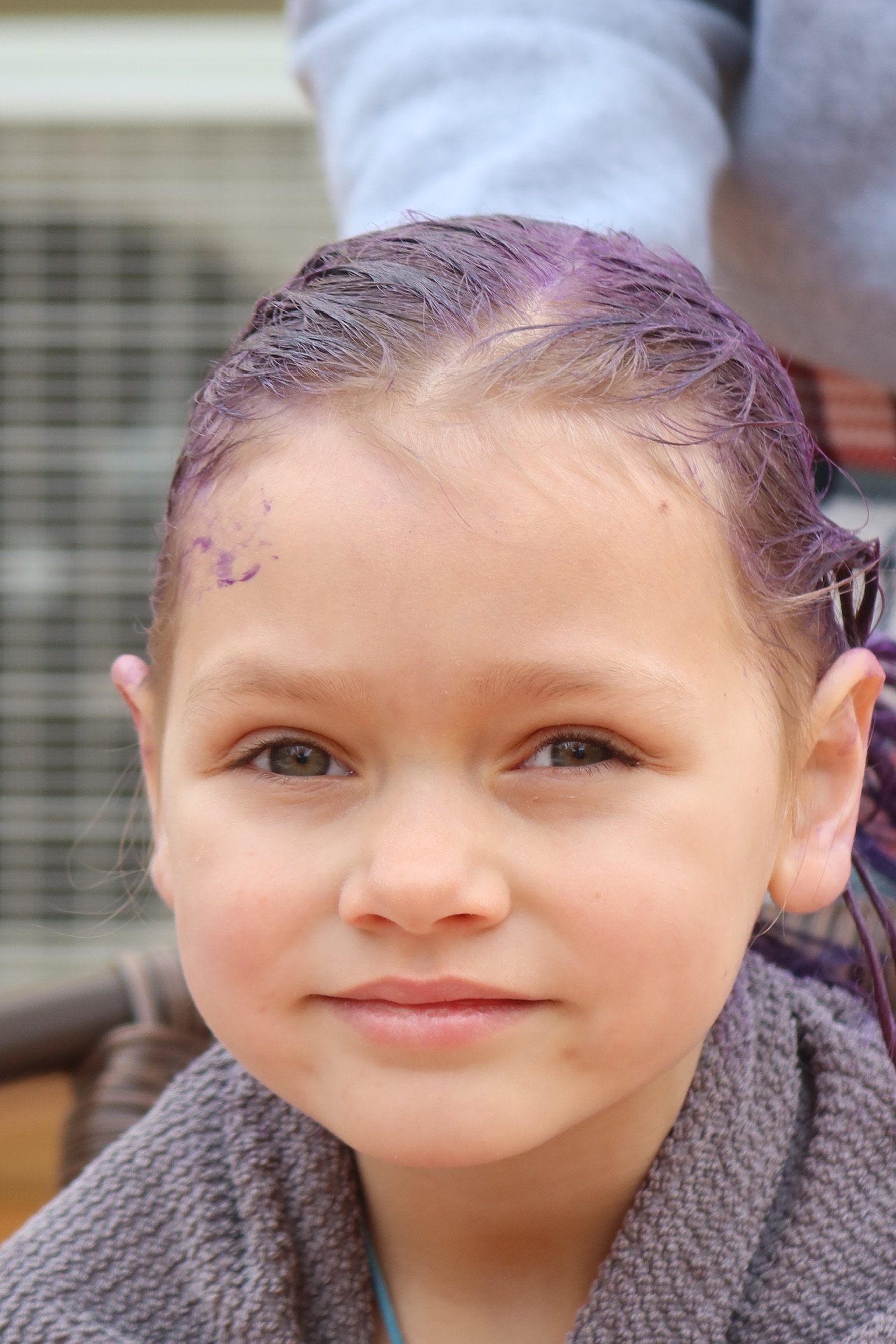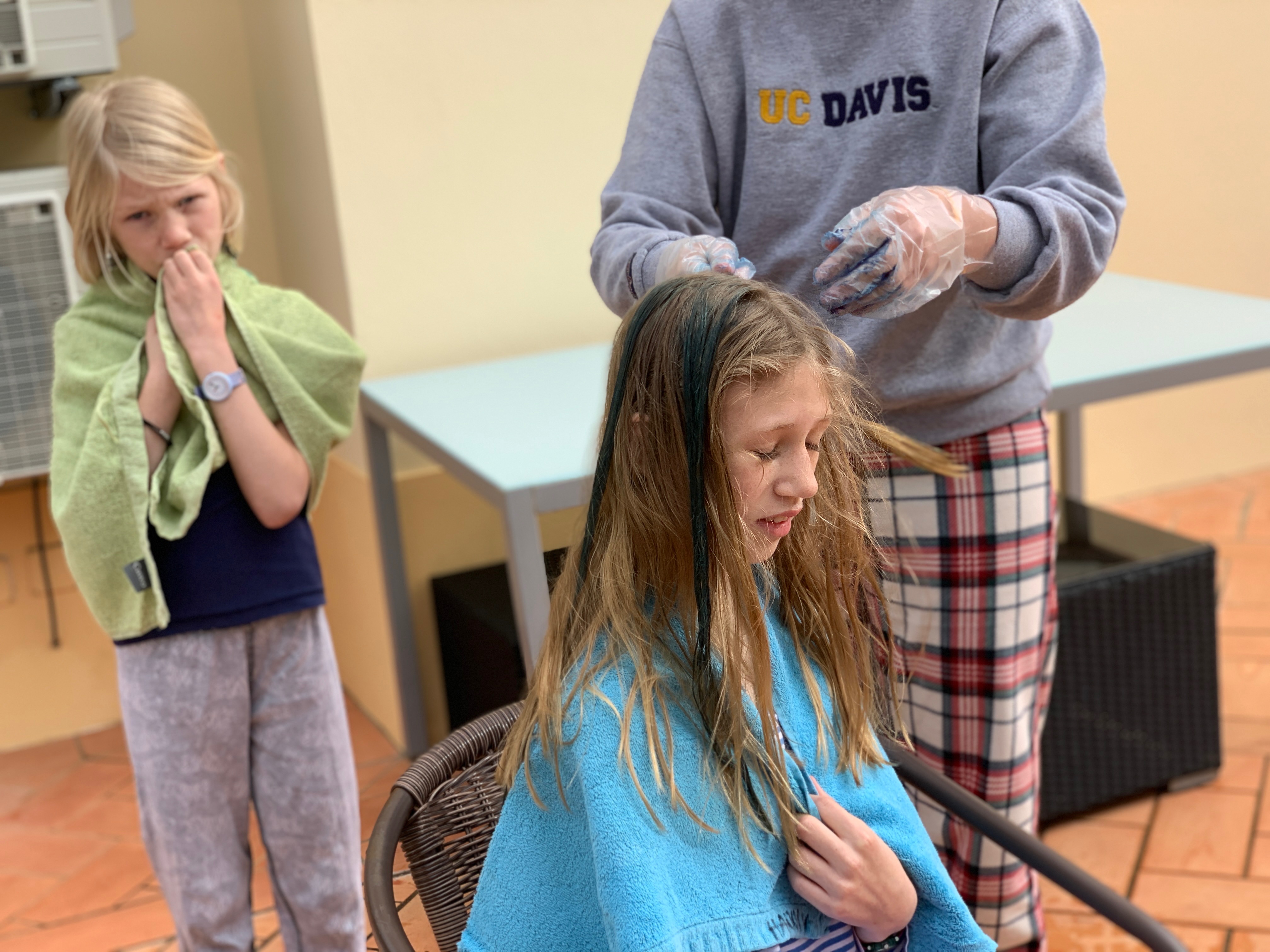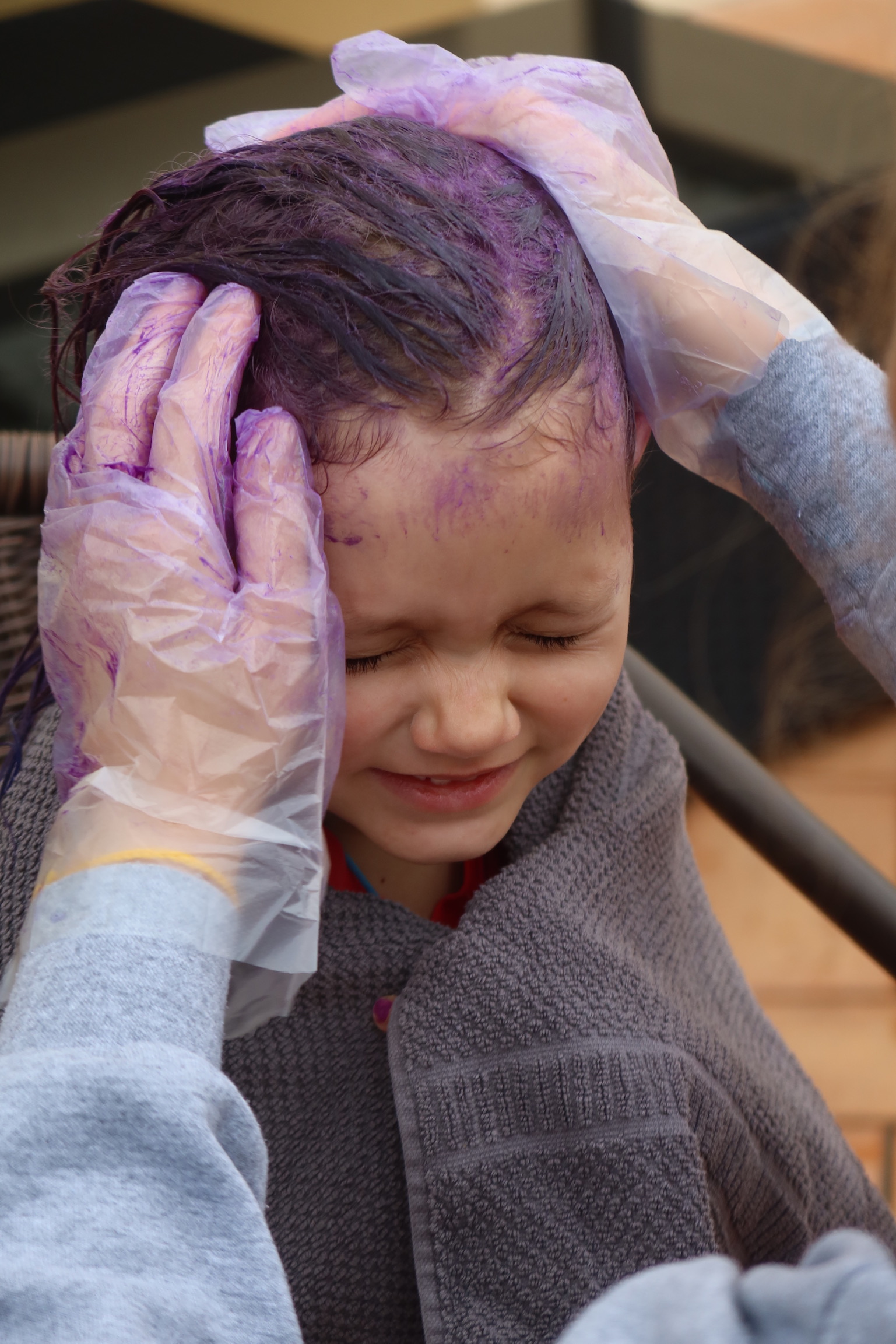 The next highlight was hair dyeing! Olivia had asked if she could dye her hair red so I looked at what I could find at the grocery store and found some fun, washable dye. So one Saturday morning in lockdown, that was our activity. All the girls and Steffen got into the fun (I was the official hairdresser). It’s been about 10 days so everyone’s is fading, but you can still see it.
