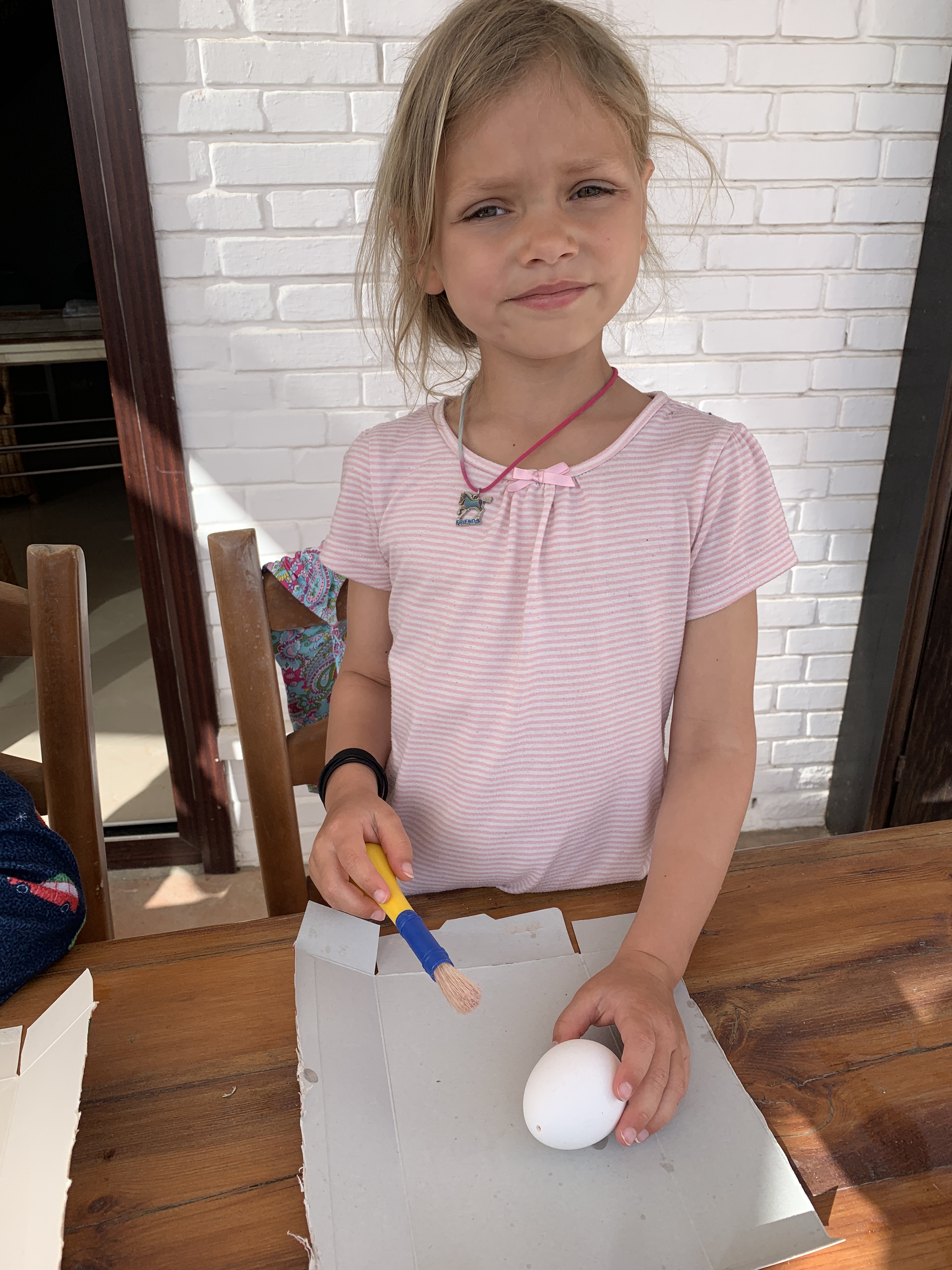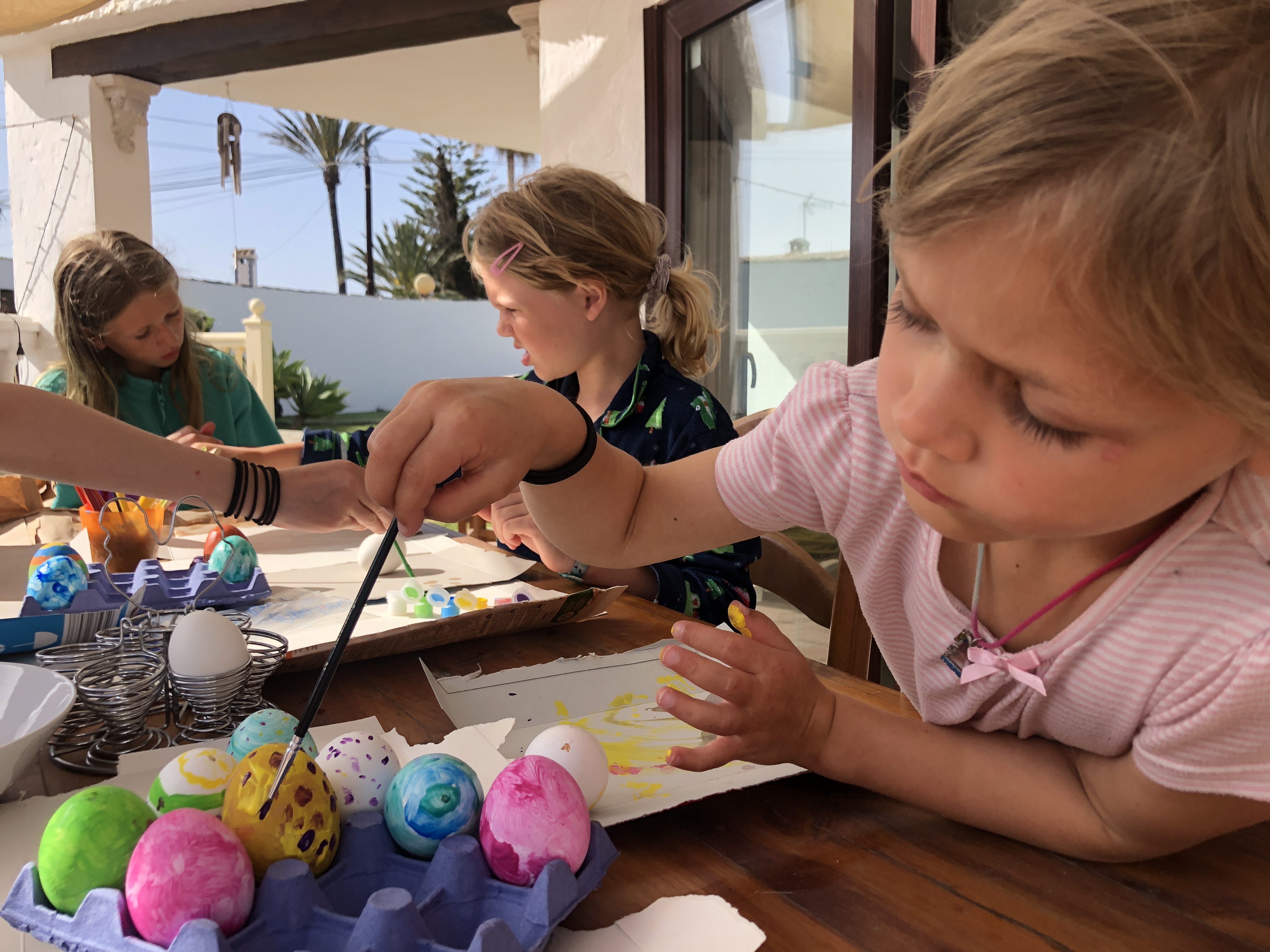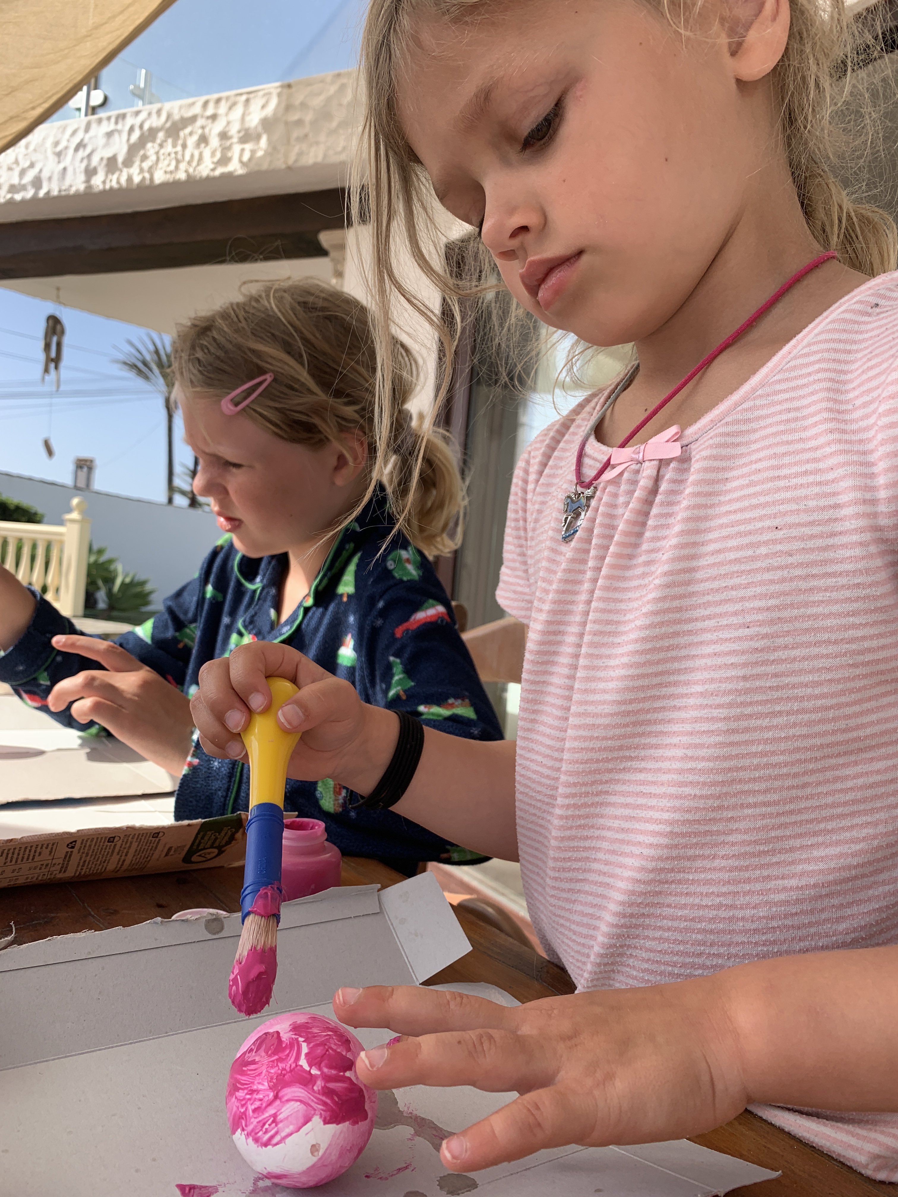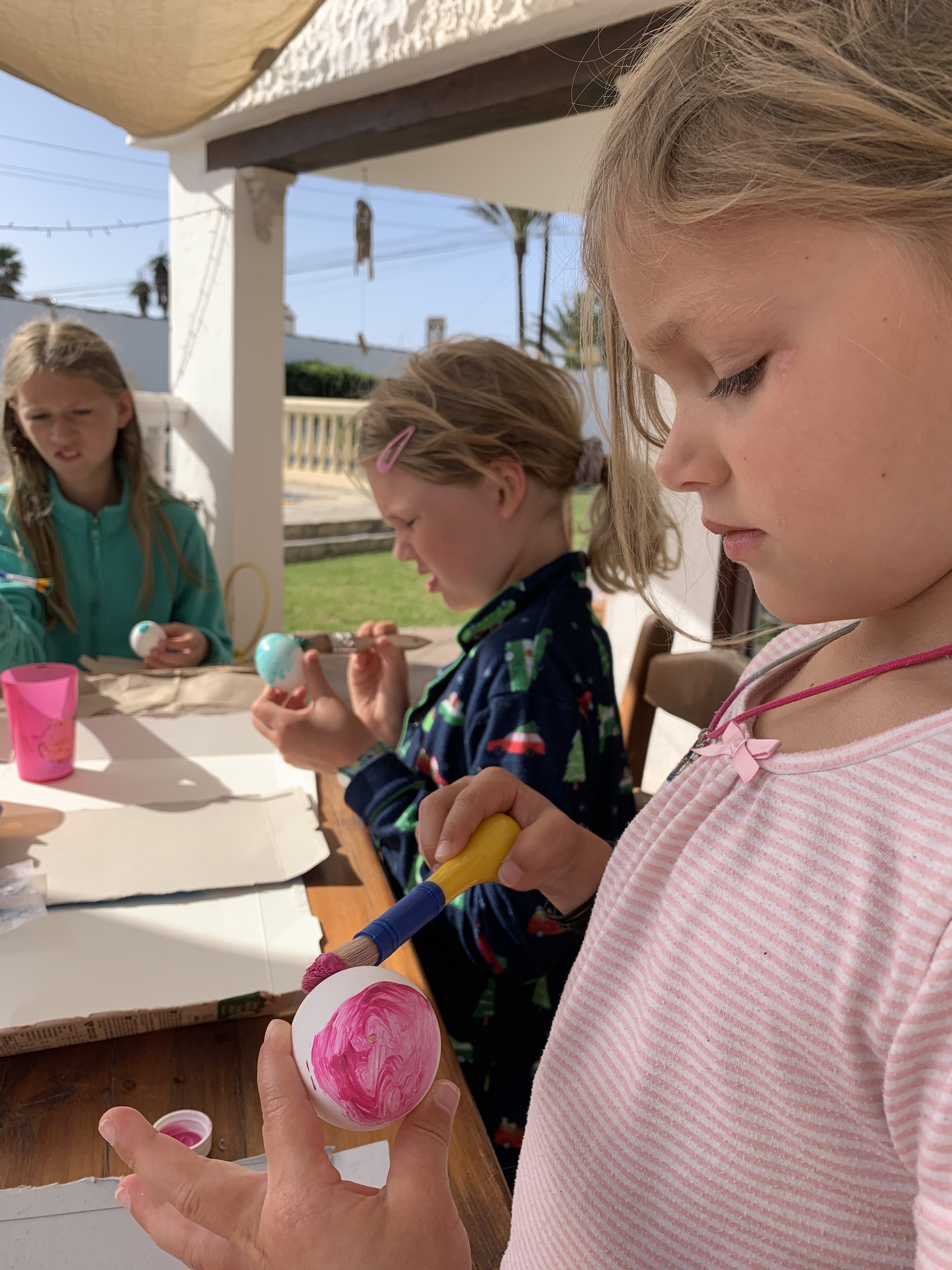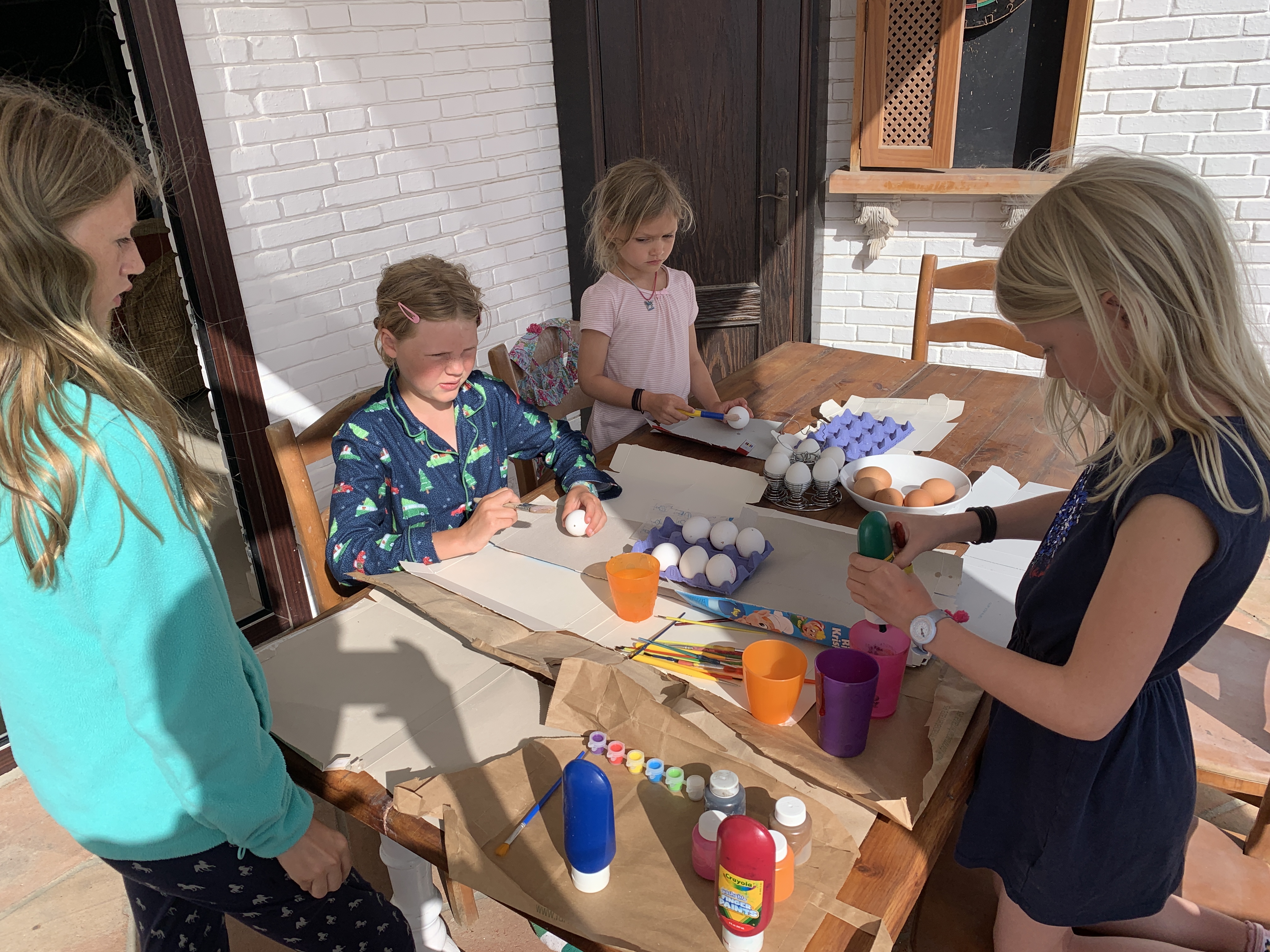 We did our Easter celebration a bit differently this year, as expected, since we didn’t want to bring the girls’ baskets and plastic eggs through all of Europe. We are also trying to cut back on material items and those eggs are often filled with little toys that no one really needs. So the main gift for the girls was a 3-day horse camp they went to during spring break, but we still wanted to celebrate a bit on Sunday, so we told the girls that the Easter bunny would likely come to hide some hard-boiled eggs and blown eggs. On Saturday morning, the girls each painted a few eggs in preparation with some paint that we already had in our arts and crafts box.