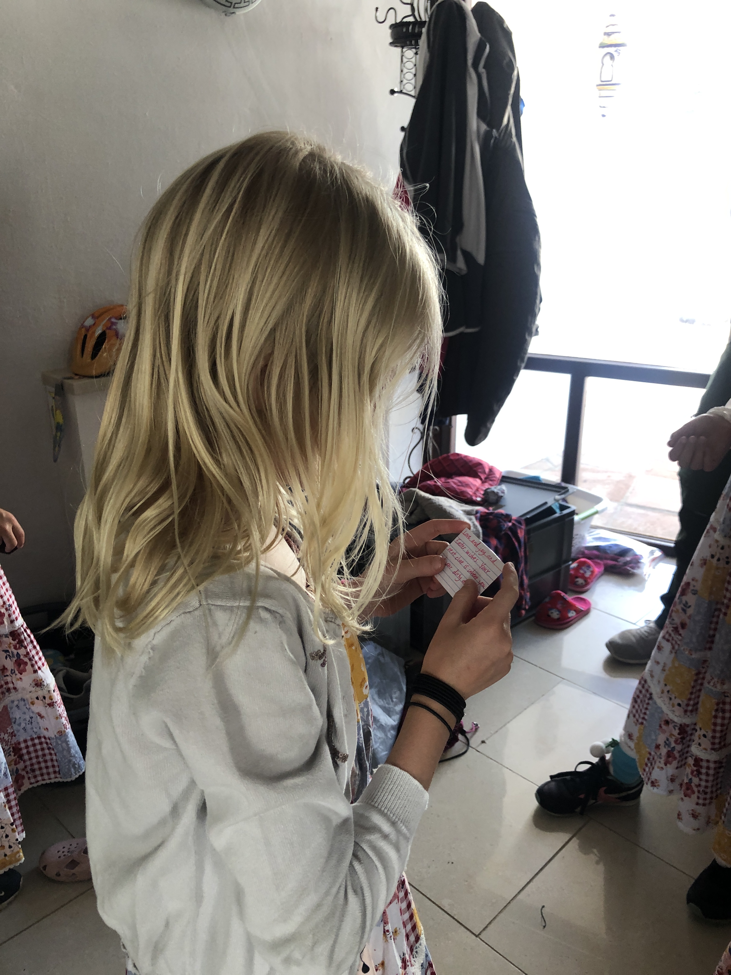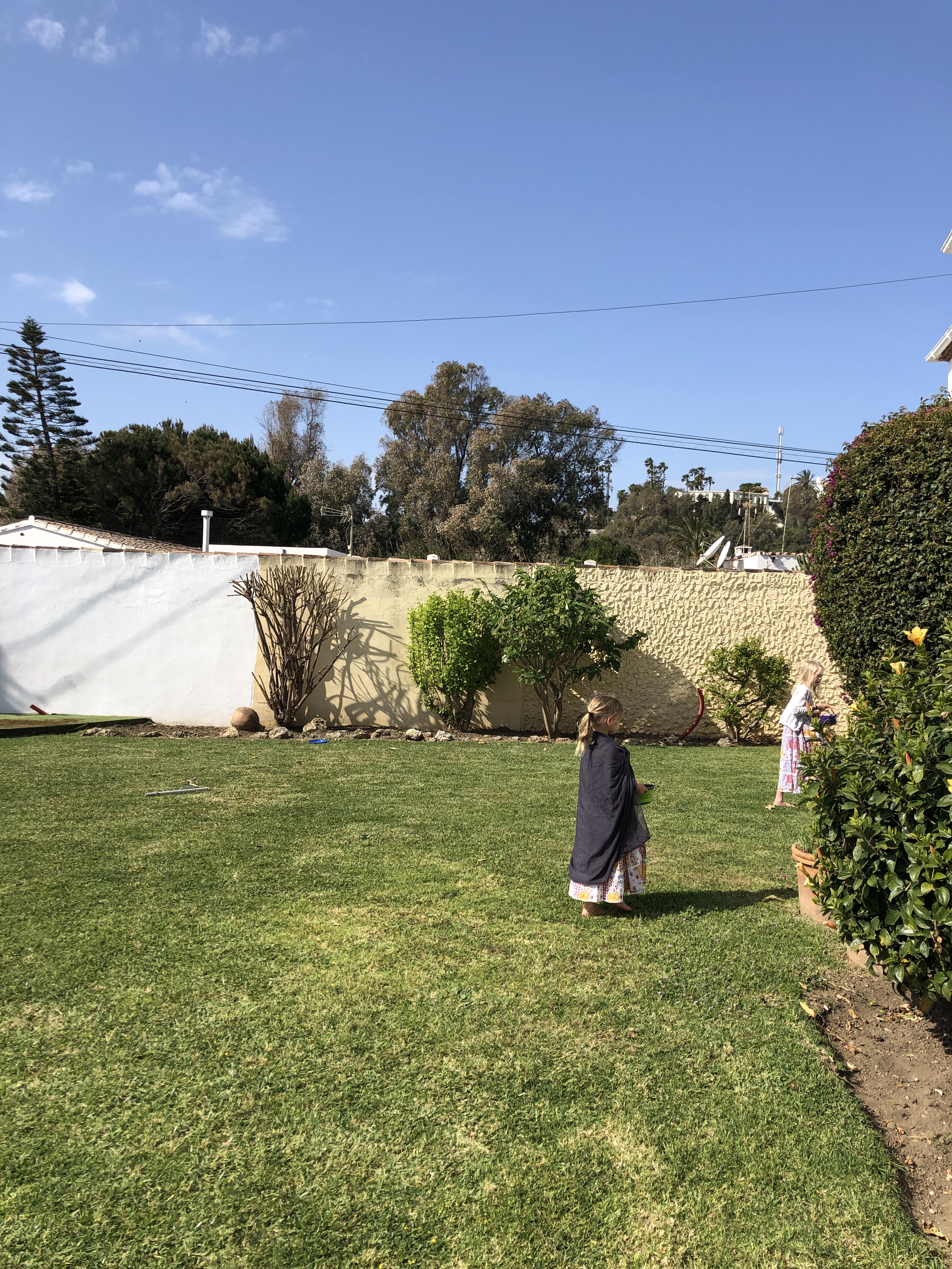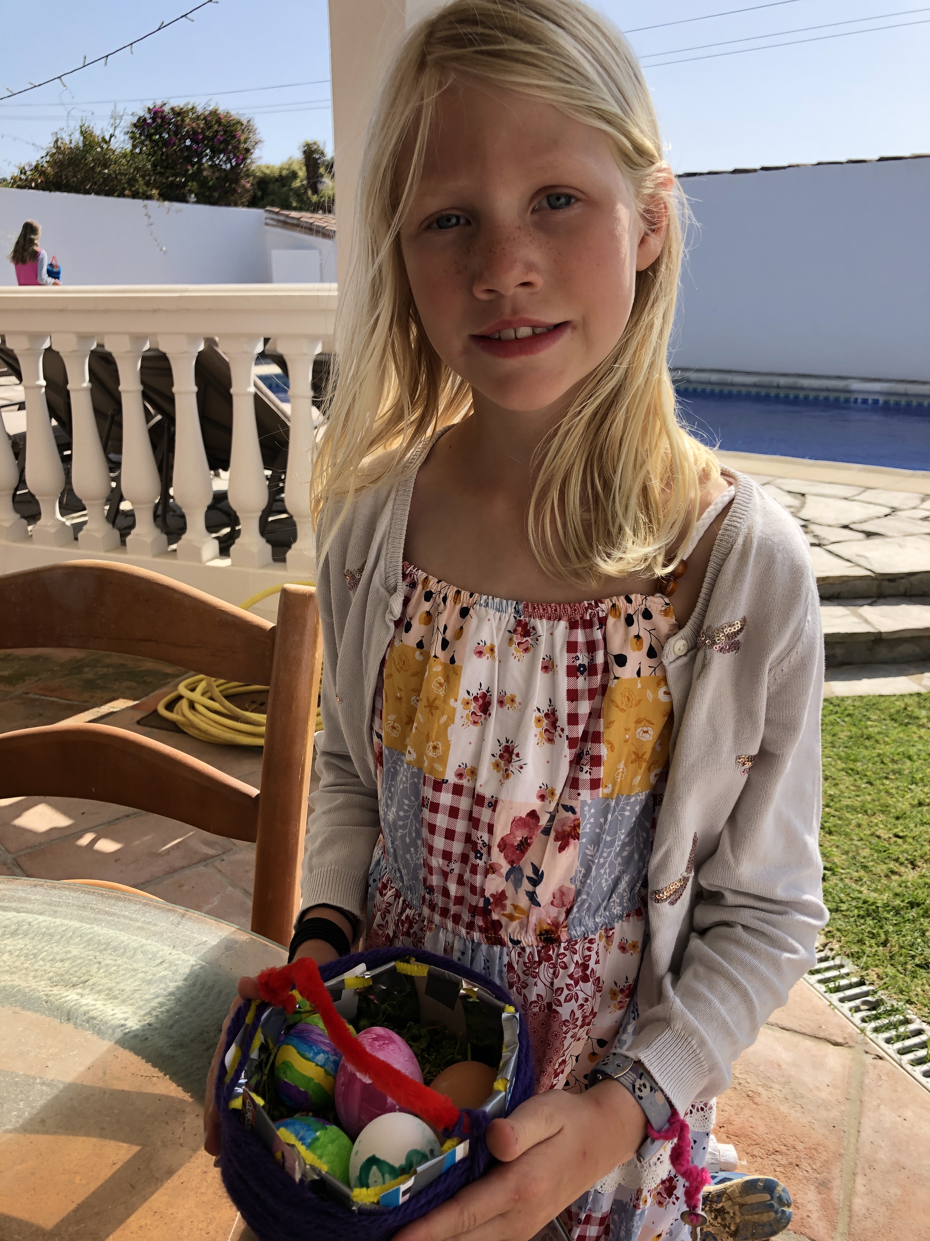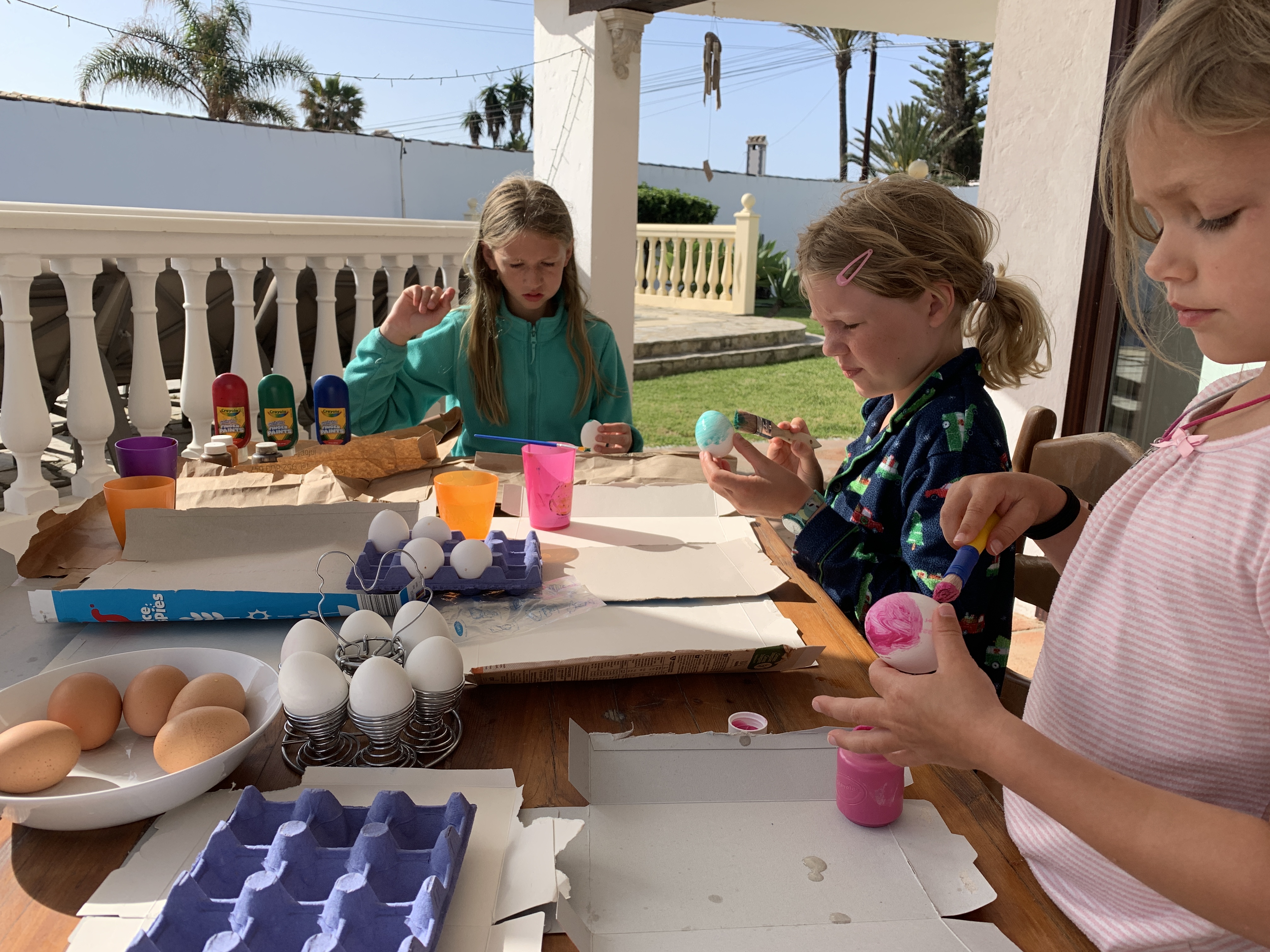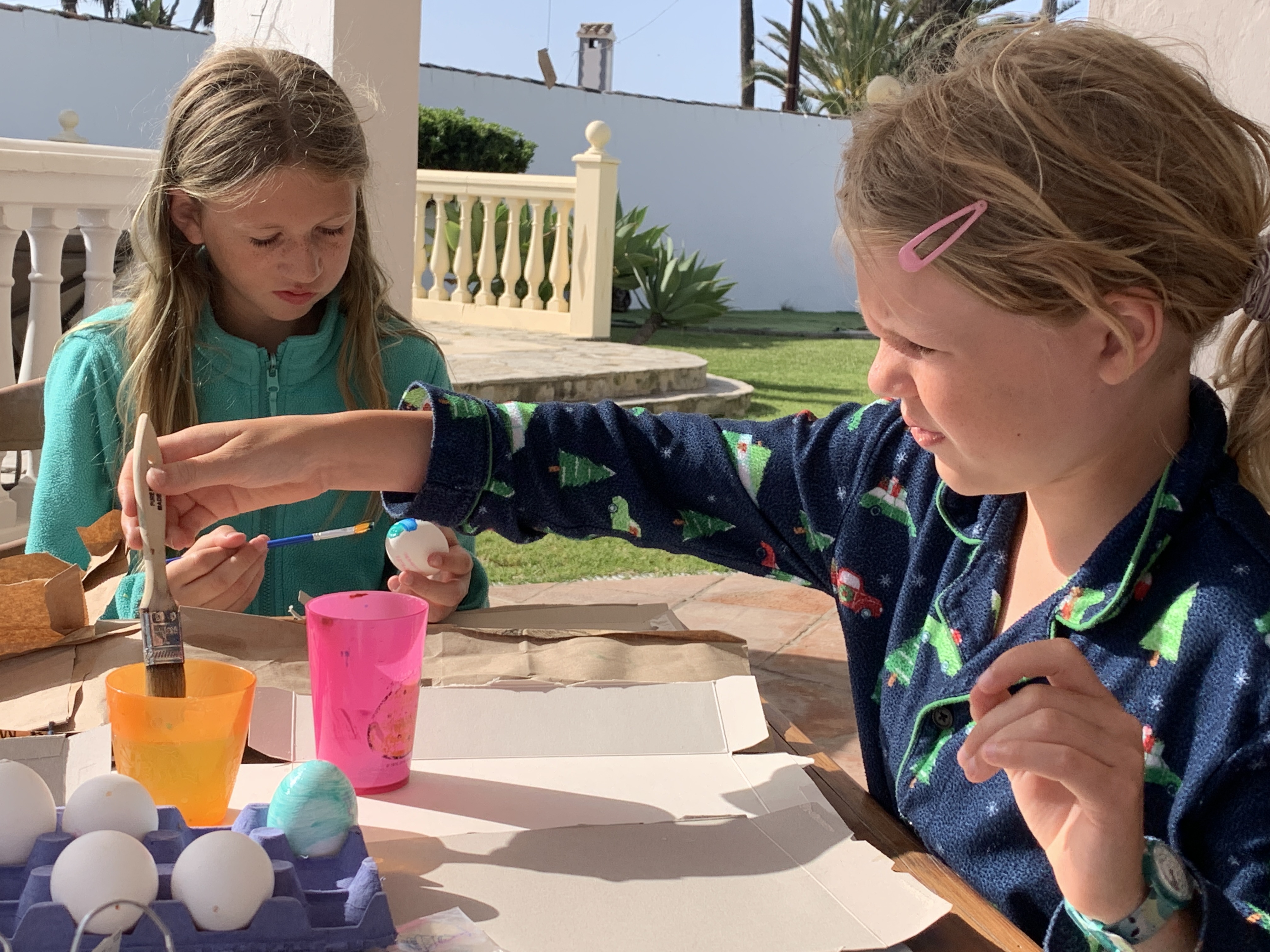 We did our Easter celebration a bit differently this year, as expected, since we didn’t want to bring the girls’ baskets and plastic eggs through all of Europe. We are also trying to cut back on material items and those eggs are often filled with little toys that no one really needs. So the main gift for the girls was a 3-day horse camp they went to during spring break, but we still wanted to celebrate a bit on Sunday, so we told the girls that the Easter bunny would likely come to hide some hard-boiled eggs and blown eggs. On Saturday morning, the girls each painted a few eggs in preparation with some paint that we already had in our arts and crafts box.