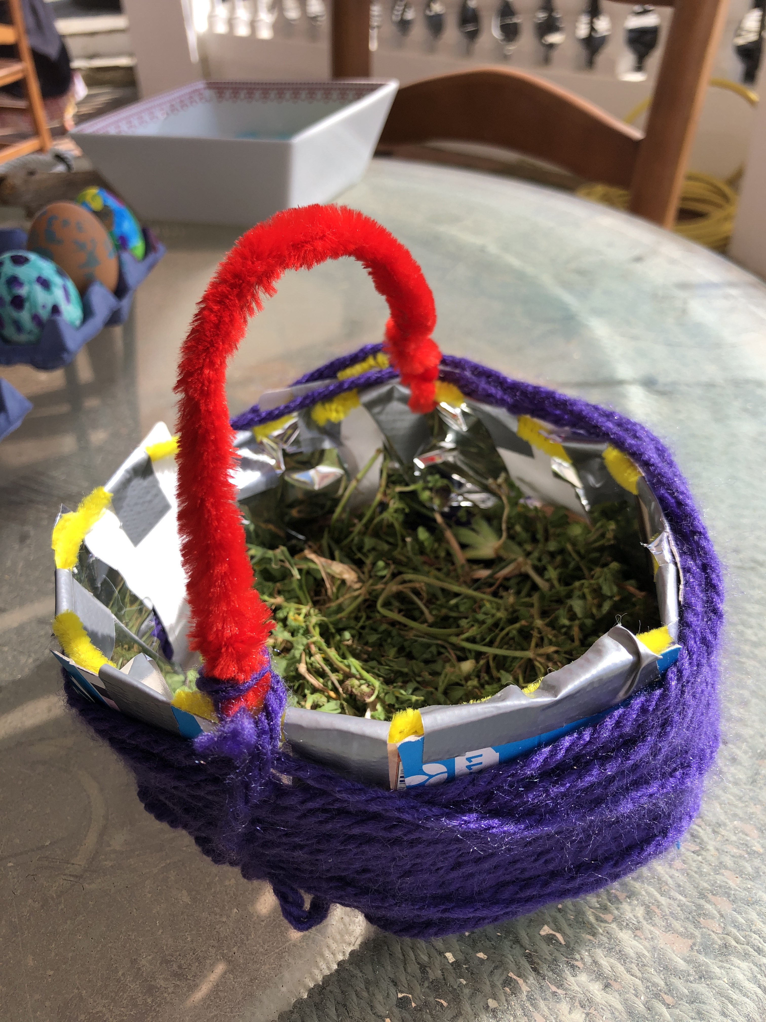 Steffen stayed behind to wait for the Easter bunny, but he never came by! Then, right as we were at the corner by the house, Steffen spotted him hopping away! Very exciting. First, the girls searched the yard for the colored eggs. Hannah and Olivia had made their own baskets through recycled materials, and Luisa and Charlotte used some items from around the house. Love the creativity!