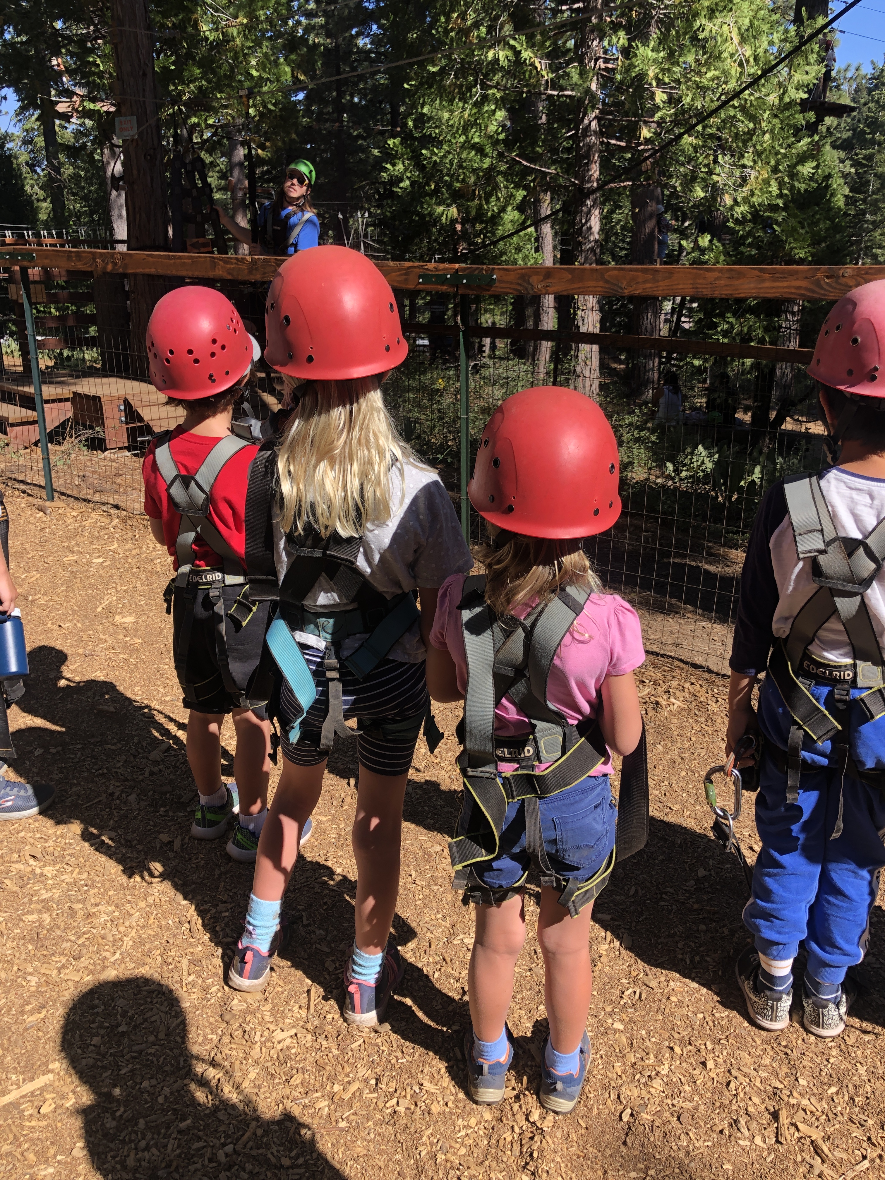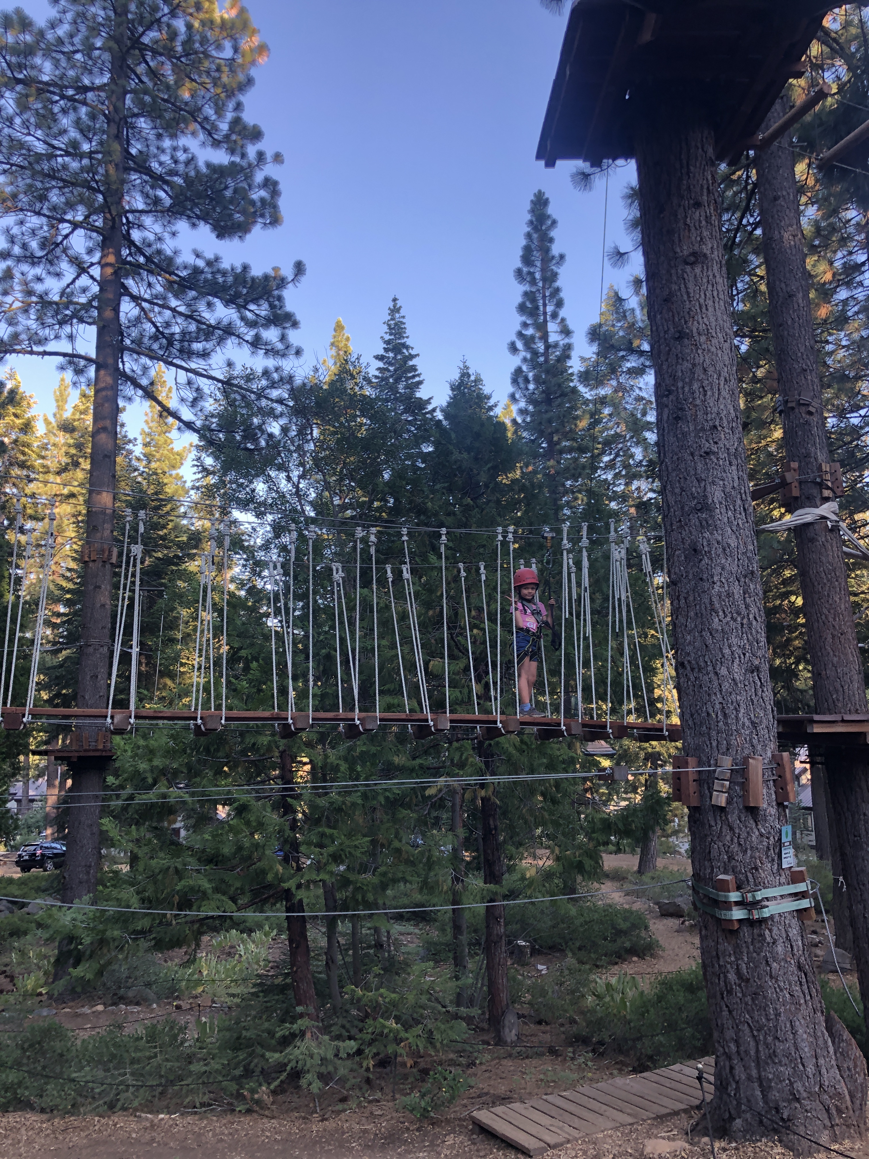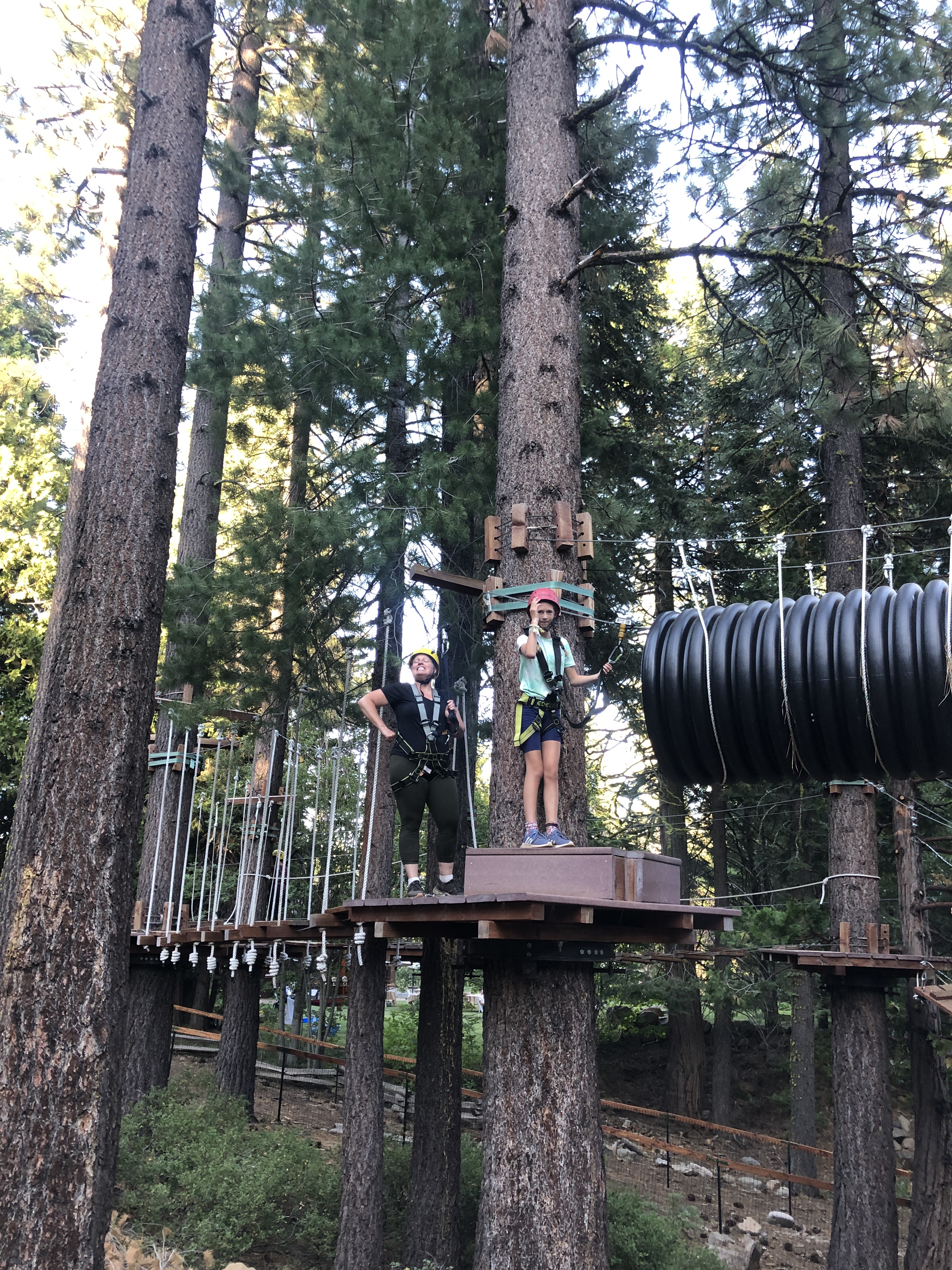 We spent our last few days in Tahoe with my college friend and her daughter (who we had also met up with in Sacramento a few weeks earlier) to squeeze in some more quality time together. We swam in the pool, spent an afternoon at the beach, my friend and Luisa set up an amazing treasure hunt through the forest and we ended the trip with a super fun day at the Tahoe Treetop Adventure Park ropes course. We all love those places! And I’m always impressed with the girls’ bravery and athleticism.