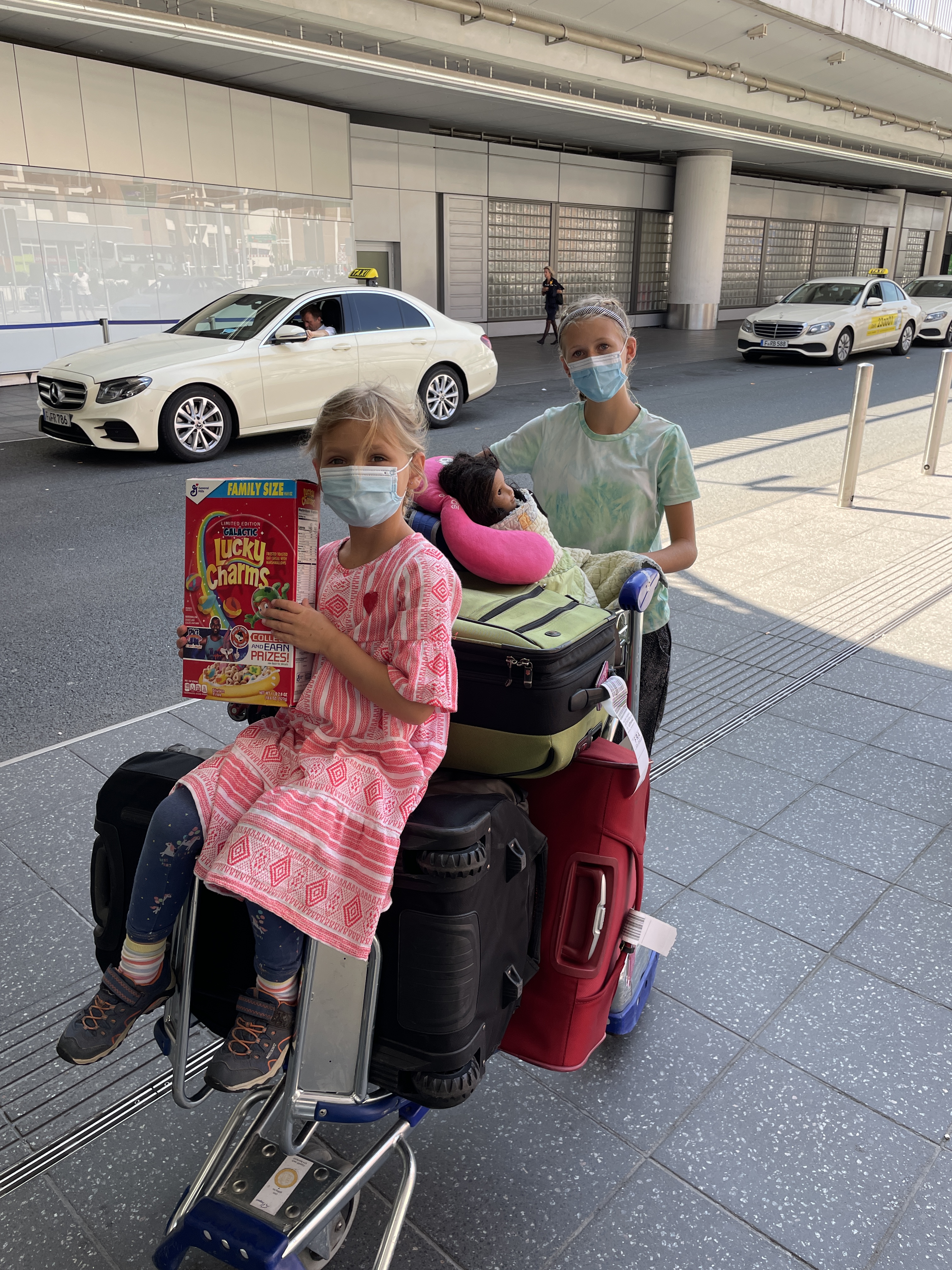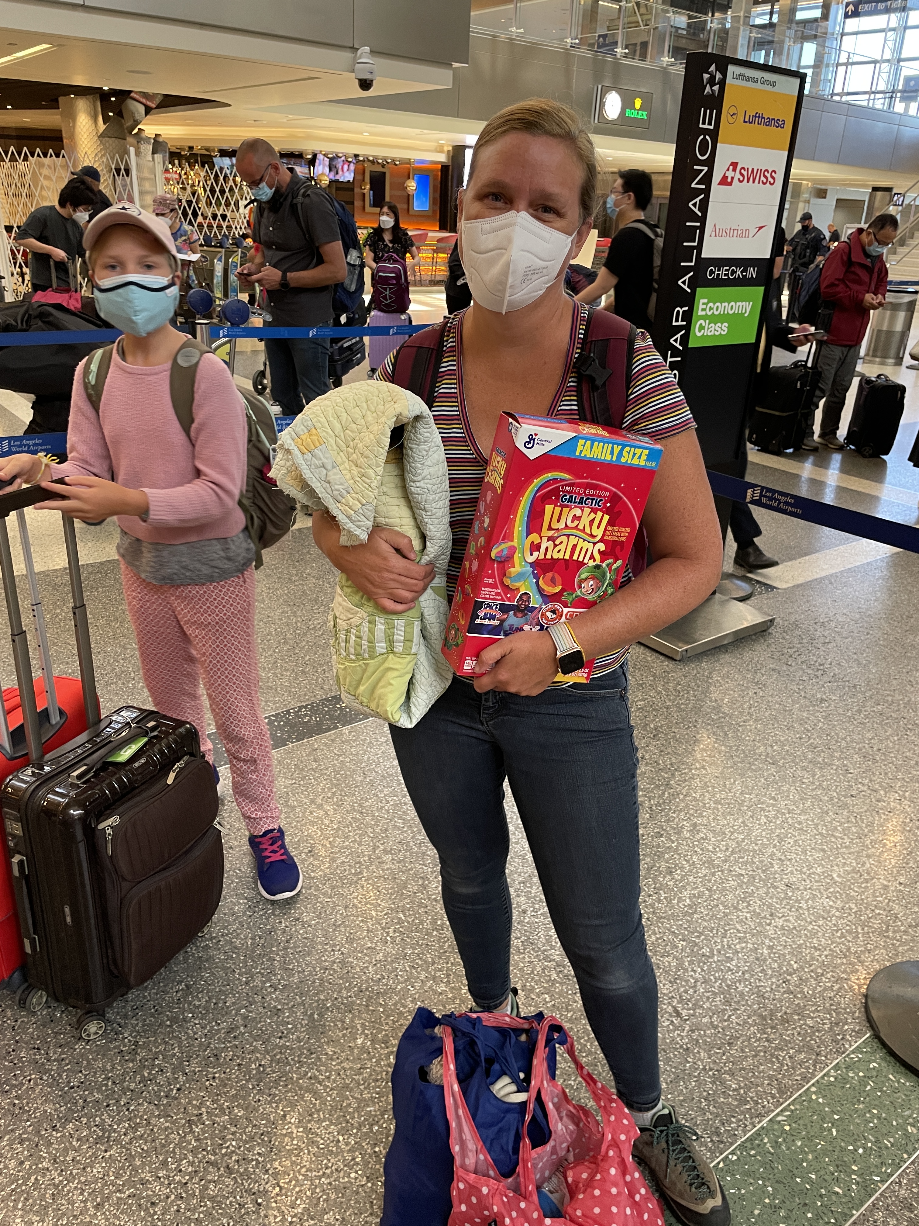 Then it was time to head to the airport (with one last early morning hair dressing session). Everything went smoothly, and we made sure those precious Lucky Charms made it on the plane!