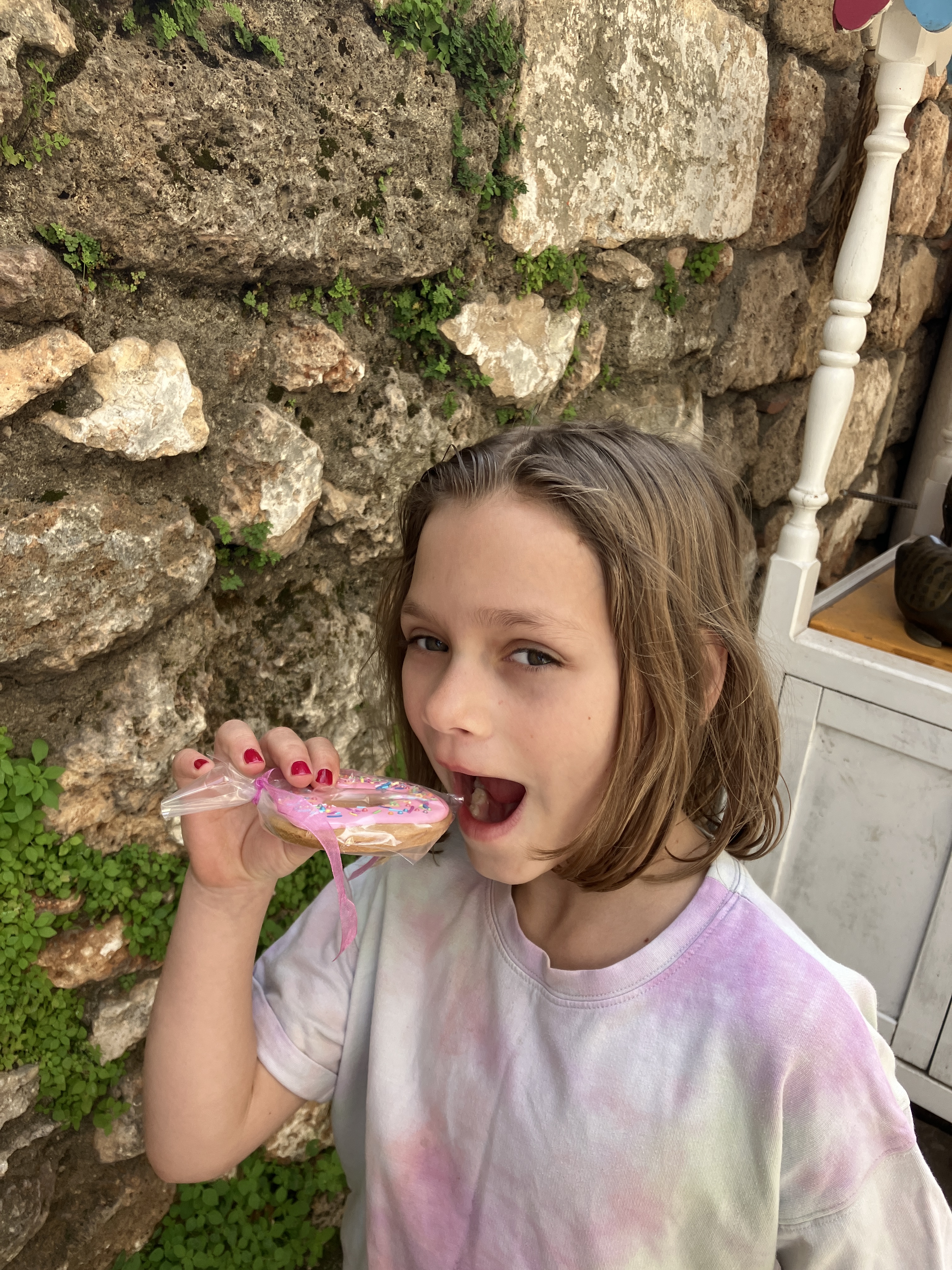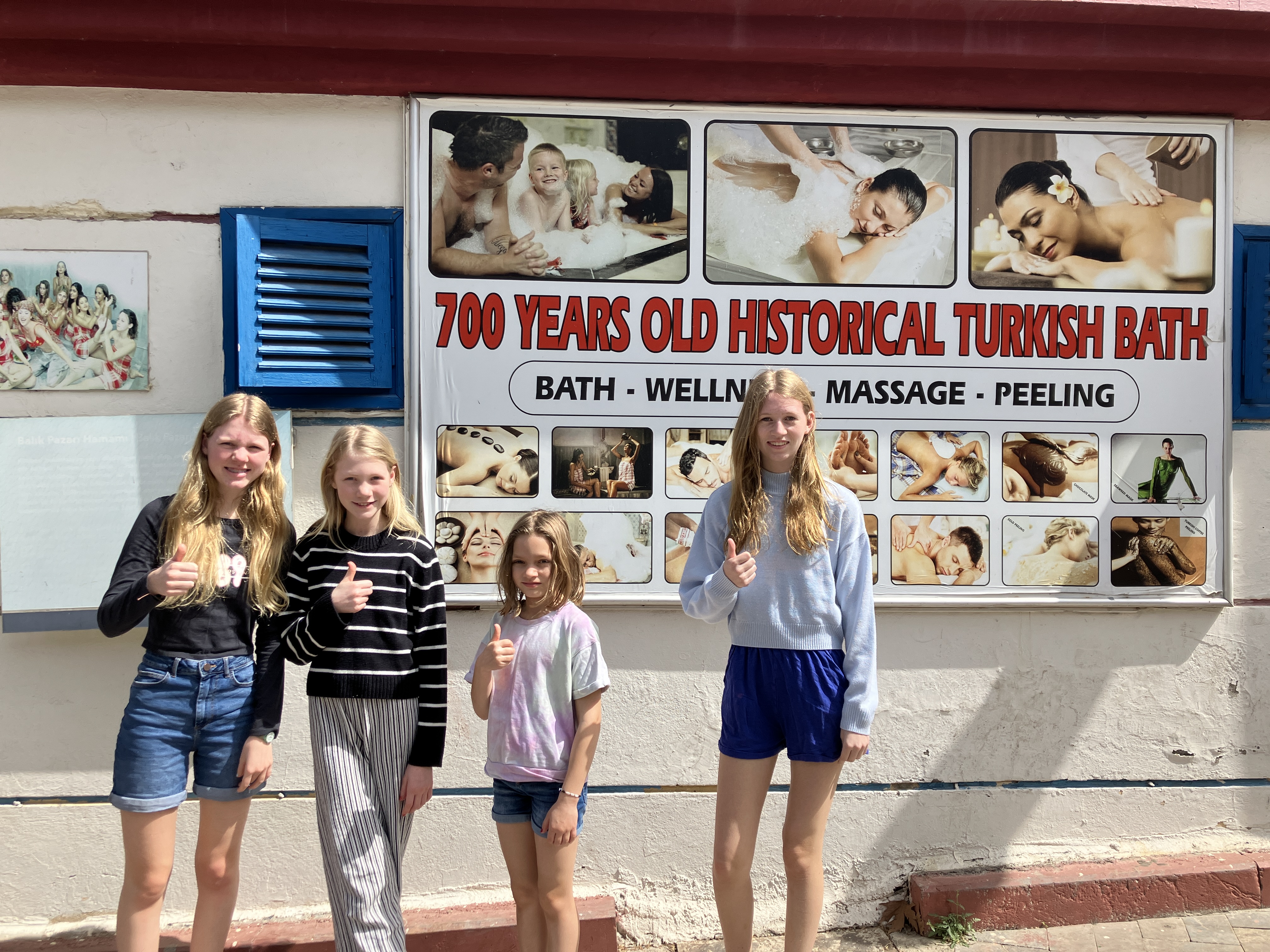 Something Steffen and I very much wanted to experience in Turkey was a traditional Turkish bath (Hammam) so we found this one in the old town. We went over to make an appointment, and they let us know that the kids could get massages as well. So we signed the whole family up! Steffen and I got the whole program– Turkish bath, foam massage and then a 1 hour medical and hot stone massage which was all fantastic and such a cool experience! The girls had mixed reactions to their massages. 🙂 But Steffen and loved it so much, we immediately made appointments for later in the week. The rest of the day we spent exploring town, enjoying their favorite cookies and having a delicious meal at Luna Garden, a place we loved so much we visited a few times during our stay.