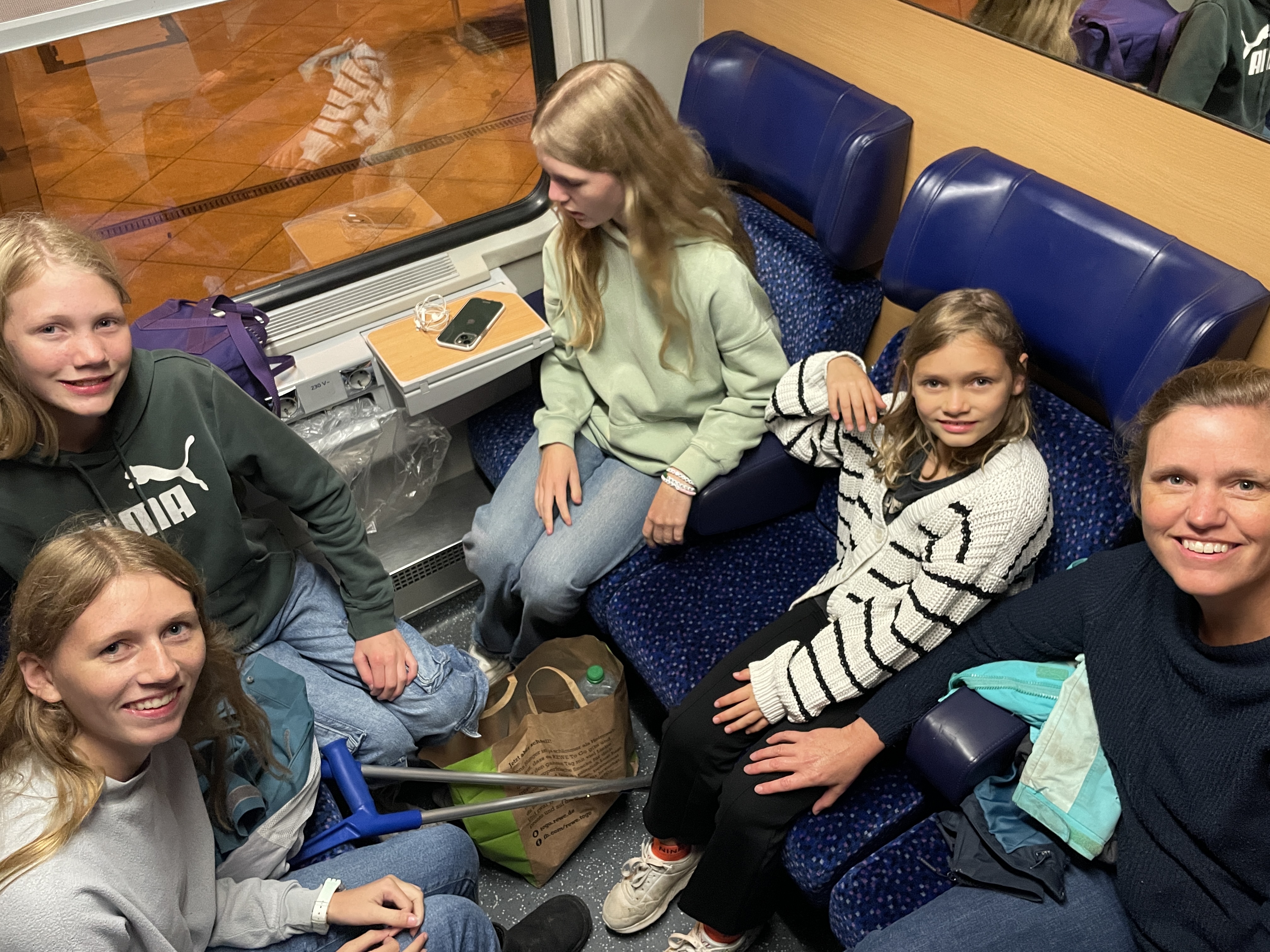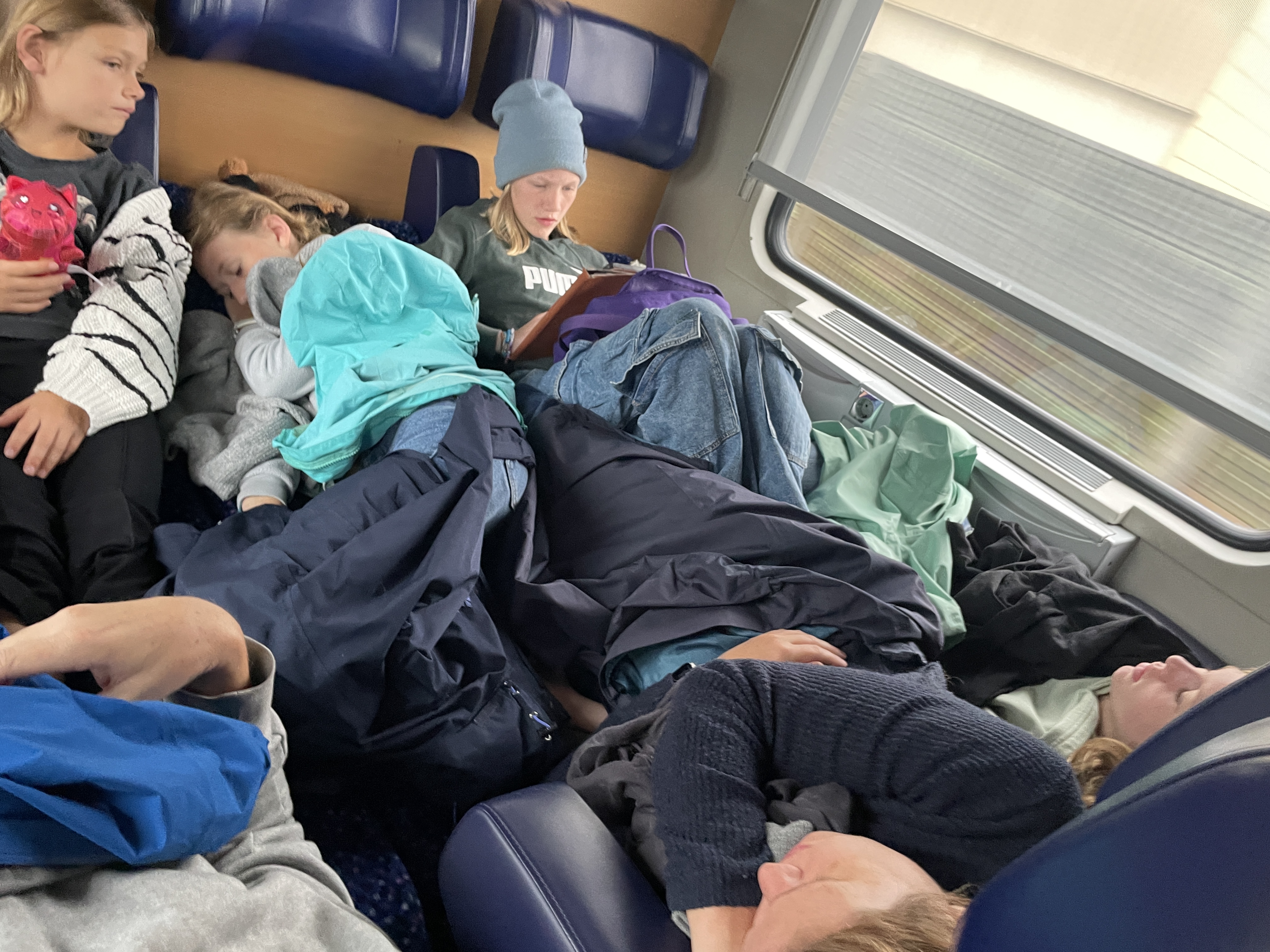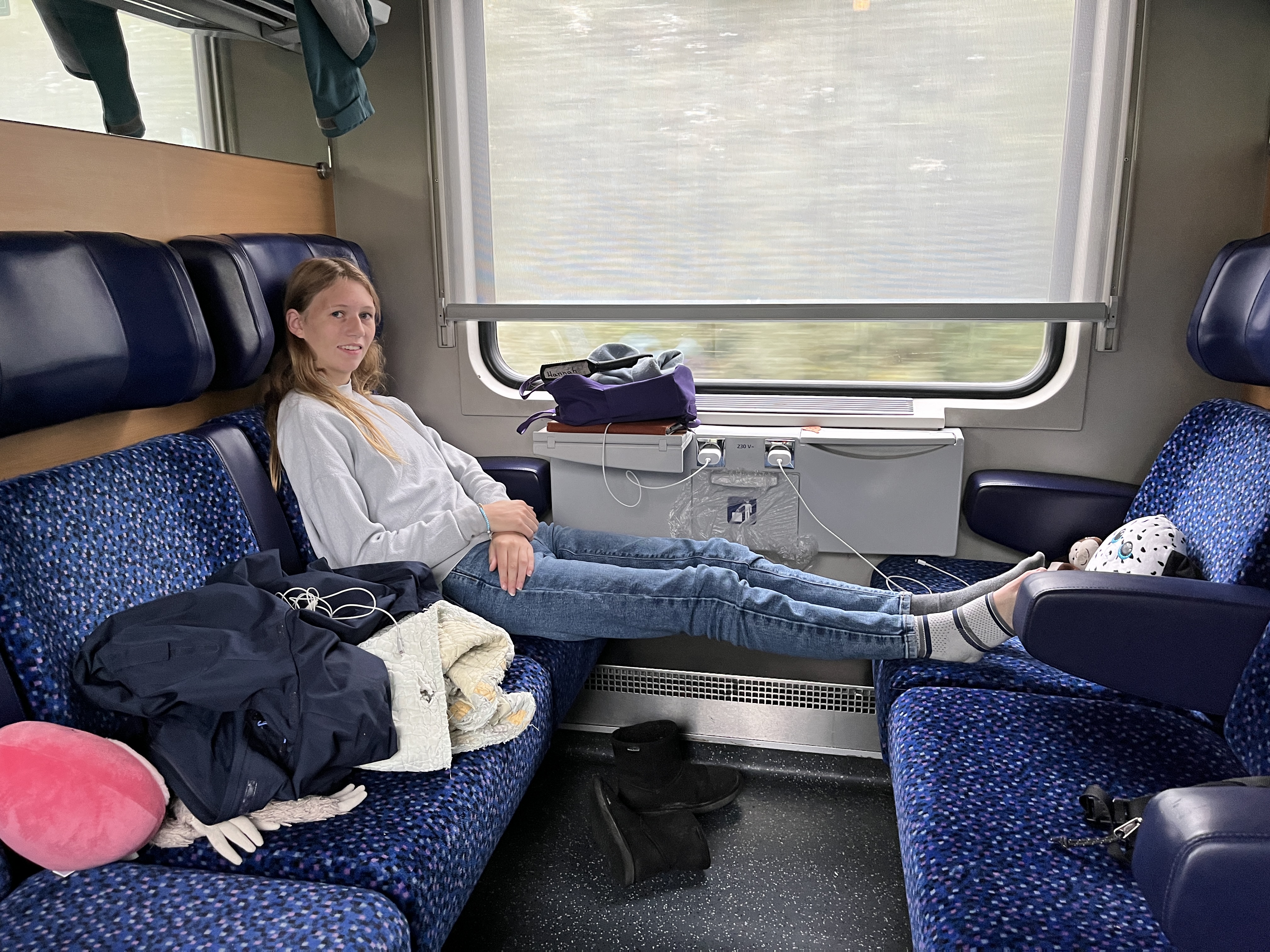 In early October 2024 we did something new (that I’m not sure we will repeat)–took the sleeper train! Unfortunately we didn’t book early enough, so on the way there we didn’t have a true sleeper car but rather a “Roomette” which was a private compartment that had six seats that convert into beds (though just three beds because it requires two seats to slide together) for overnight travel. So it was a tight fit! We also didn’t get blankets or pillows so it was quite uncomfortable. But we made it. On the way back, we had the six bunk bed configuration which was a bit more comfortable but still not great.