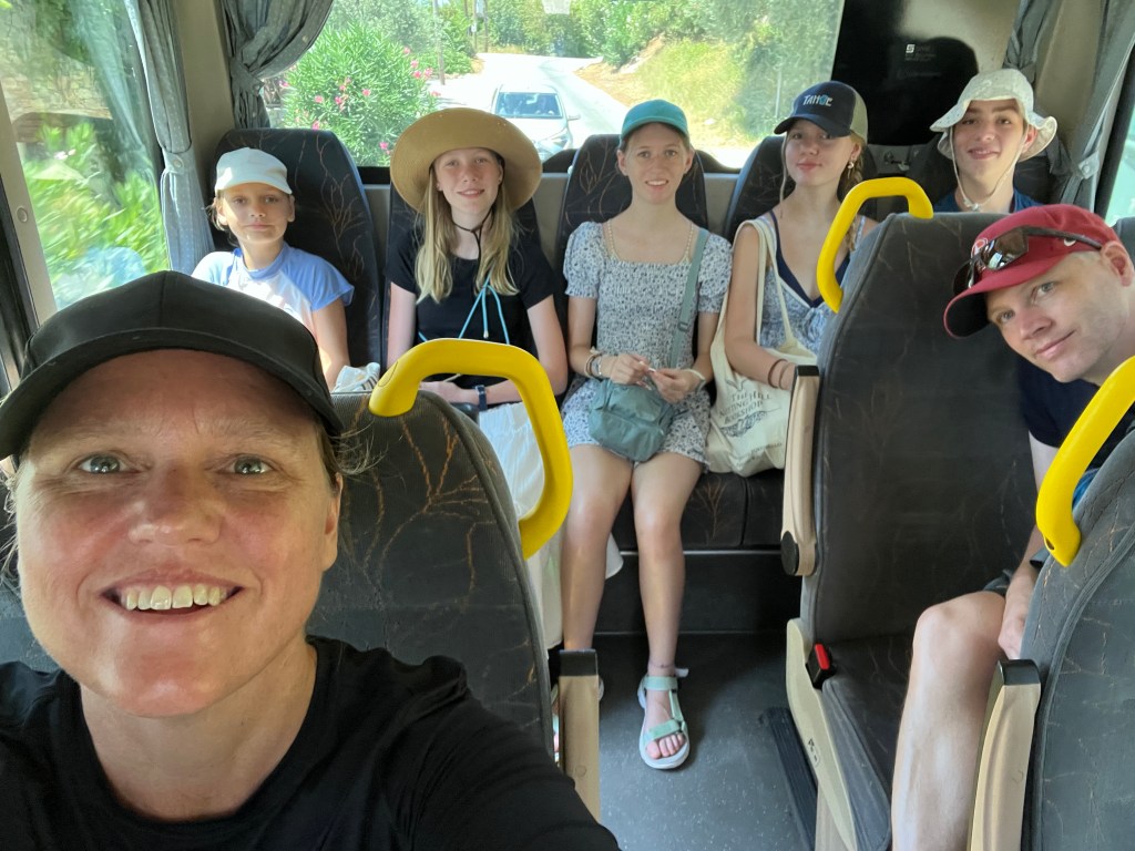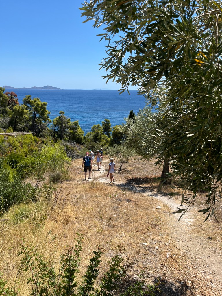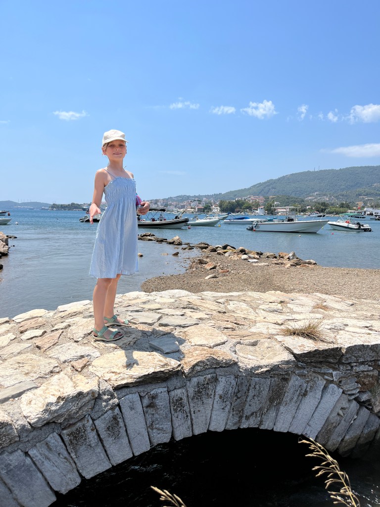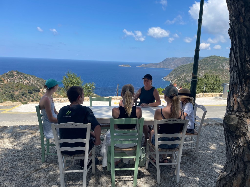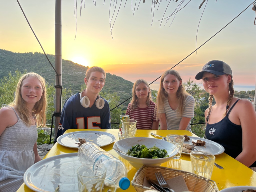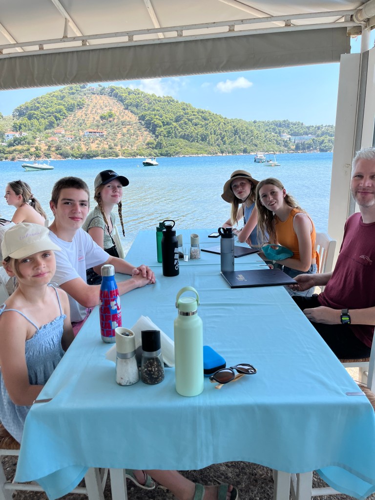 When we go out to eat, we try to have meals that focus more on the local cuisine (though you can also often find us at a pizza place as well), so we’ve had some terrific meals of moussaka, souvlaki and Greek salad. There is a small bakery in the village where we are staying that had some tasty treats that are budget friendly, especially when you buy one or two and cut it up so everyone can have a taste. And we have enjoyed some fabulous views at the restaurants we’ve visited so far!