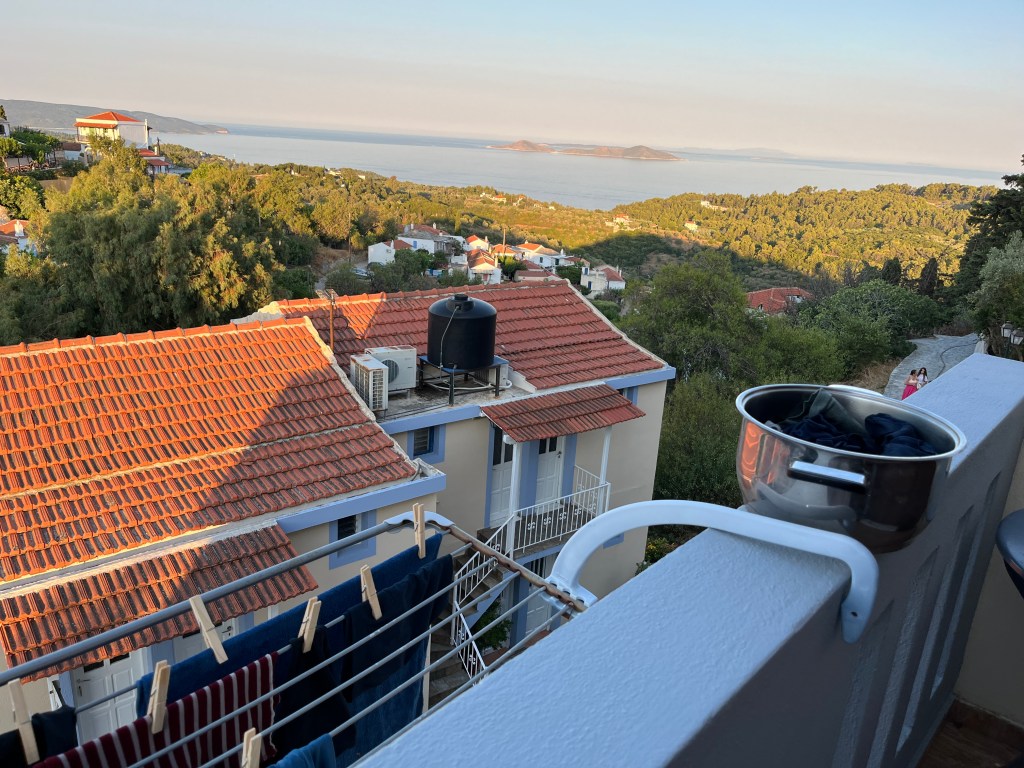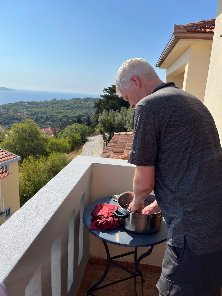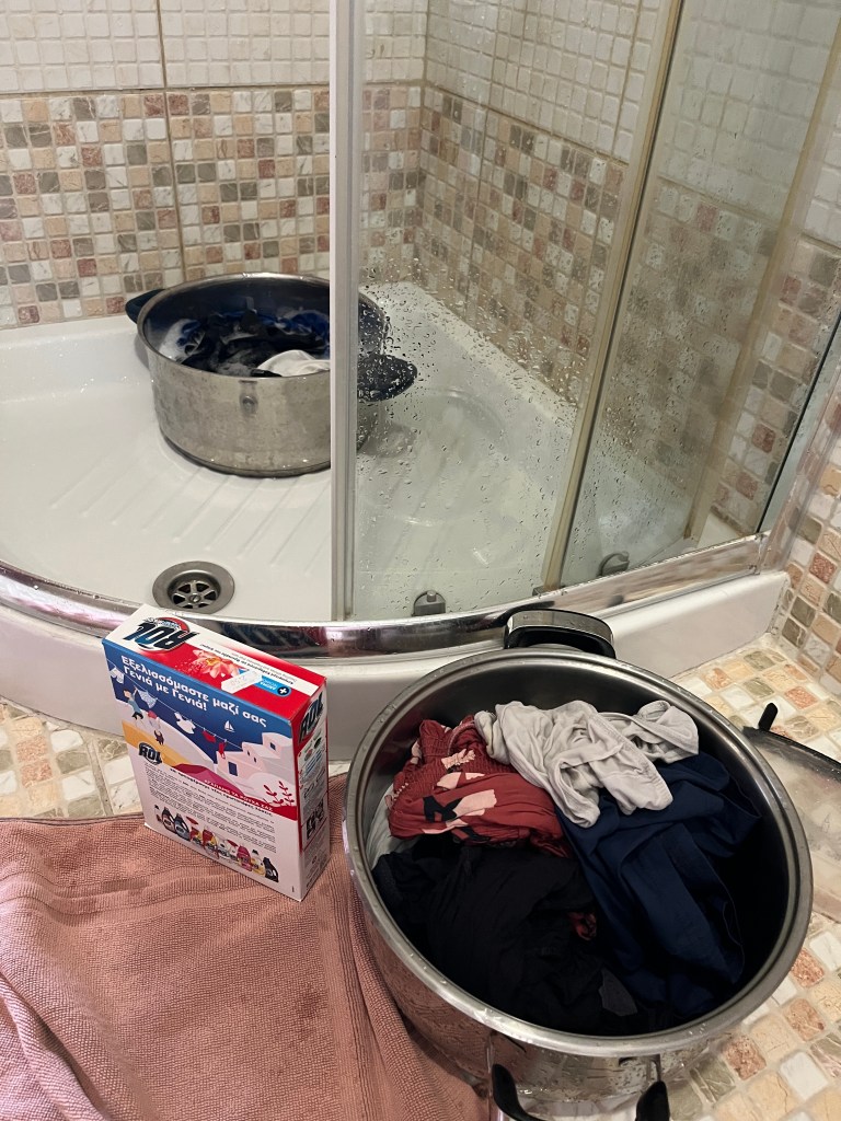 When we sold our house last month, we also sold our car, washing machine, dishwasher, and packed up our fully equipped kitchen with knives, vegetable peelers, pots, pans and cutting boards. And we miss those things every day. 🙂 Since we are planning on traveling for 12 months continuously, we are on a budget. That means we try to shop at grocery stores and cook at “home” when possible, take the bus or walk instead of renting a car or taking a taxi everywhere, and sometimes find ourselves washing the clothes in two pots in the shower. Which is what happened this week once we realised that our accommodation had no washing machine and there was no laundromat on the island. After asking some locals, we found out that for €20-25/load a hotel would wash/dry/iron everything. Which, when adding in the cost of the taxi to/from the hotel which would have doubled the price per load, was out of our comfort zone. So for €4.50 we picked up some detergent and clothespins at the local mini-mart and got to work.