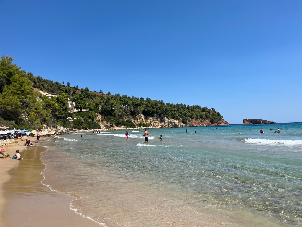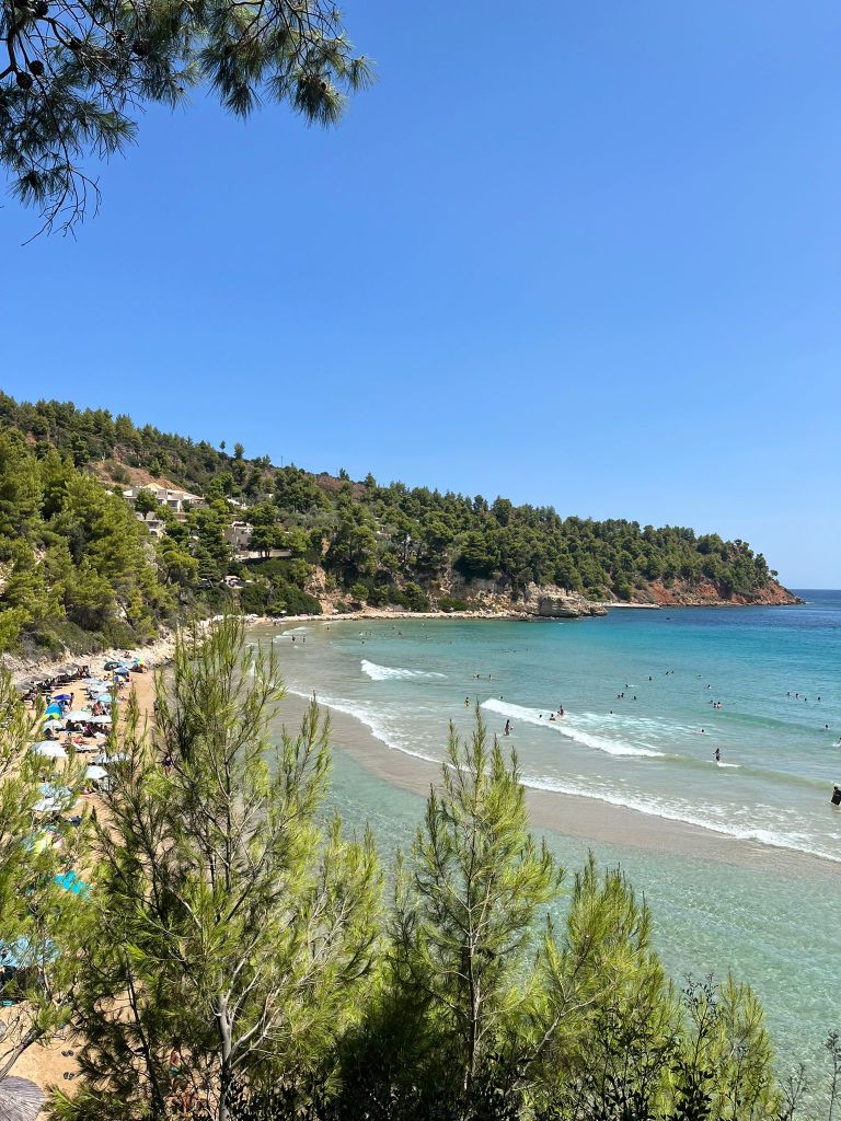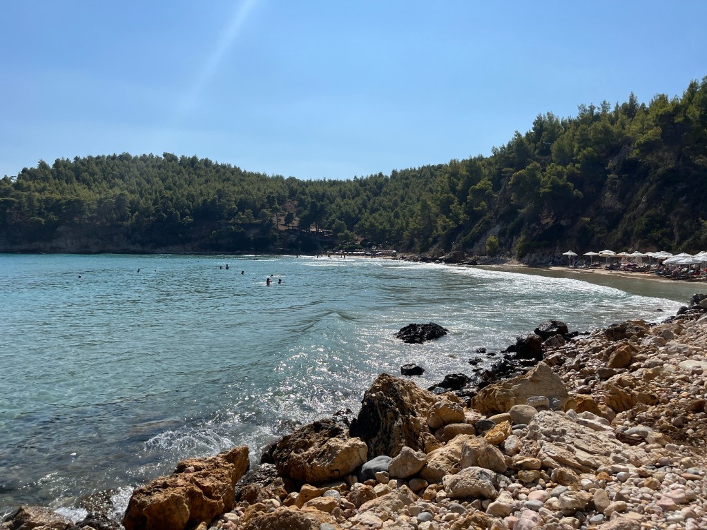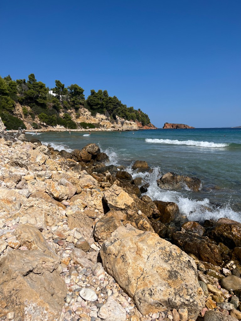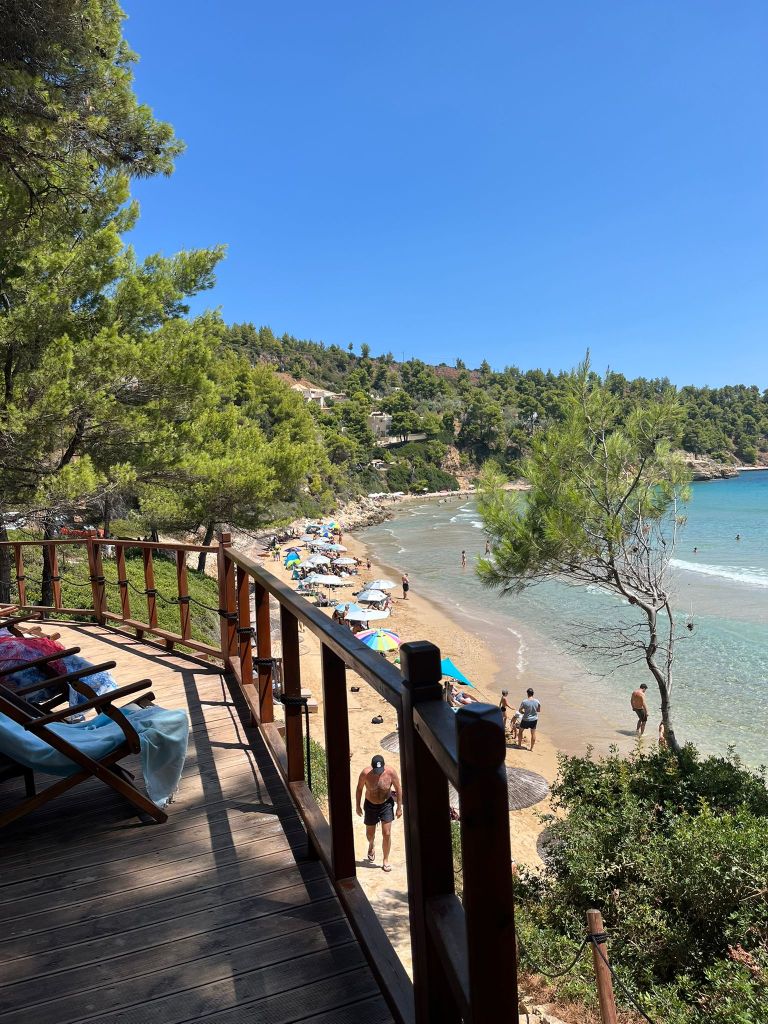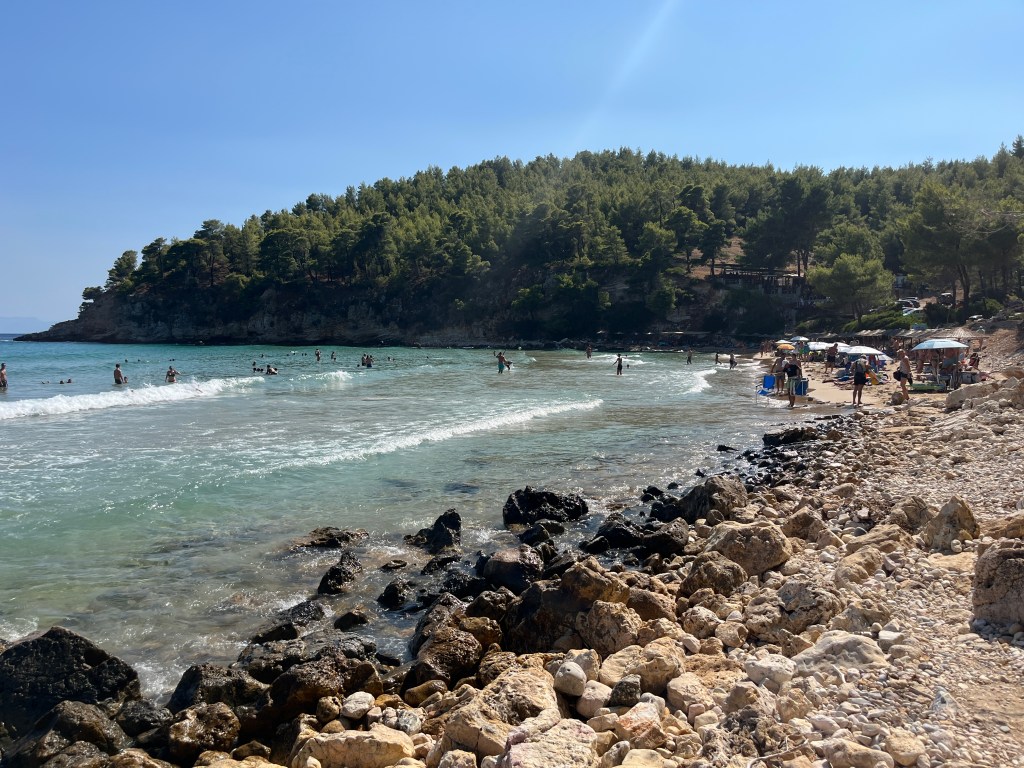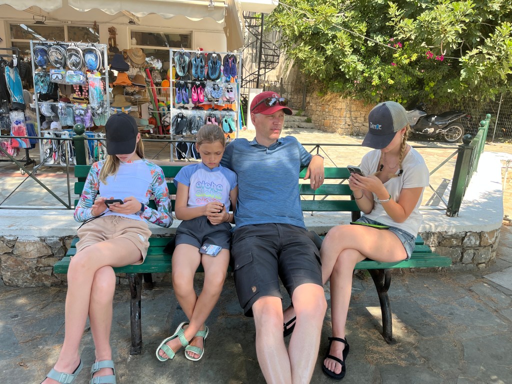 Then I thought of the taxis and quickly found a beach that I had saved as a “must see” on my google maps. (Side note: About 6 months ago I learned about how to save places in google maps and it has changed our traveling! It makes it so easy. As I was doing research for places all over the world, I would save them there to have everything in one location. I saved restaurants, our accommodations once they’ve been booked, attractions and any other tips. Then when we are at that location, I can just pull up my google maps and see what is nearby. Amazing! And I have no idea why it took me so long to learn about that. 🙈) I picked Chrisi Milia beach and asked the rental car agency how much a taxi would typically cost. She said €15, so we went off to find one. Since there are so many of us, technically we need two taxis. But a few days earlier one driver had squeezed us all into one, so we were hoping for that again. At first a lady said she would do it but then noticed the police officers having coffee right there and changed her mind. Then another driver came, and we asked him. He took Luisa by the hand and went to the police officers to ask if it was alright to squeeze us all into his cab. The office laughed and said, “Are there 11 people? No? Then it’s okay!” 🤣 So off we went. And we ended up here.