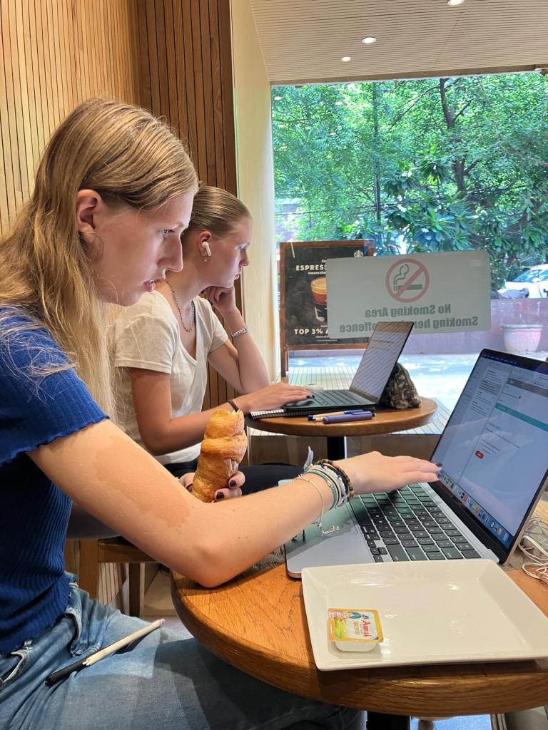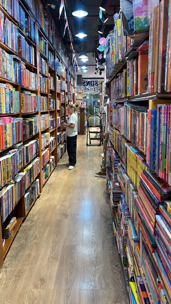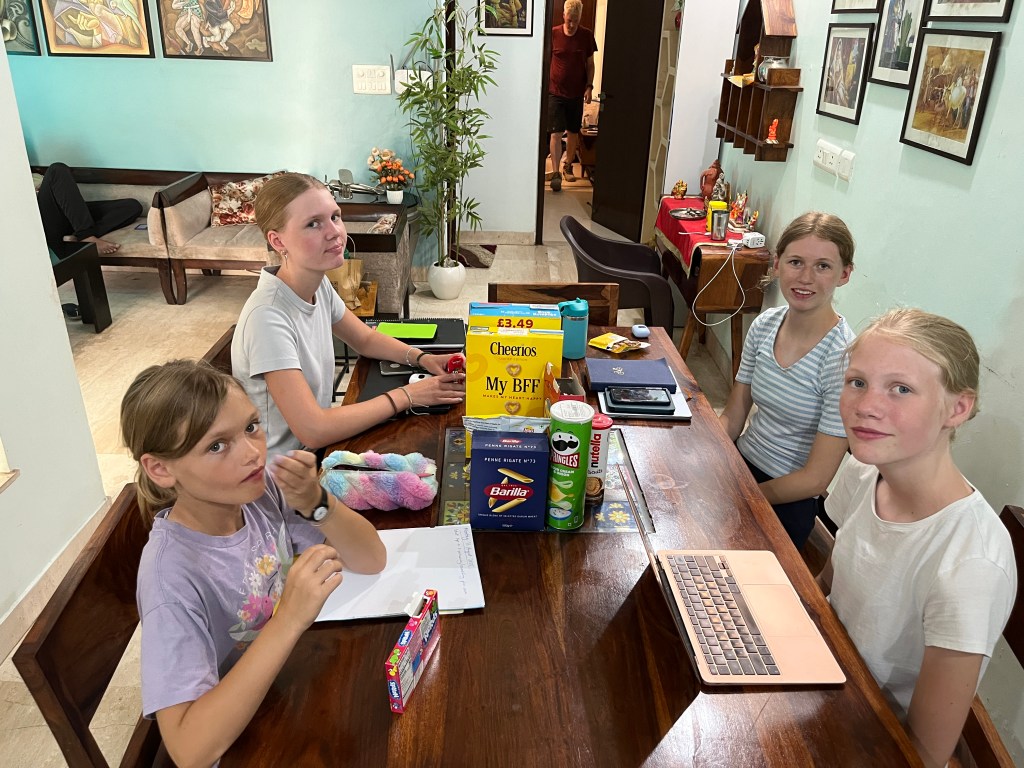 When we were wandering around the market area that’s a less than 5 minute ride away, we had noticed a Starbucks. So yesterday afternoon (after we had Pizza Hut again) we walked in to check it out. It had tables and plenty of space and seemed as though could work as a classroom for us. That planted a seed on our heads. But first we needed to head to a mall we had driven past in hopes that they could fix my laptop (which the night before had decided to die). So we got in another Uber and made our way over. We spotted a few fun things on our way! And then arrived at the mall which could have bee anywhere in American, complete with a PF Changs, Apple Store and movie theater. The girls had so much fun wandering around, and we were able to figure out that my laptop just needs a new battery. They ordered one and it should be ready to go early next week. Thank god! We got home late and exhausted but happy to have figured a few things out.