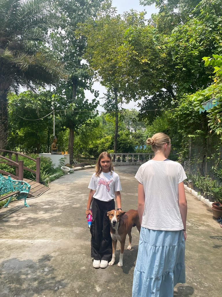 On Monday we headed out on an adventure as a family–to visit a local Waldorf School that we thought might be a place Luisa could go to while we are here. We had an 11am appointment, so hopped in our Uber around 10:35am and were off. We arrived at little after 11am and it took us awhile to figure out how to get in. The school is in a neighborhood of large houses (farms?) with huge gates and high hedges so you can’t see anything. And the school doesn’t have any signage, but the director explained all that in her email and around 11:15am we were let in to the school grounds. The director greeted us and told us to look around while she finished up her meeting. The school is very basic with a couple of rusty play structures, a paved area where the kids were playing games, a basic two-story structure for classes and then a huge farm area. It was recess for the elementary school when we arrived, so most of the kids were playing in the yard. The Indian children were curious but remained at a distance. After a while, one came up and asked us where we are from and what Luisa’s name is. When she told him, he said, “Oh! What a pretty name!” They have a few dogs at the school which Luisa loved, though we later learned that the people aren’t supposed to interact with the dogs since they are more to protect the farm rather than pets.