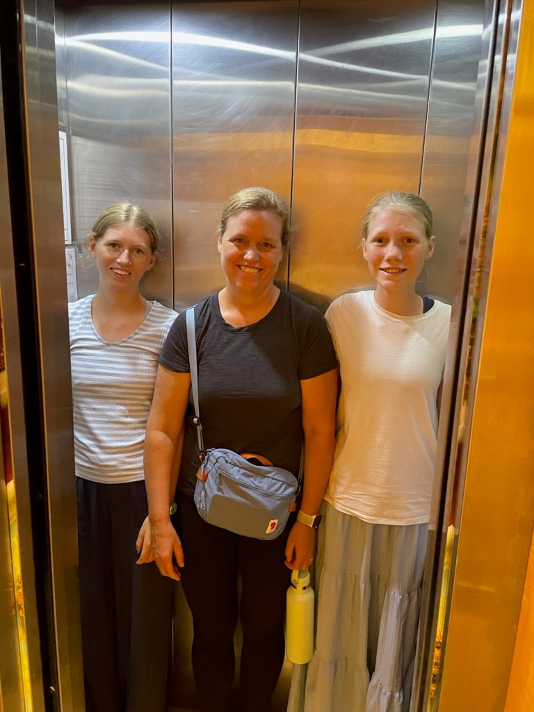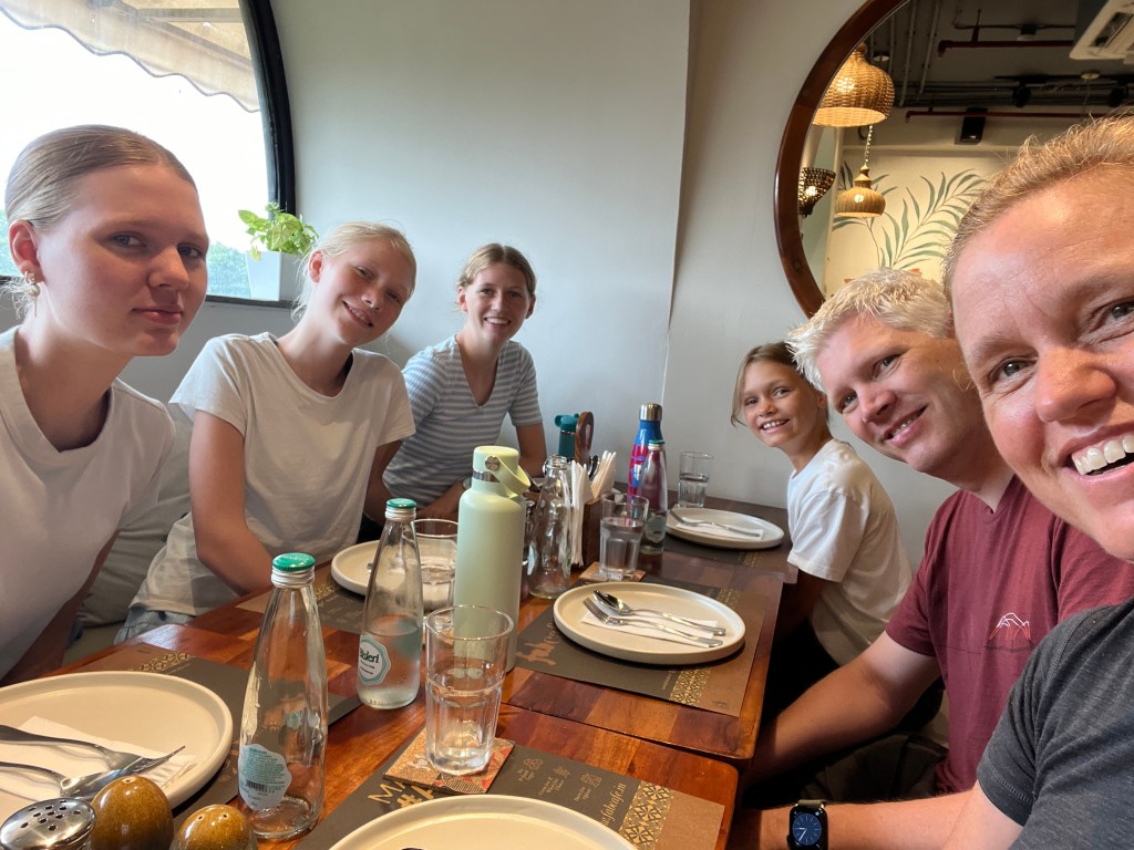 After we ate a bit and rested some more, we decided we needed to shower and venture out. We wanted to figure out the SIM card situation, grab some more food (everyone was starving and the kids especially hadn’t eaten much since our delicious dinner in Athens Friday night) and maybe find a grocery store. As soon as we exited the apartment building, we were hit with the stifling, hot, humid, stinky air. Sweat started dripping down our backs immediately. But we were determined. So, with Steffen leading the charge, we crossed the street (cars, tuk tuks, motorbikes, bicycles, carts whizzing by) and made our way to a strip of stores and restaurants called “Green Park Market”. We found a cell phone store where they were very helpful and then headed to a nearby Pizza Hut where we all filled our bellies with delicious (and cheap) pizza. Everyone was feeling a bit better after that. We then walked over to a grocery store that turned out to have some of our favorite American treats, including a €11 box of Cheerios, Skittles and chips. Some snacks to make the kids feel a bit more comfortable. We also bought a lot of bottled water that we did not want to carry home, so we tried out Uber for the first time here. And it was great! Super easy and cheap. And we can always find a car for the six of us. Since then we have been relying exclusively on Uber to get around which has been really nice. Because those first few 15-20 minute walks were painful with the heat, humidity and chaos. It is much nicer to watch the chaos from inside an air conditioned car!