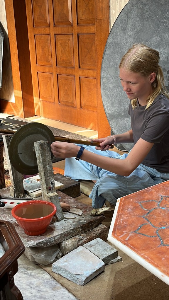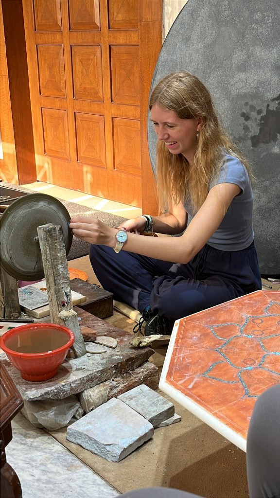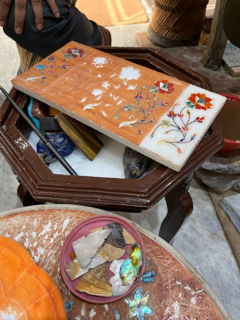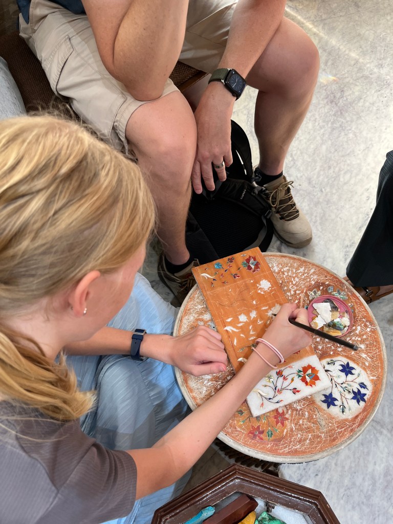 After we spent a few hours exploring the Taj Mahal and surrounding area, our guide took us back to our hotel so we could have breakfast. On the way there, he said he wanted to show us a how they do the “pietra dura” and took us to a workshop where descendants of the original Mughal artisans continue to work with the same materials to create gorgeous marble inlay. It was fascinating! We got to learn about the different techniques and how the process works and even got to try a little ourselves.