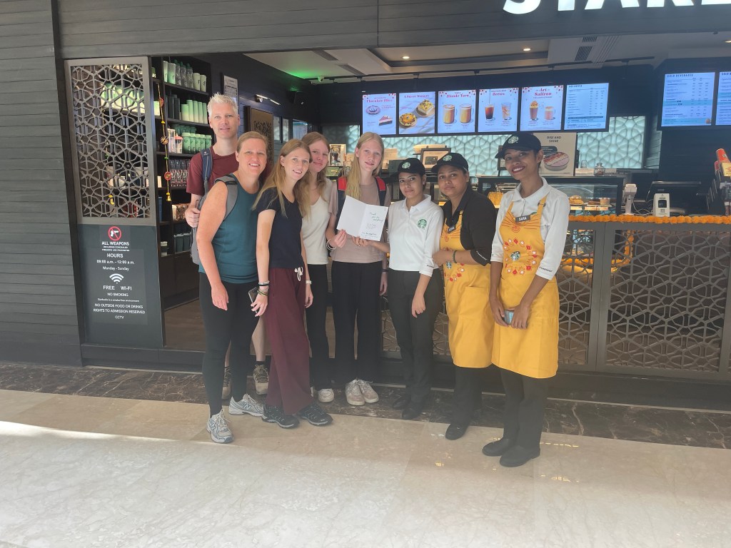 When we left Delhi, we had two small goodbyes that were heart-warming and sweet. First, Luisa’s school had a very nice party for her complete with cake and drawings from her classmates. (The green gates are outside her school.) Second, Olivia made a thank you card for the women at Starbucks and they were thrilled. “This really means a lot to us!”