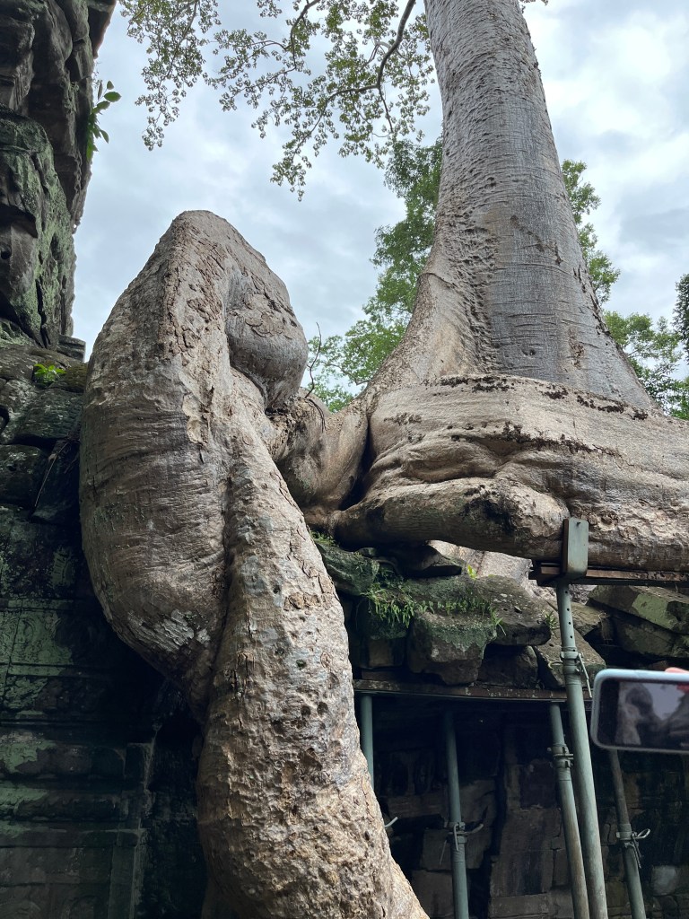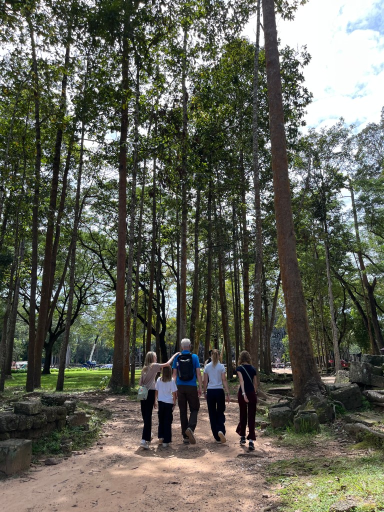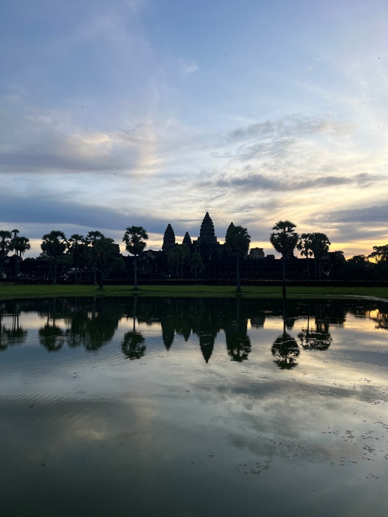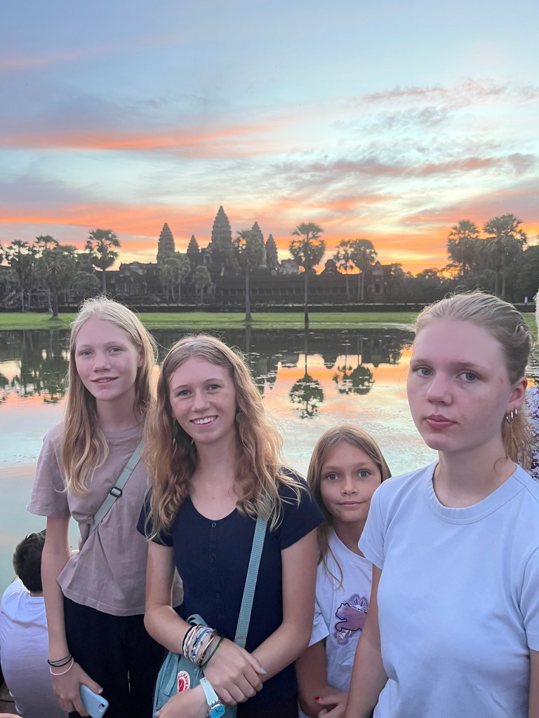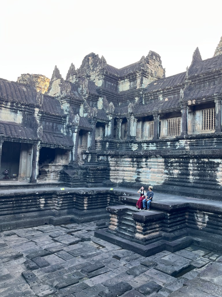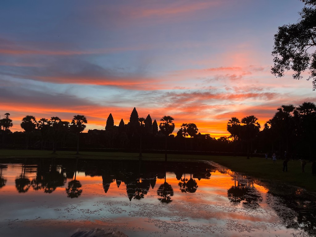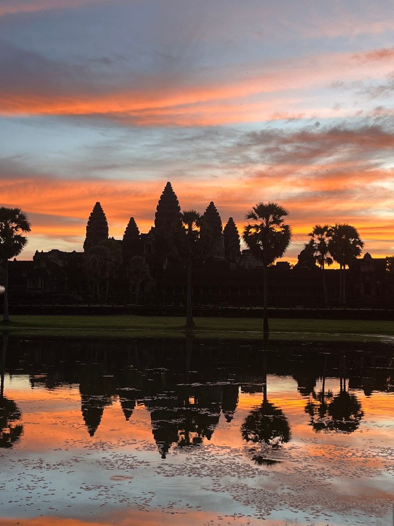 On Thursday morning, a guide came to our hotel for a 5am pick-up to head out to watch the stunning sunrise at Angkor Wat. It was crowded but well worth it! We don’t see many sunrises (more of a sunset family) but this one was one we couldn’t miss. We drove through the dark in two tuk tuks, followed the crowds over the bridge and towards the viewing platform where we stood and were mesmerised by the kaleidoscope of colors. A “pinch me” moment!