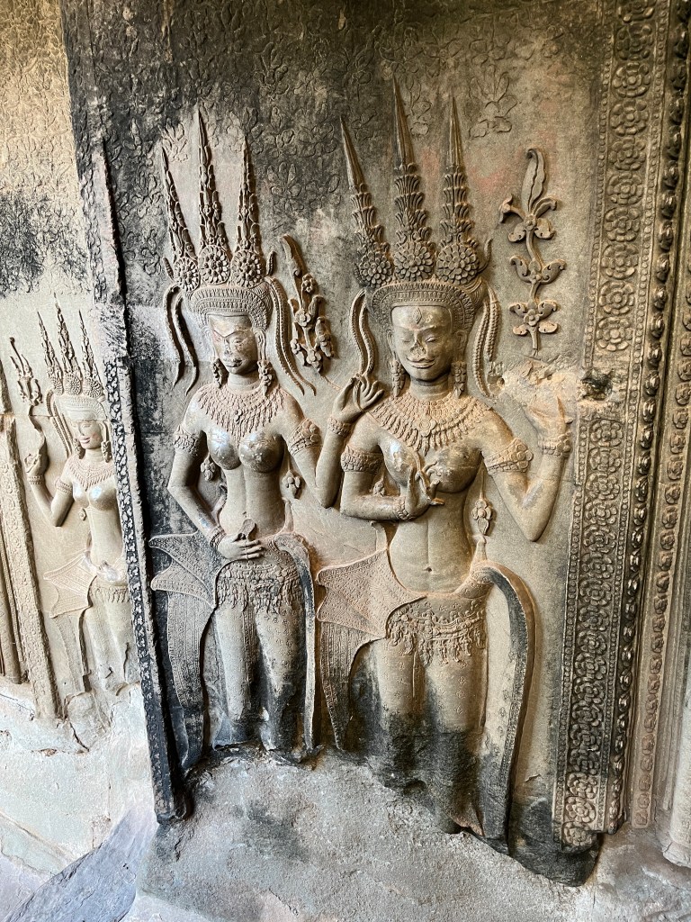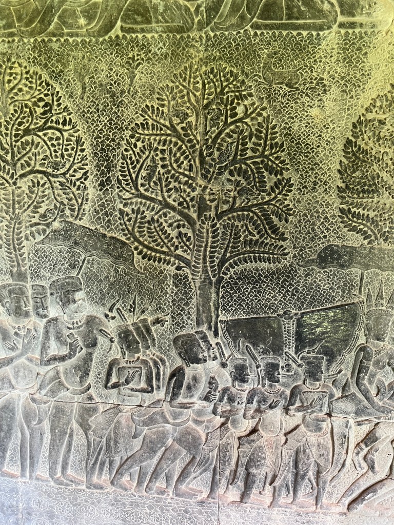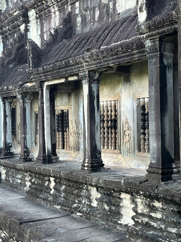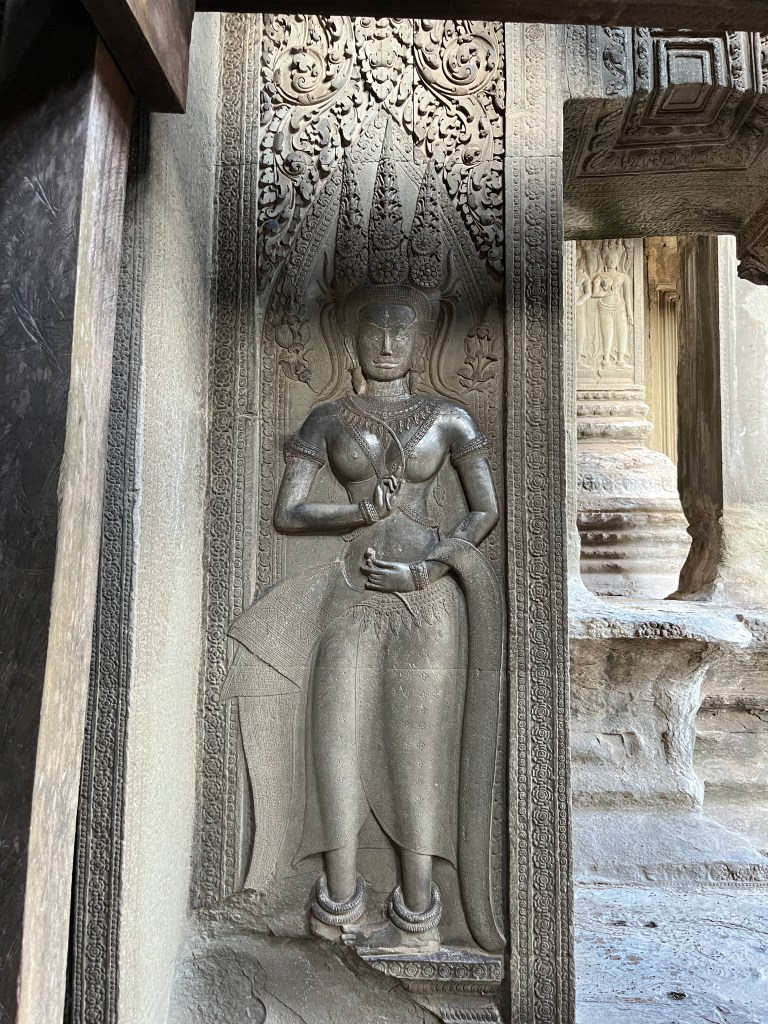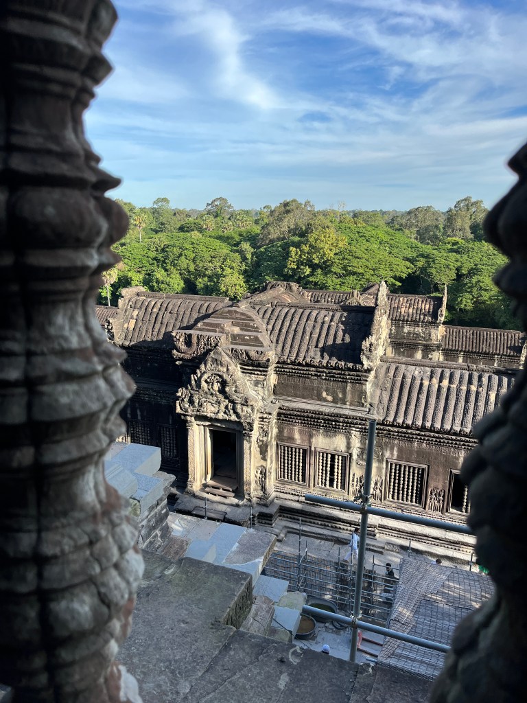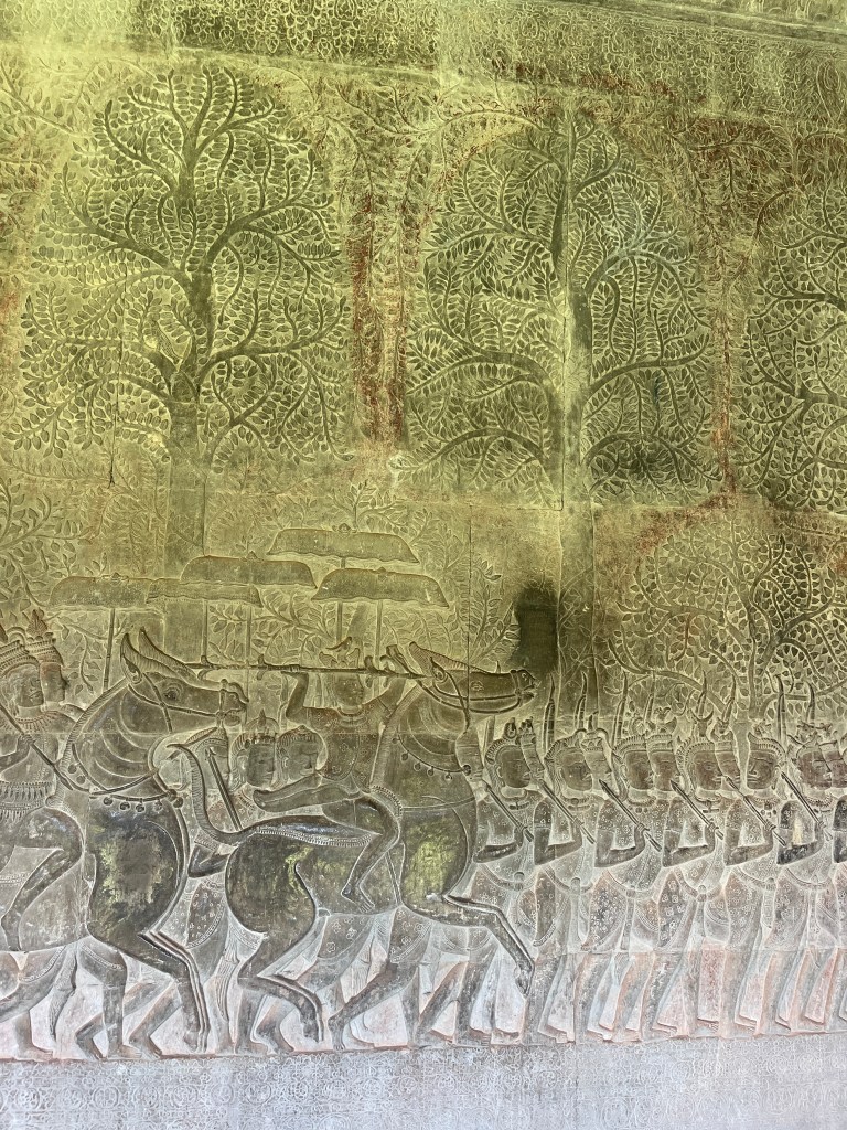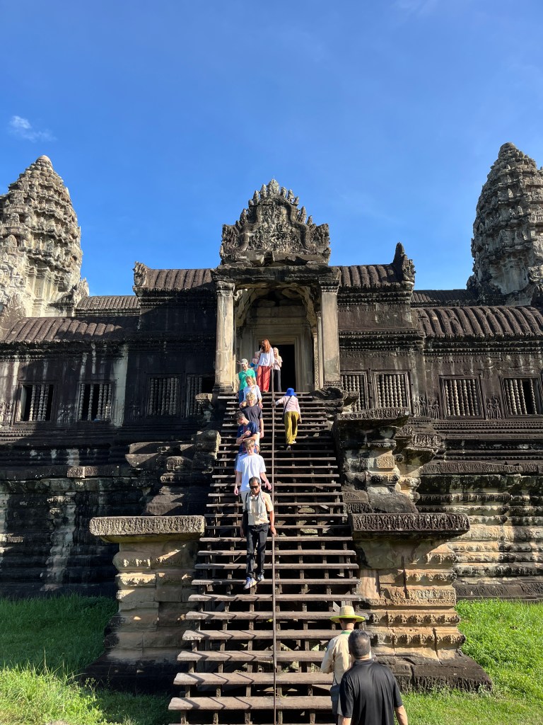 Then it was time to head into the main temple. Angkor Wat was commissioned by the Khmer king Suryavarman II in the early 12th century in Yaśodharapura (present-day Angkor), the capital of the Khmer Empire. The construction of the temple commenced in 1122 CE and was completed in 1150 CE. The scope of the complex is astonishing and the details are intricate. I was particularly enthralled with the carvings that covered huge areas, telling stories and depicting kings, warriors and everyday life. We walked around and explored for a bit, seeing the four large pools that held water, looking at the galleries full of beautiful carvings and admiring the iconic towers. Everyone except Luisa and our guide (no on under 12 is allowed up) climbed the steep stairs to the third floor for beautiful views.