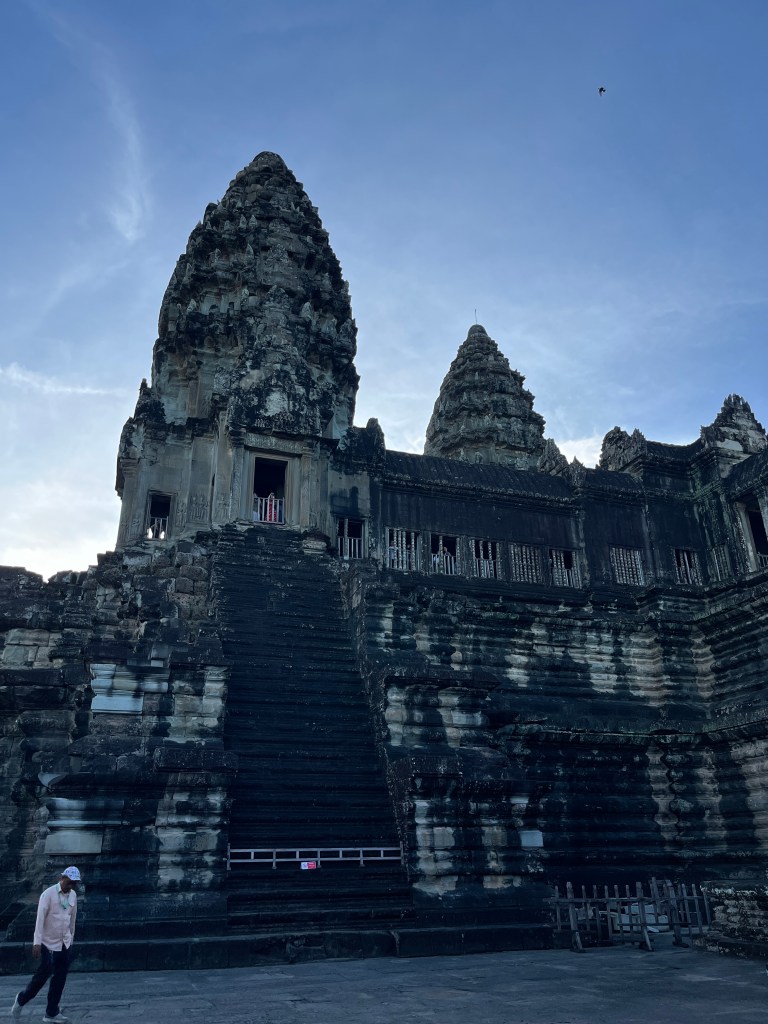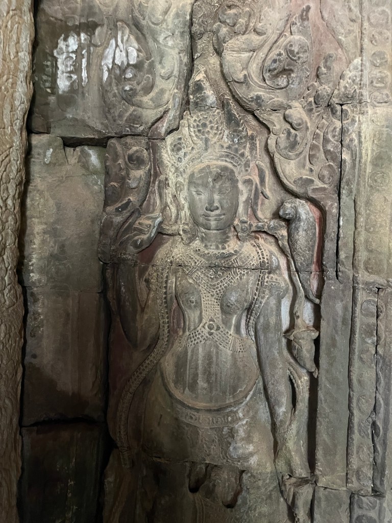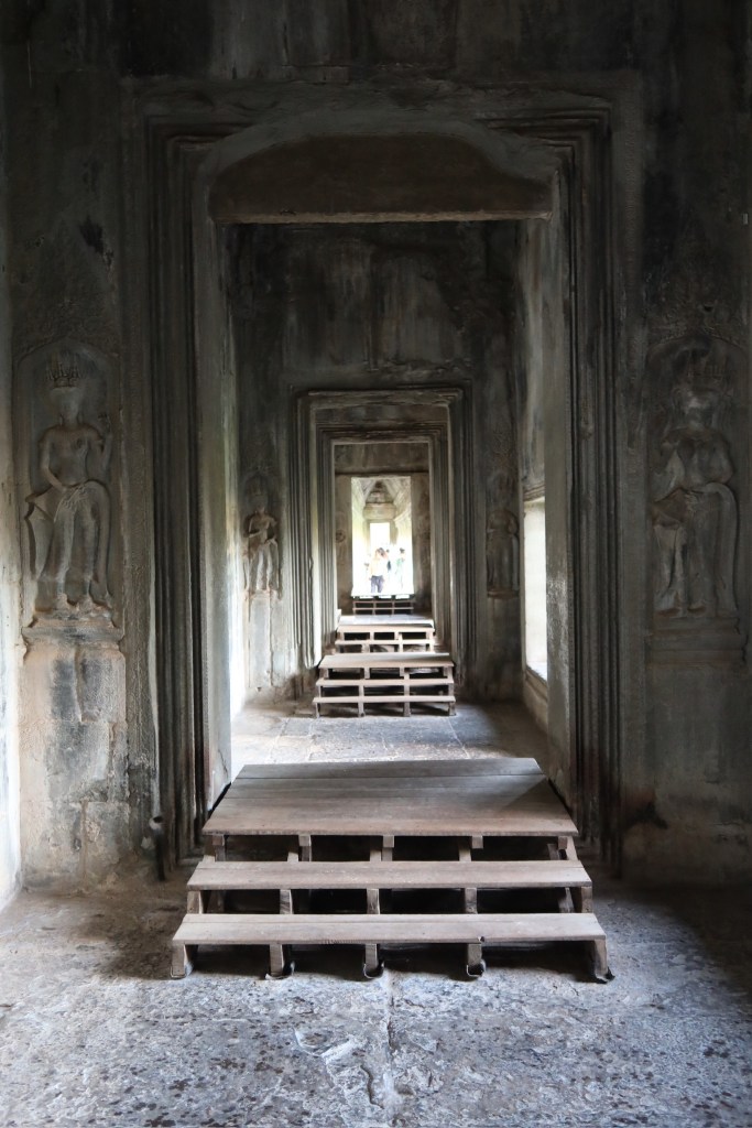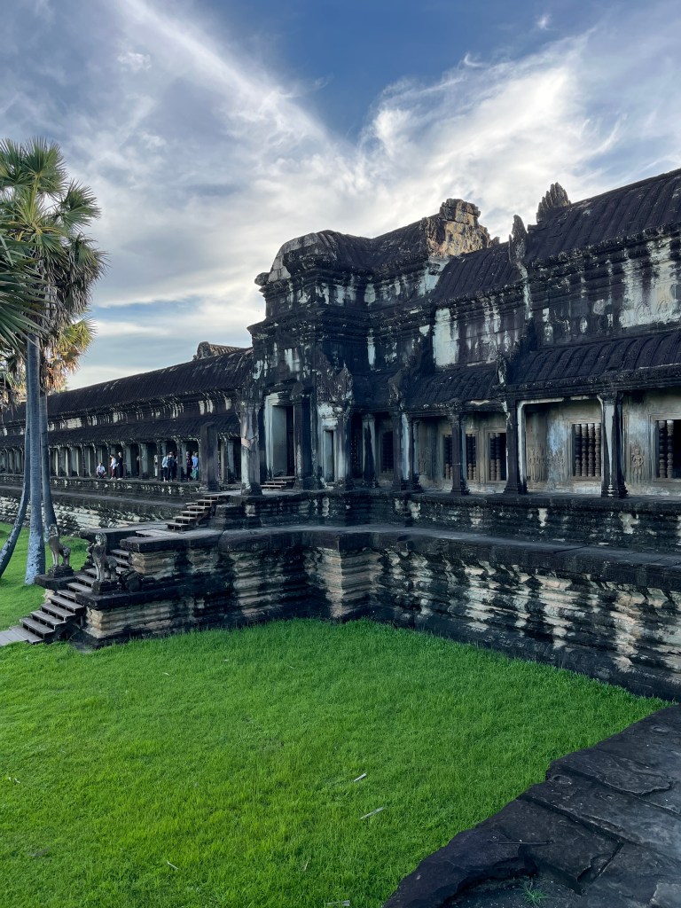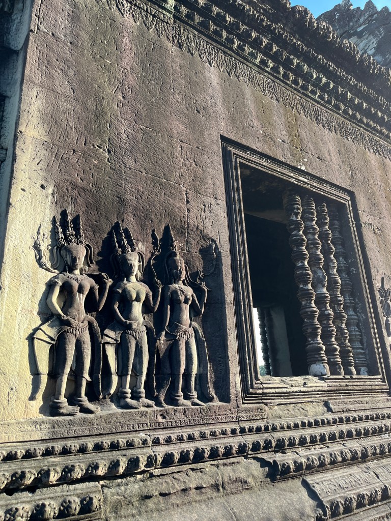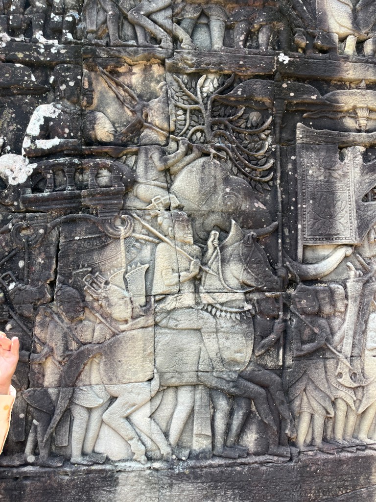 Then it was time to head into the main temple. Angkor Wat was commissioned by the Khmer king Suryavarman II in the early 12th century in Yaśodharapura (present-day Angkor), the capital of the Khmer Empire. The construction of the temple commenced in 1122 CE and was completed in 1150 CE. The scope of the complex is astonishing and the details are intricate. I was particularly enthralled with the carvings that covered huge areas, telling stories and depicting kings, warriors and everyday life. We walked around and explored for a bit, seeing the four large pools that held water, looking at the galleries full of beautiful carvings and admiring the iconic towers. Everyone except Luisa and our guide (no on under 12 is allowed up) climbed the steep stairs to the third floor for beautiful views.