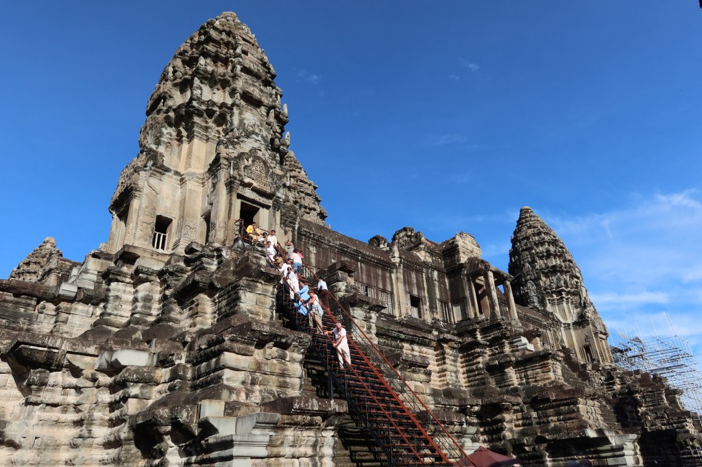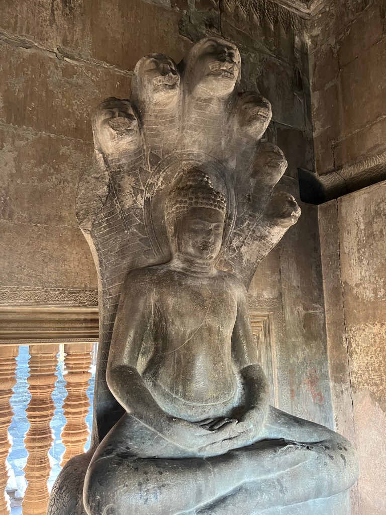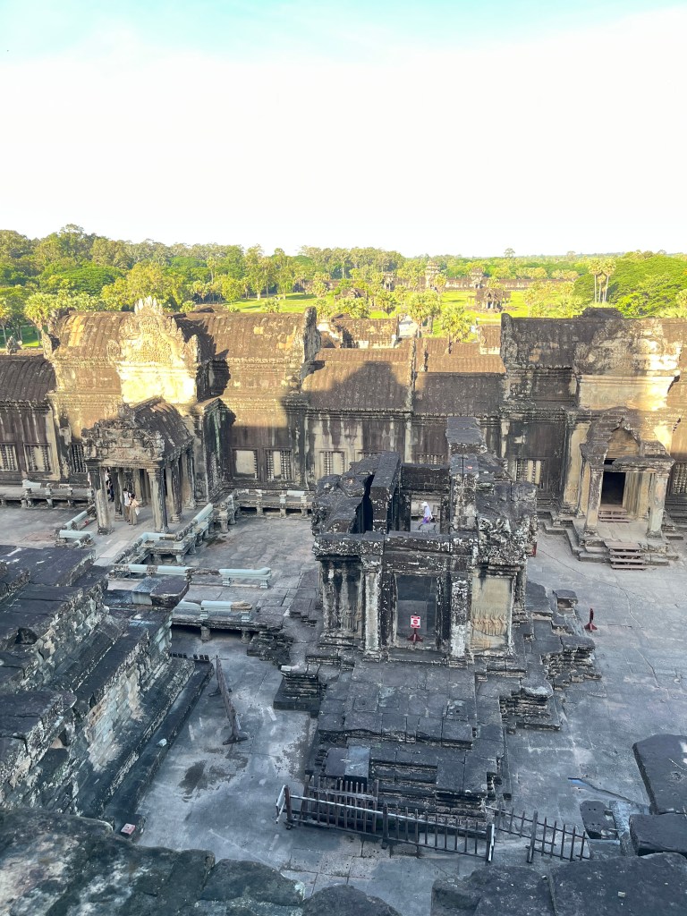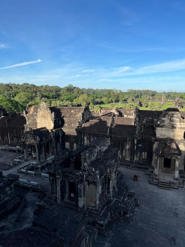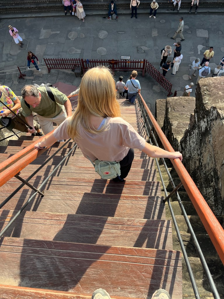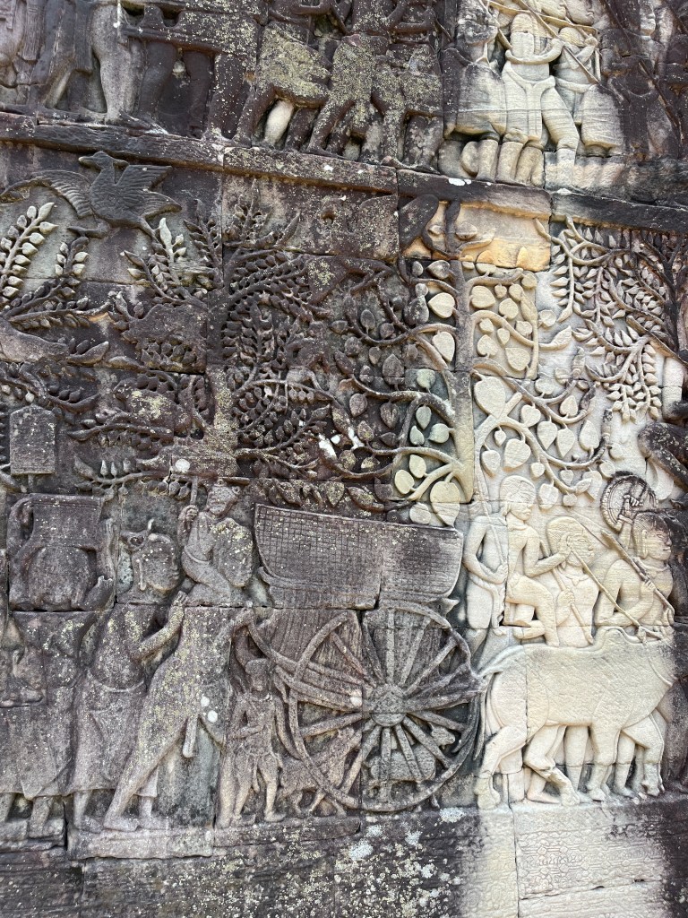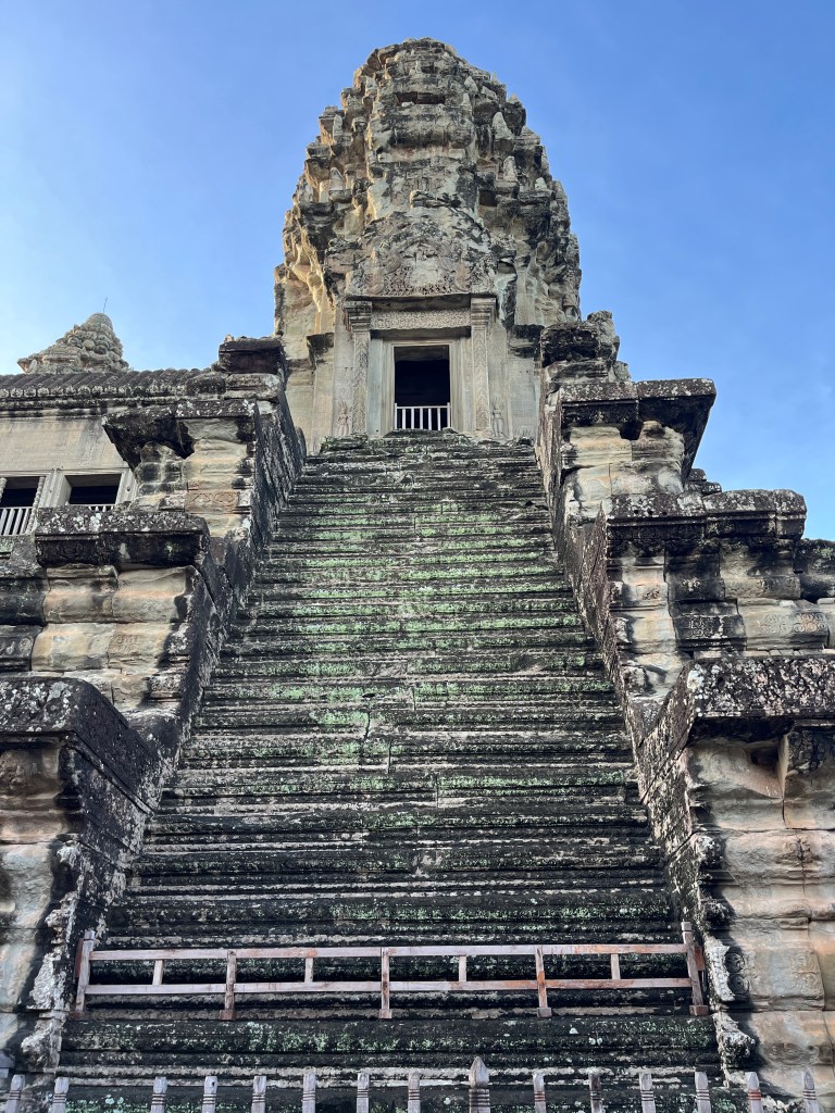 Then it was time to head into the main temple. Angkor Wat was commissioned by the Khmer king Suryavarman II in the early 12th century in Yaśodharapura (present-day Angkor), the capital of the Khmer Empire. The construction of the temple commenced in 1122 CE and was completed in 1150 CE. The scope of the complex is astonishing and the details are intricate. I was particularly enthralled with the carvings that covered huge areas, telling stories and depicting kings, warriors and everyday life. We walked around and explored for a bit, seeing the four large pools that held water, looking at the galleries full of beautiful carvings and admiring the iconic towers. Everyone except Luisa and our guide (no on under 12 is allowed up) climbed the steep stairs to the third floor for beautiful views.