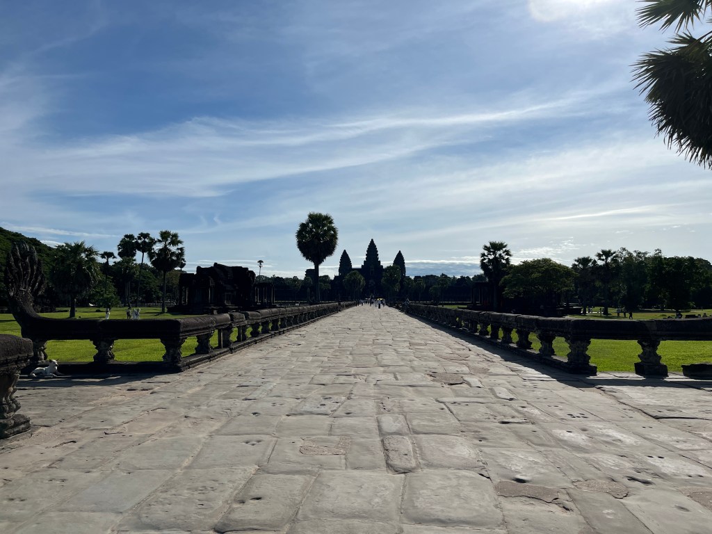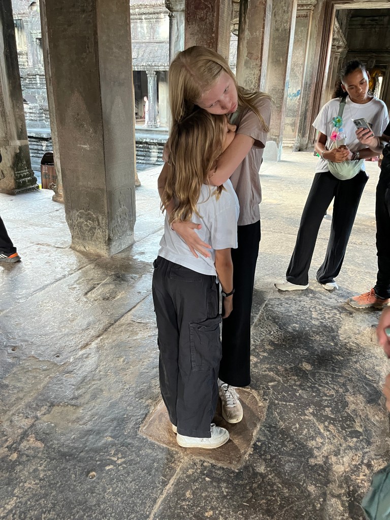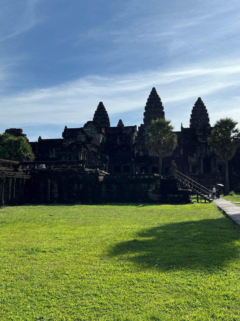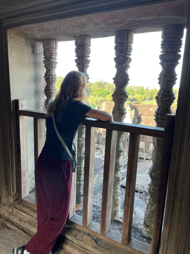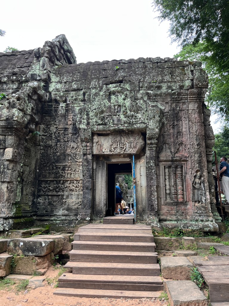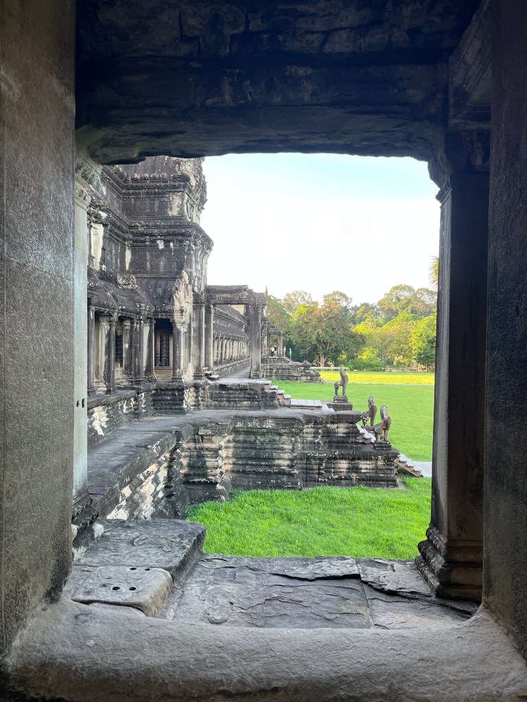 Then it was time to head into the main temple. Angkor Wat was commissioned by the Khmer king Suryavarman II in the early 12th century in Yaśodharapura (present-day Angkor), the capital of the Khmer Empire. The construction of the temple commenced in 1122 CE and was completed in 1150 CE. The scope of the complex is astonishing and the details are intricate. I was particularly enthralled with the carvings that covered huge areas, telling stories and depicting kings, warriors and everyday life. We walked around and explored for a bit, seeing the four large pools that held water, looking at the galleries full of beautiful carvings and admiring the iconic towers. Everyone except Luisa and our guide (no on under 12 is allowed up) climbed the steep stairs to the third floor for beautiful views.