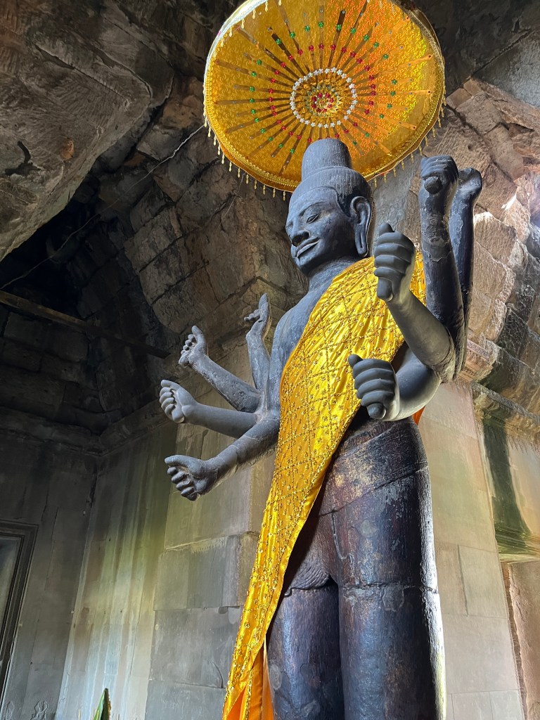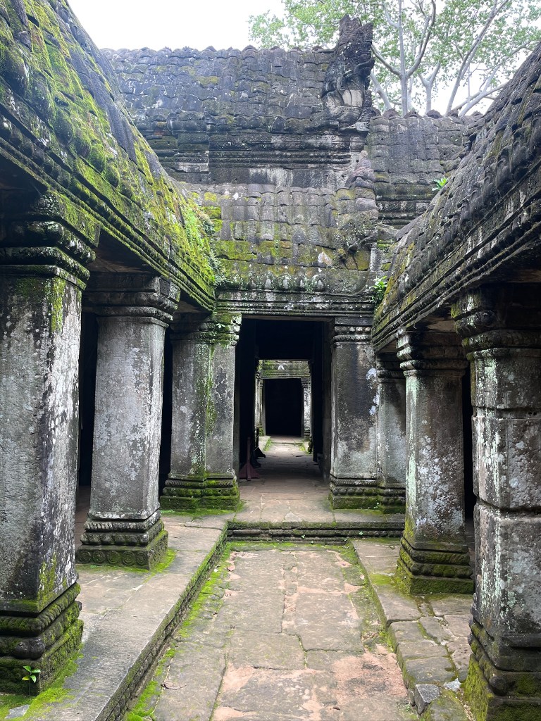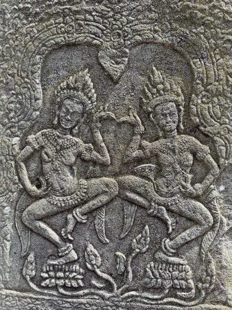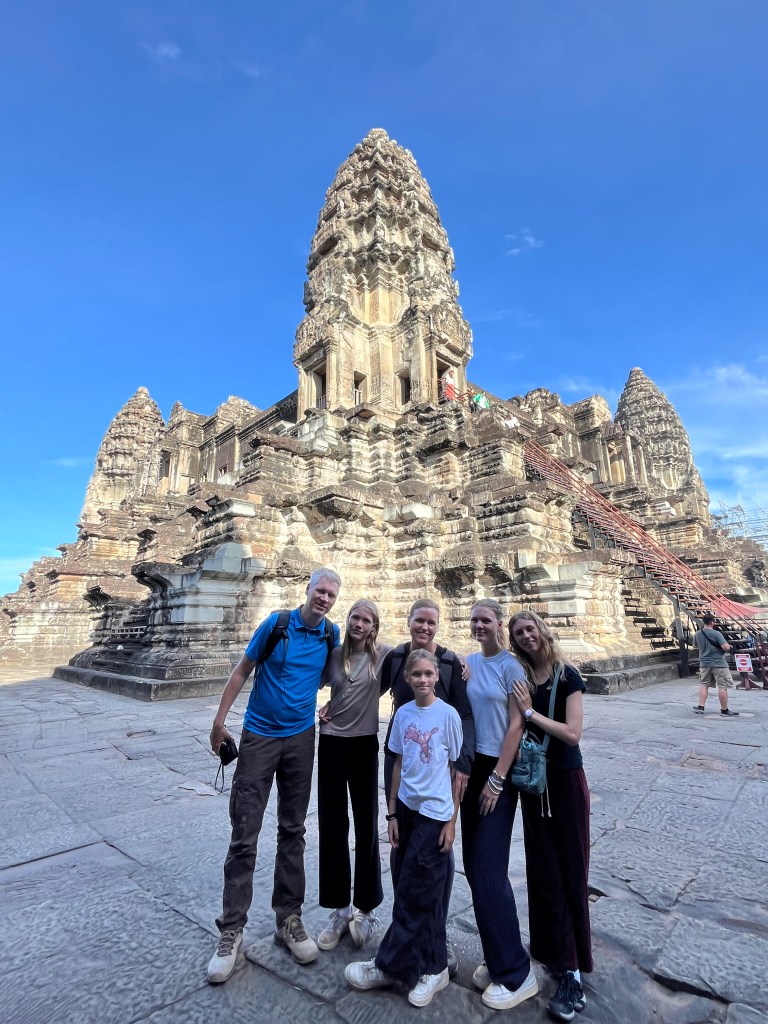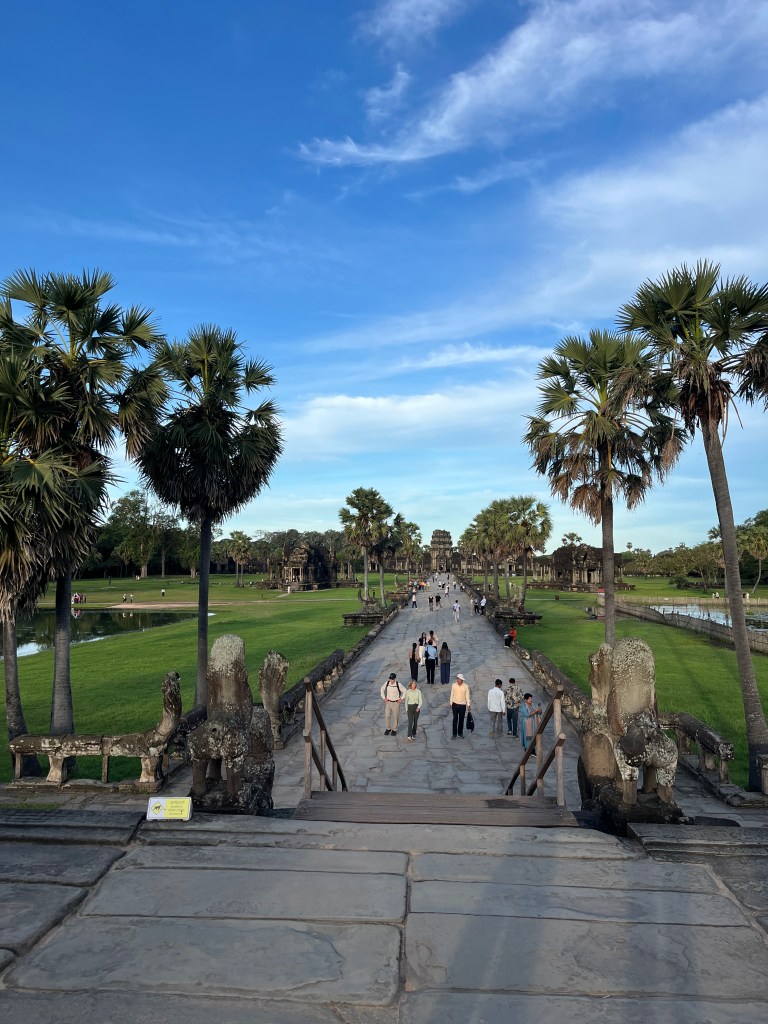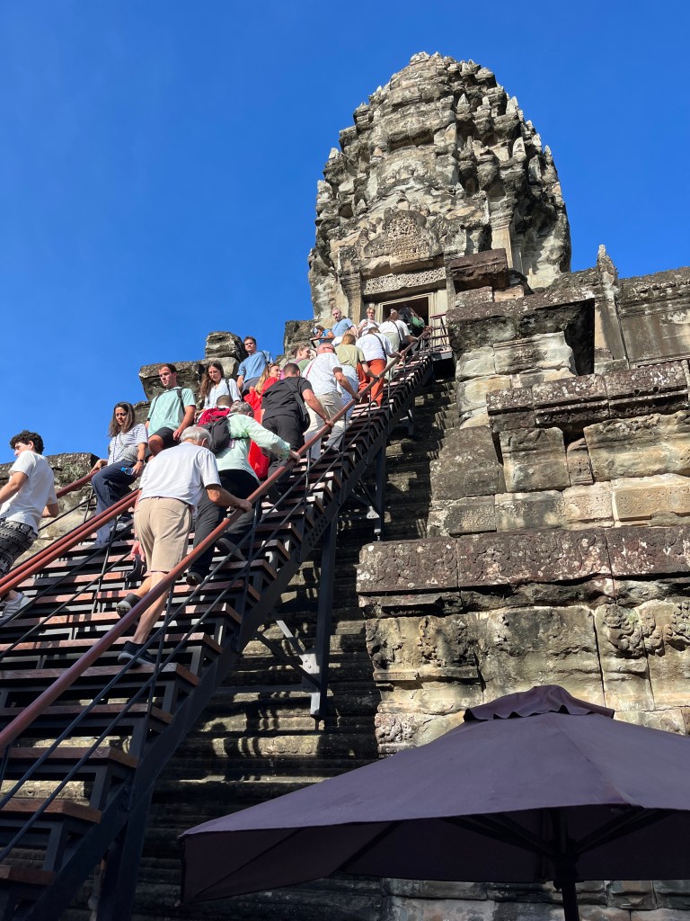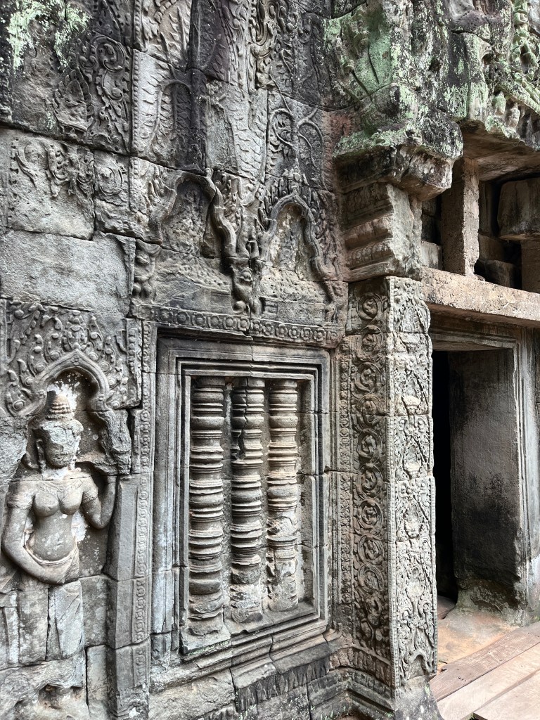 Then it was time to head into the main temple. Angkor Wat was commissioned by the Khmer king Suryavarman II in the early 12th century in Yaśodharapura (present-day Angkor), the capital of the Khmer Empire. The construction of the temple commenced in 1122 CE and was completed in 1150 CE. The scope of the complex is astonishing and the details are intricate. I was particularly enthralled with the carvings that covered huge areas, telling stories and depicting kings, warriors and everyday life. We walked around and explored for a bit, seeing the four large pools that held water, looking at the galleries full of beautiful carvings and admiring the iconic towers. Everyone except Luisa and our guide (no on under 12 is allowed up) climbed the steep stairs to the third floor for beautiful views.