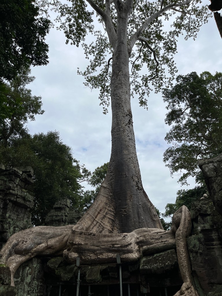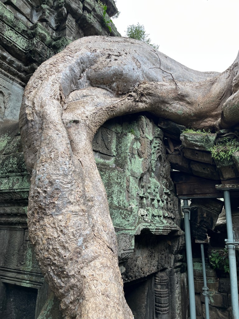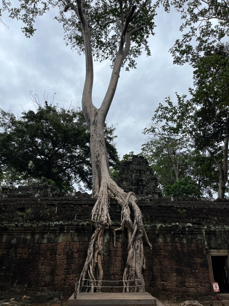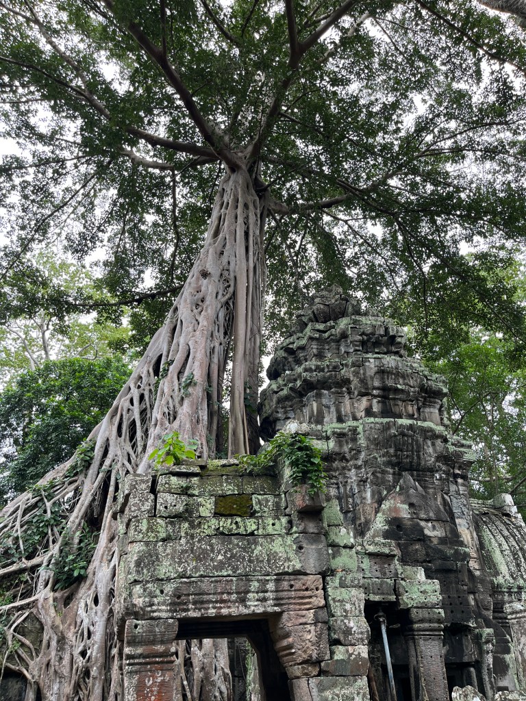 From there we drove in the tuk tuks to Ta Prohm temple, which is featured in the film Lara Croft: Tomb Raider. This temple was very cool because of all the trees growing through parts of the temple, such as the silk-cotton tree, strangler fig and spong tree. It was fascinating to see how they push and weave their way through the stones. The carvings were also so beautiful!