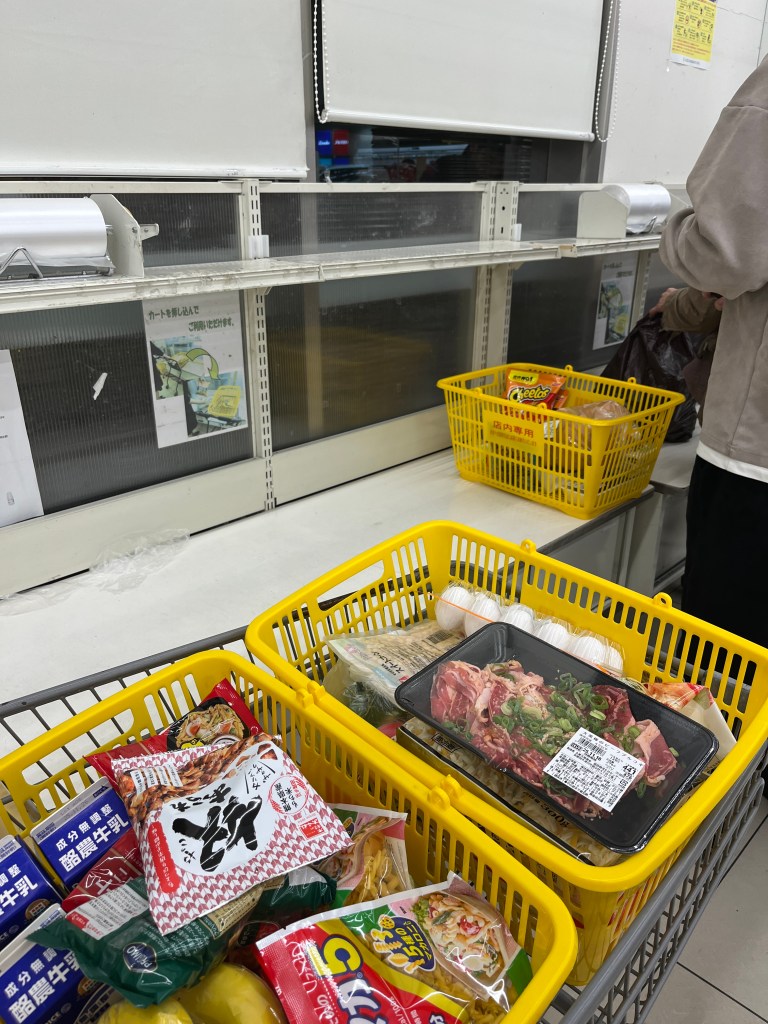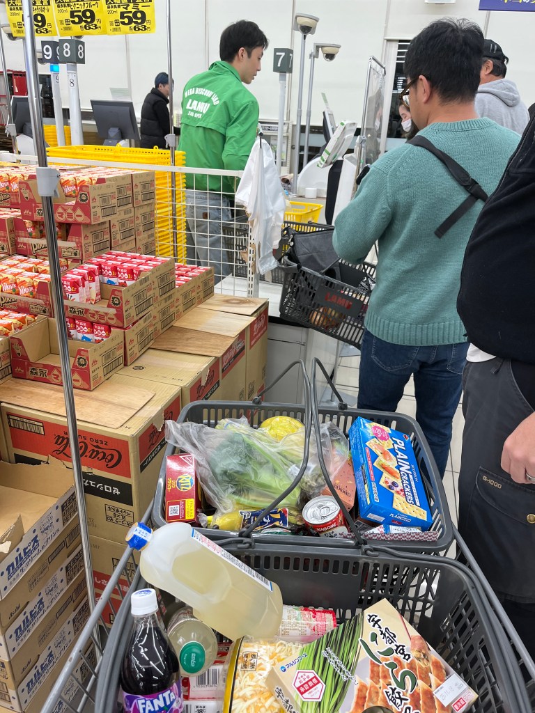 At the grocery store, they have you put a basket in your cart as you shop. At the check-out counter, you give them the basket and they move the food from one basket to another as they scan the items, then hand you the basket. You pay and take the basket to a separate area where you bag your groceries. Very efficient!