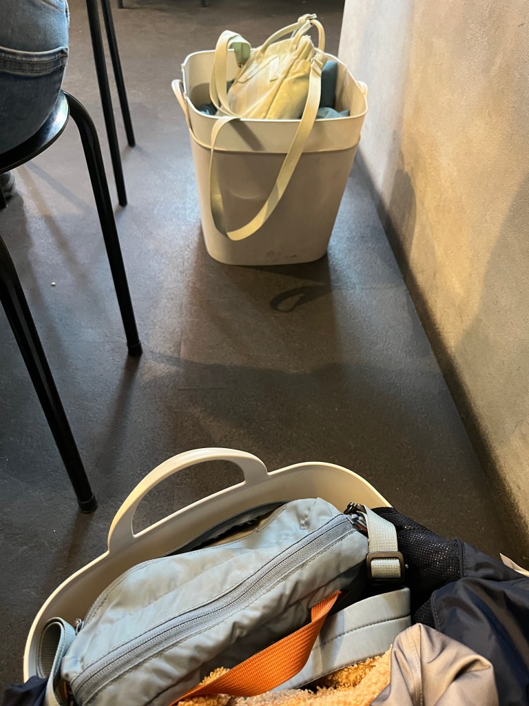 At restaurants we have noticed little bins near the table to put your purse, scarves, coat, etc which is so convenient!