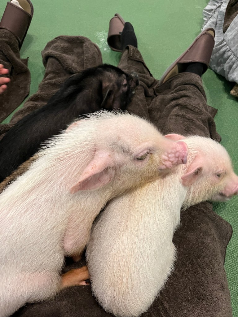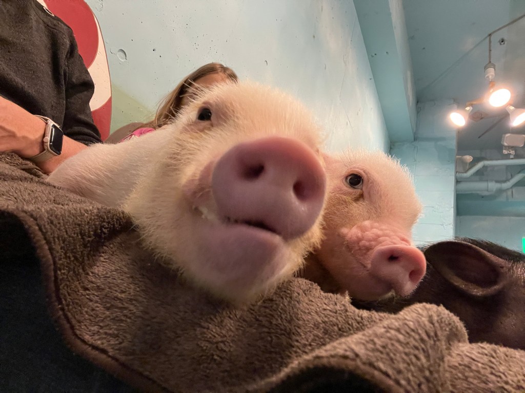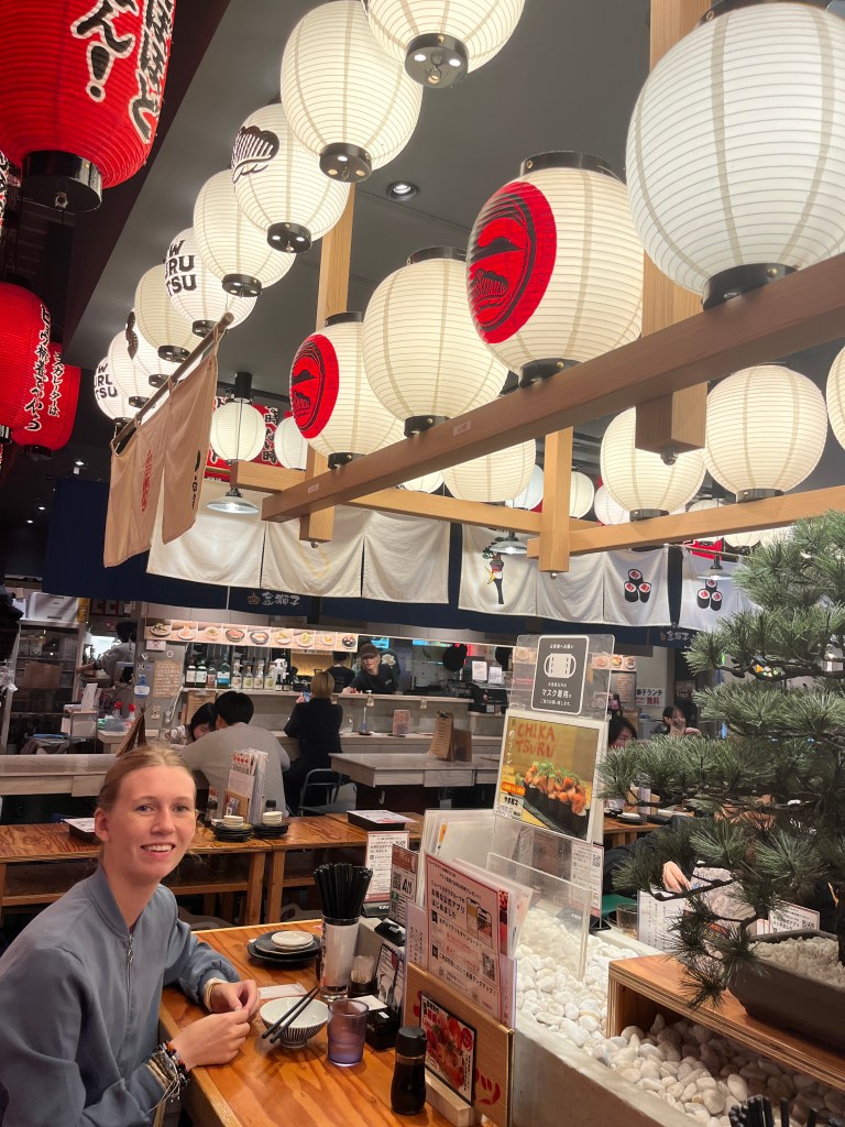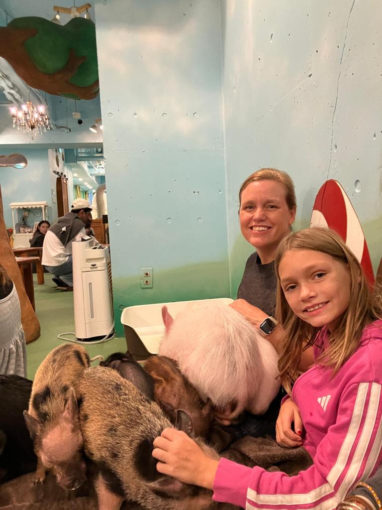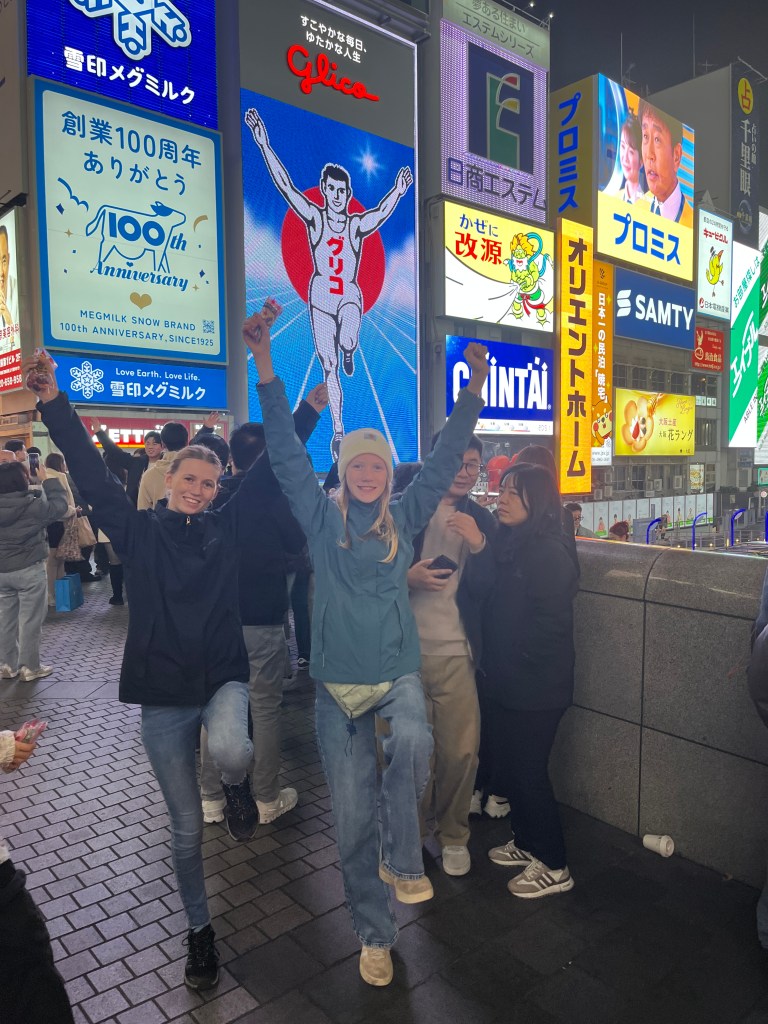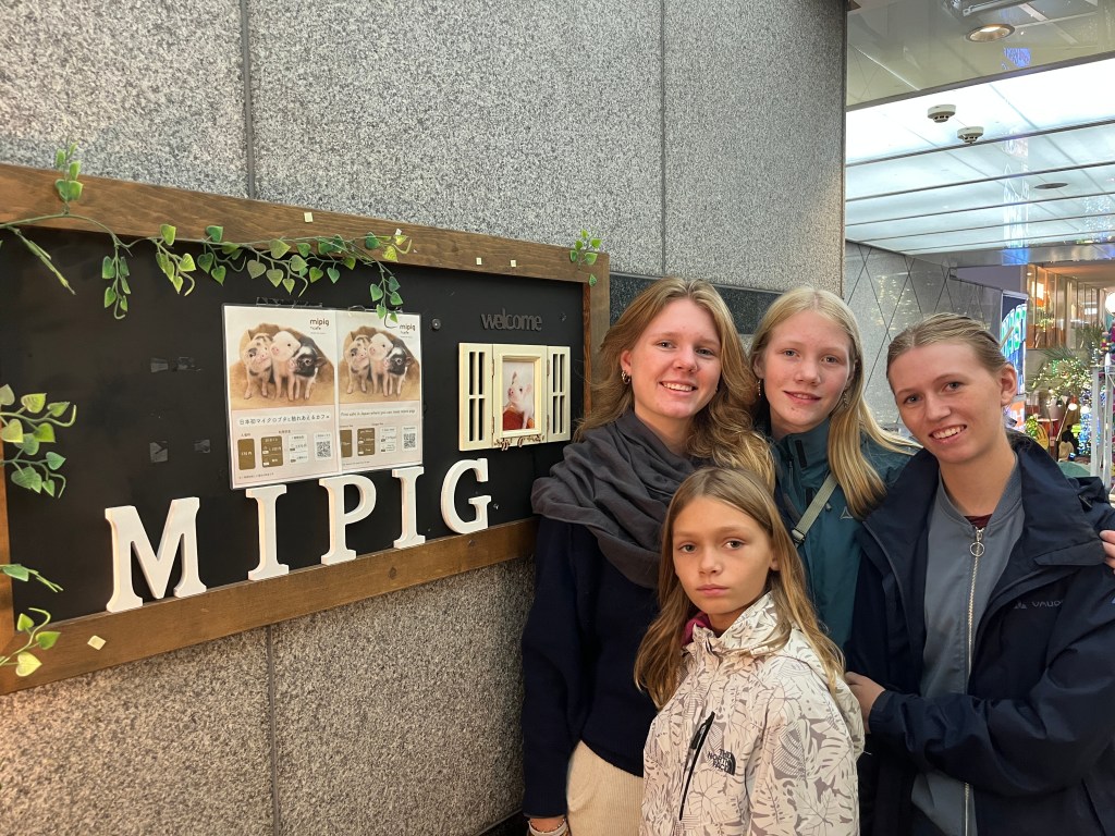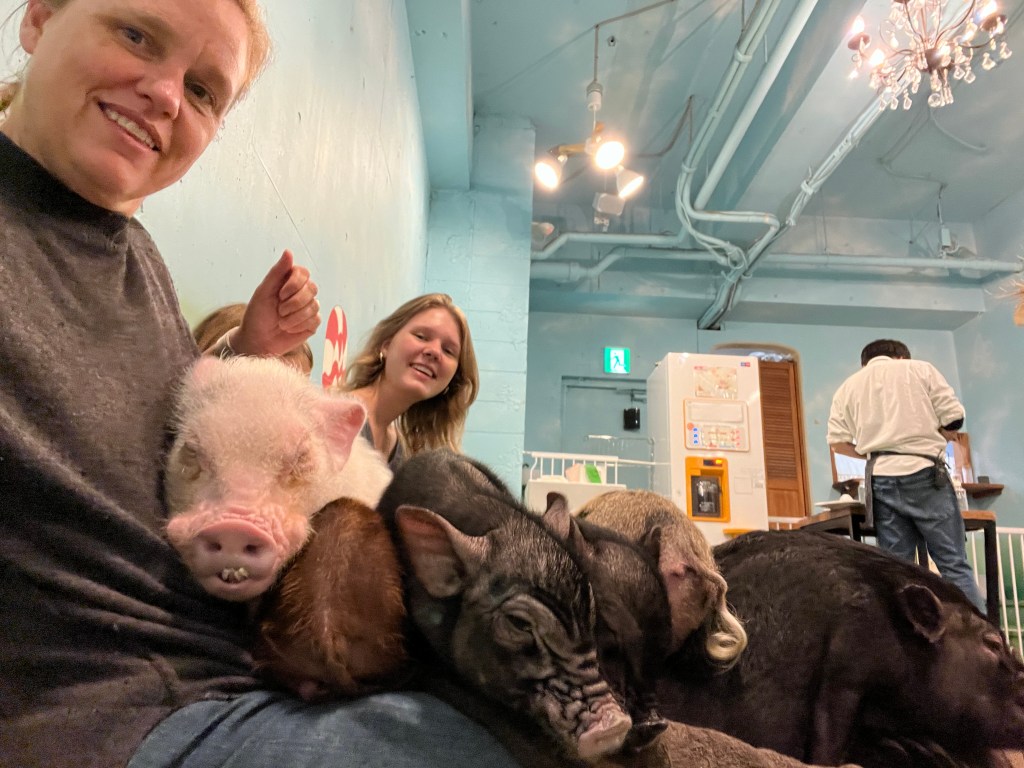 The next day it was schoolwork in the morning and then a unique experience in the afternoon–a trip to a “Pig Cafe“! Not a cafe serving pig but rather a place where you cuddle pigs. It was so fun! At one point there was a huge pile of pigs on my lap! Afterwards we just wandered. We window shopped, ate some dinner, grabbed some sweets and imitated others in the trend of imitating this billboard. When in Rome…. It was a fun introduction to Osaka.