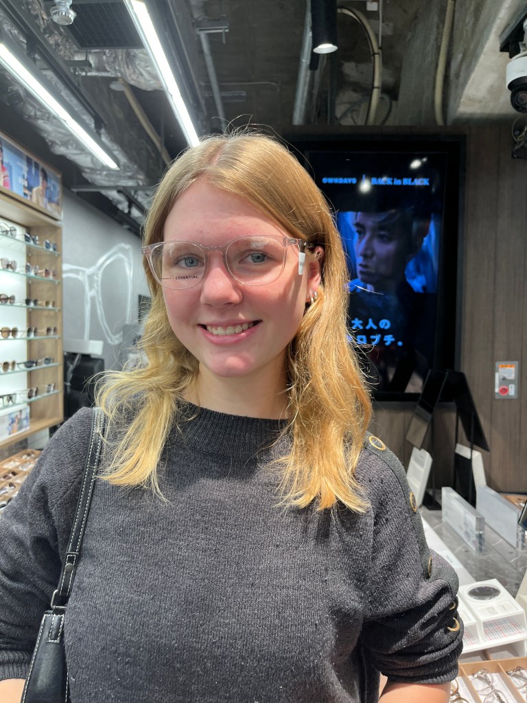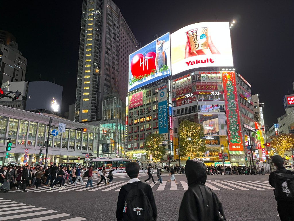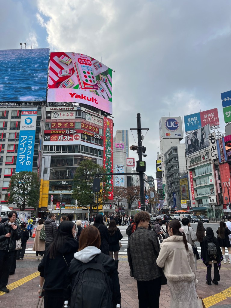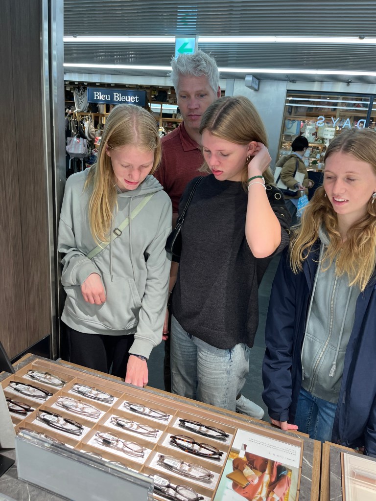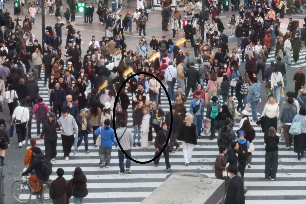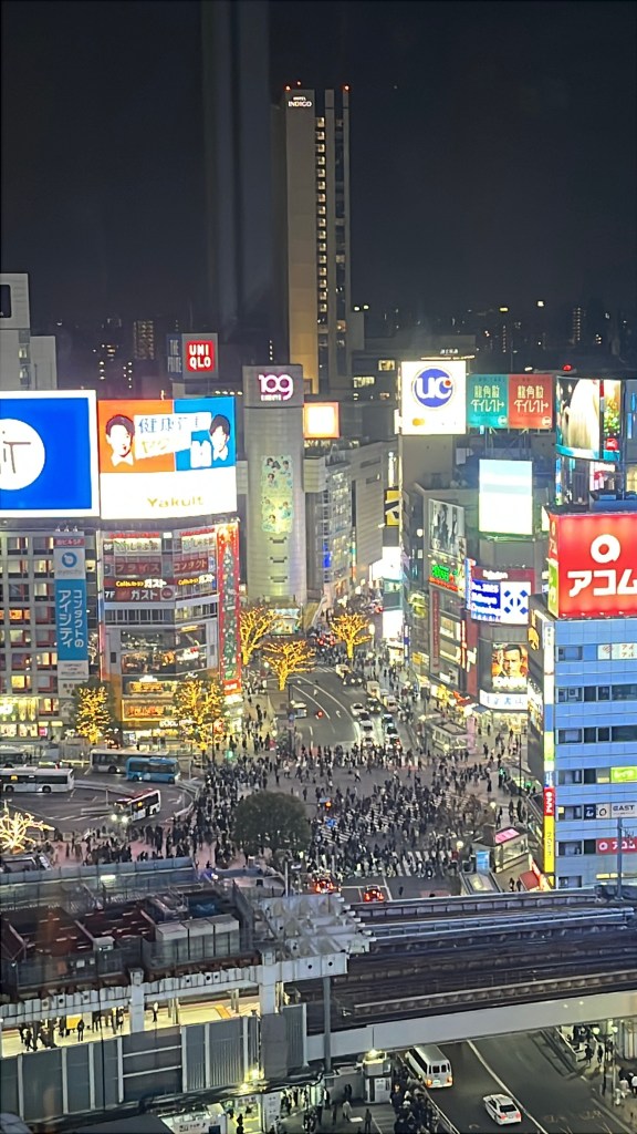 Tuesday, December 2: After school, we took the bus and train to the famous Shibuya Crossing, the world’s busiest pedestrian crossing. We arrived around 2:15pm, so were a bit early for the rush hour traffic. So we decided to run an errand we had been meaning to do for a while–take Charlotte to the optometrist to get her eyes tested. It turns out one of her eyes needs some extra help so she now has glasses for distance. And a cool story to tell about where she got her first pair! It was cheap, easy and so fast (less than an hour). From there, we did some window shopping and then positioned ourselves in the Starbucks that overlooks the crossing. Steffen caught a photo of some of us crossing as we approached the Starbucks. You can see us in the black circle on the photo below. We enjoyed a great view and some treats. We then headed to the 11th floor of Shibuya Hikarie for a different view. And then it was time for our daily sushi dinner!