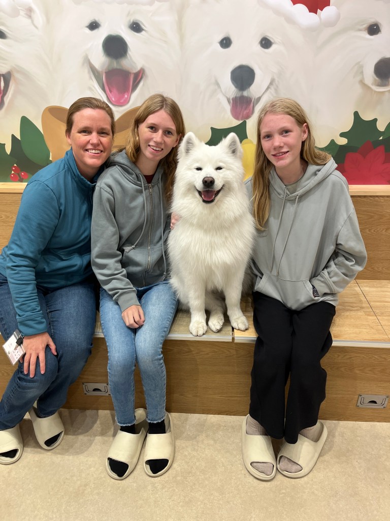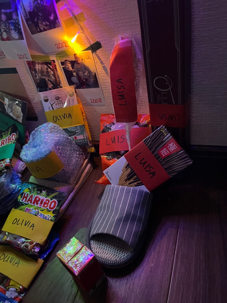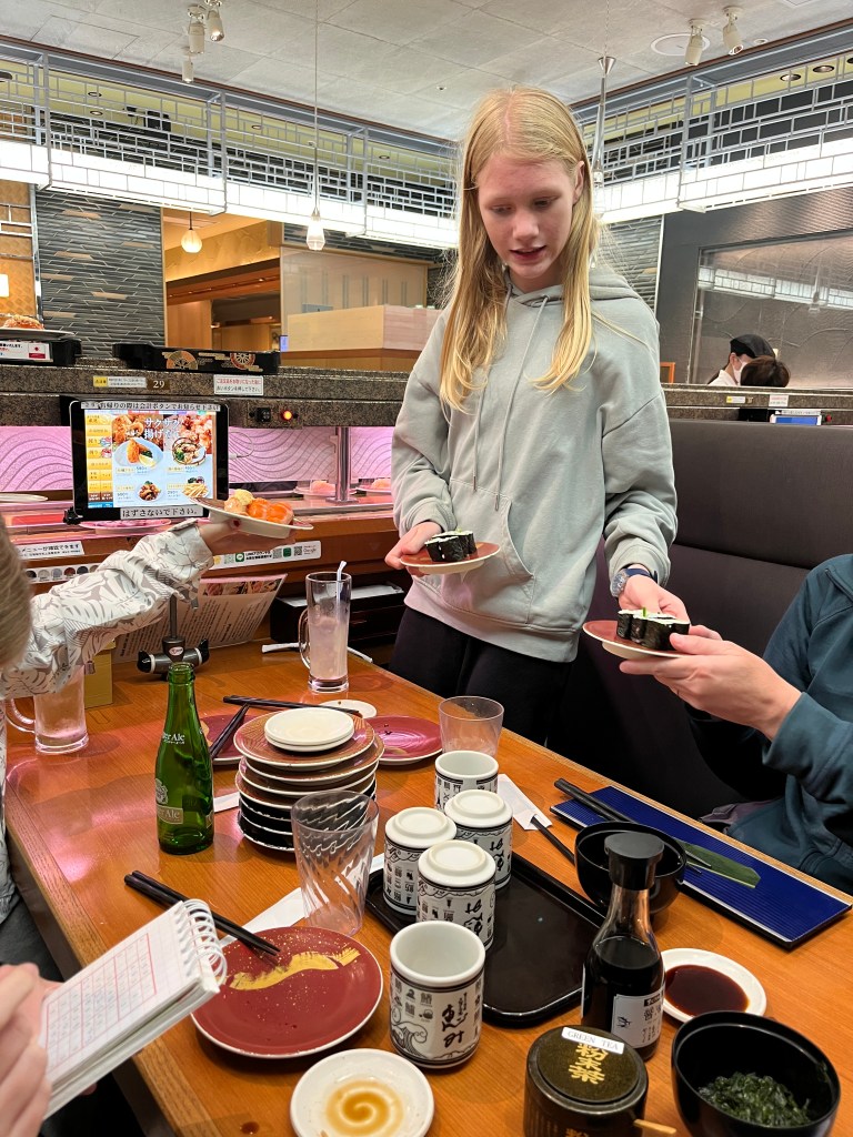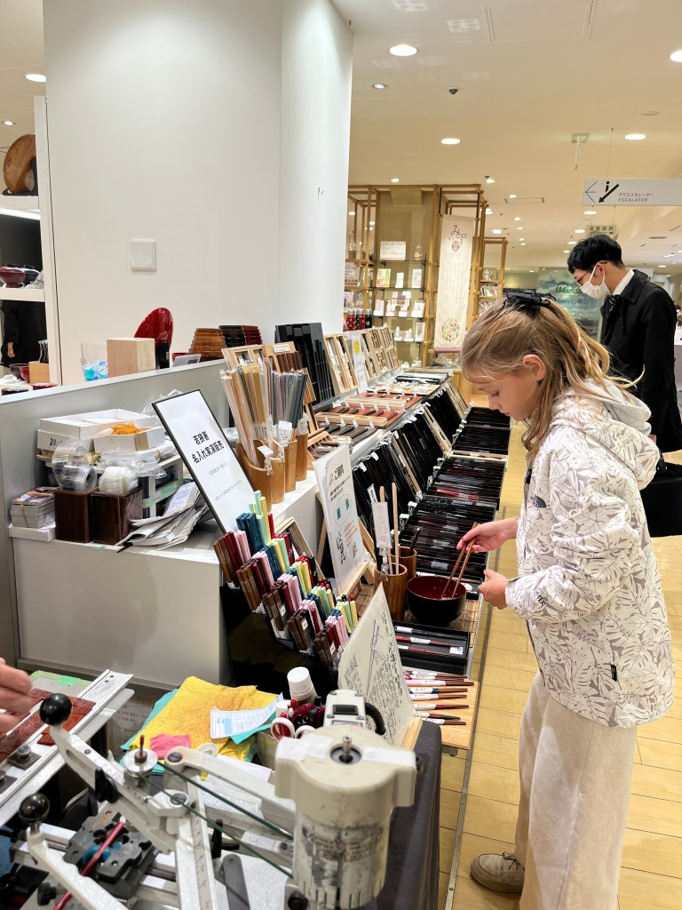 Friday, December 5: For our final day in Tokyo, we checked out the Imperial Palace (unfortunately it had closed so we couldn’t go in), walked over to the main train station and then into the Ginza shopping district. We wanted to go to Itoya, a huge and beautiful stationary store and then wandered the area, looking at all the high-end retailers. For the girls’ advent calendar that day, they were allowed to pick a pair of chopsticks. We came across a big department store and found some chopsticks that they would engrave. The girls were thrilled to pick out a pair of chopsticks and have their names in Japanese engraved on them. What a special souvenir! From there, we went to Kura sushi for our final sushi train experience in Japan. We ate so much wonderfully delicious food that month!