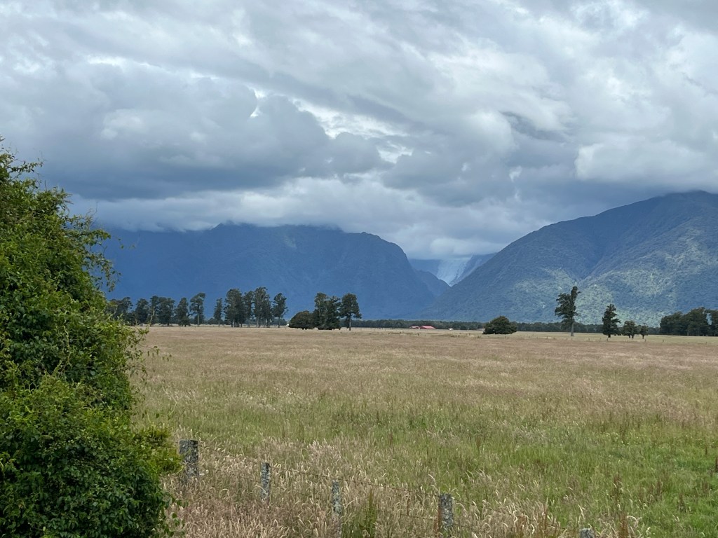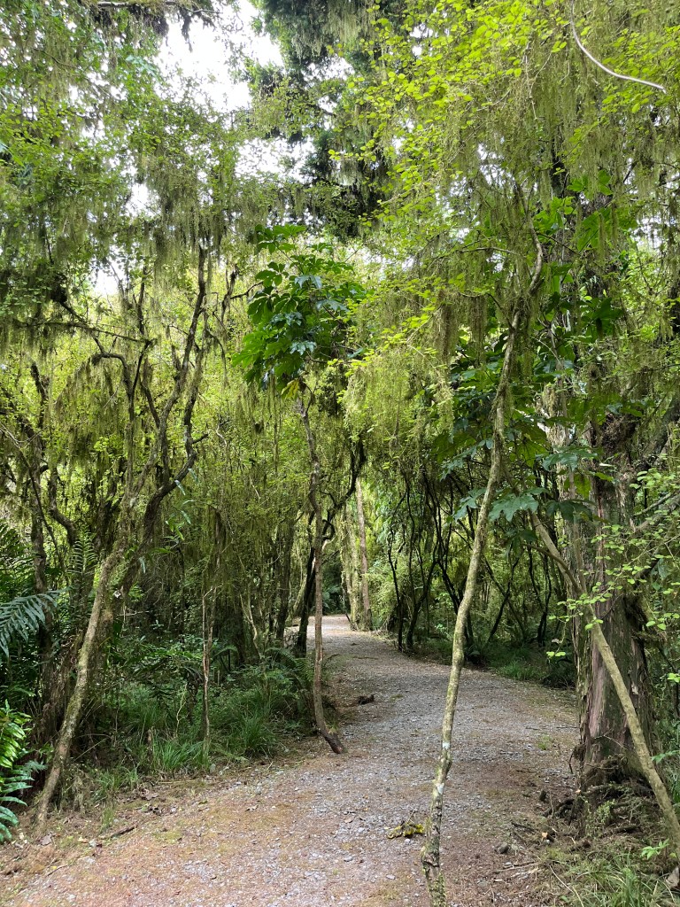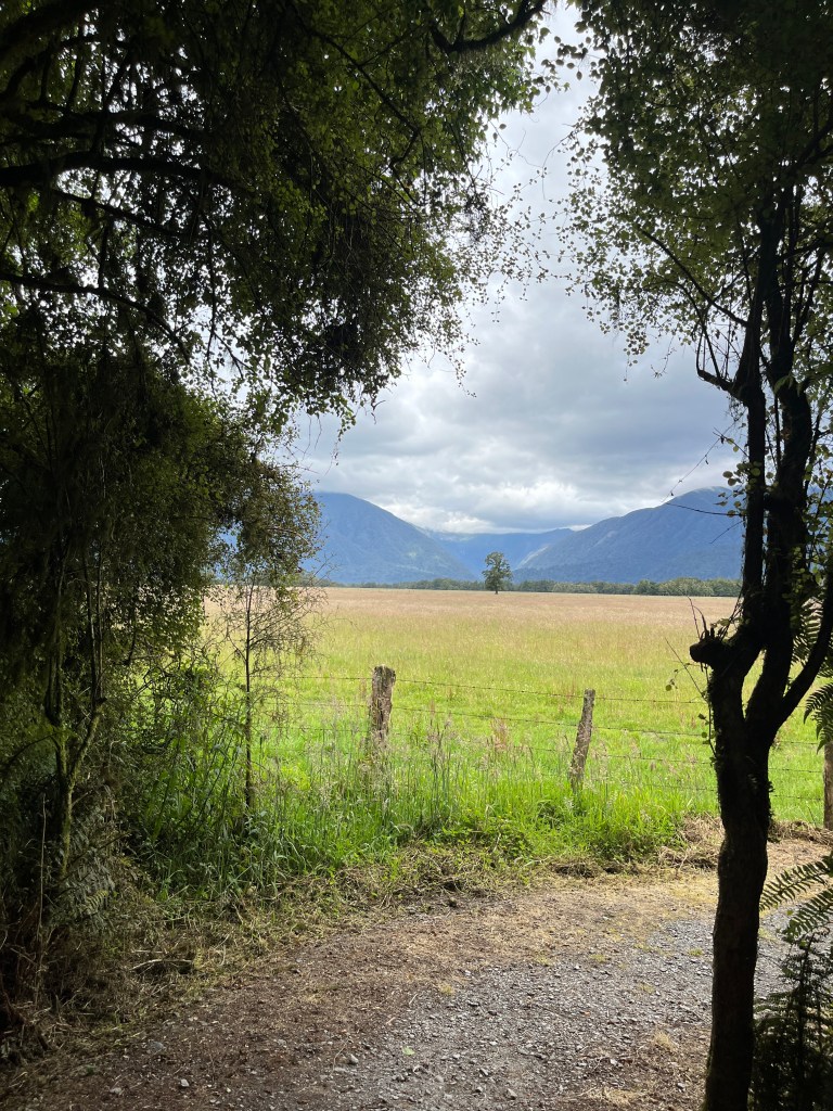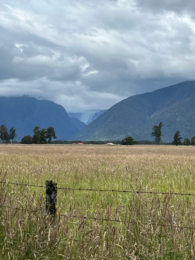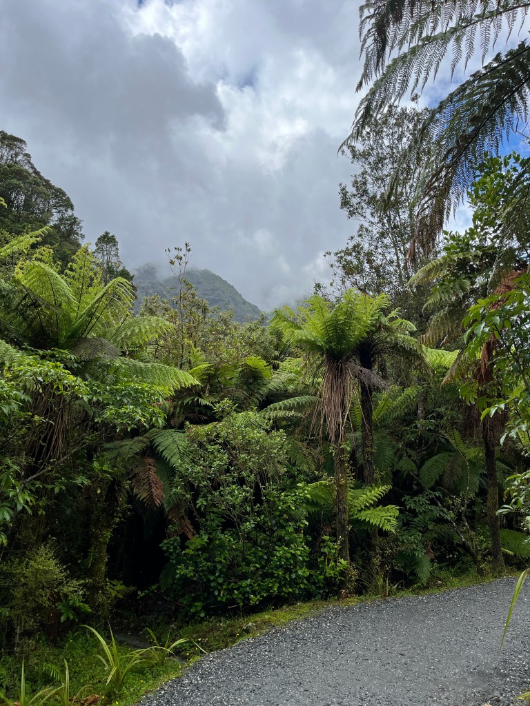 From there we drove about 20 minutes to the village of Fox Glacier where we dried off and had some lunch. I was hoping we would then take the hike to the viewpoint closest to the glacier but the family rebelled. So we drove to another viewpoint that the woman at the visitor centre had recommended, and we actually got a petty good view. It was very far away but the clouds lifted and you could spot it. Which made me happy. (It look like a giant waterfall where the two mountains form a V, way in the distance.) We spent some time relaxing there and went on a little walk through a nearby forest and listened to all the different birds.