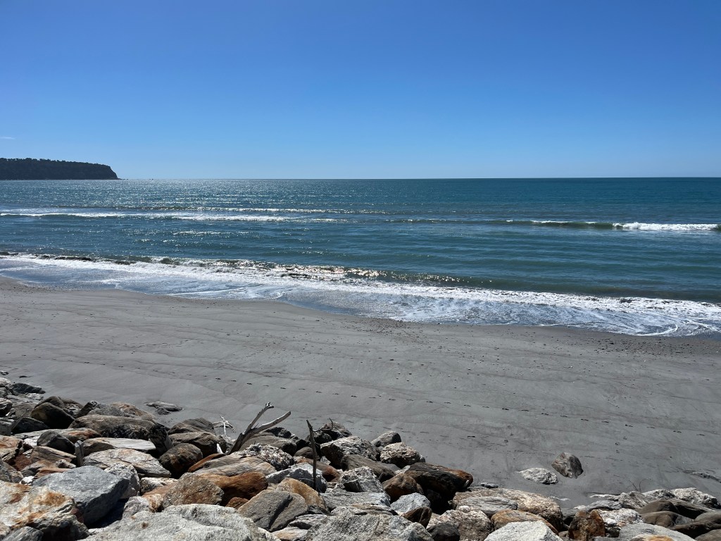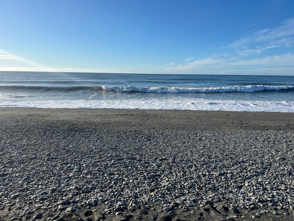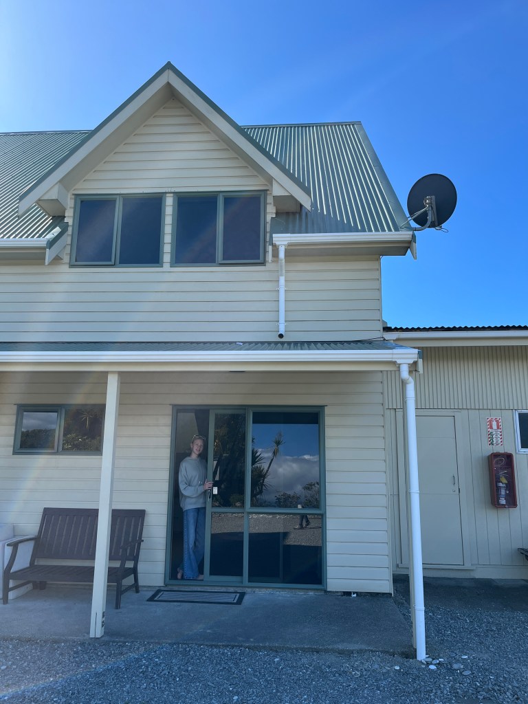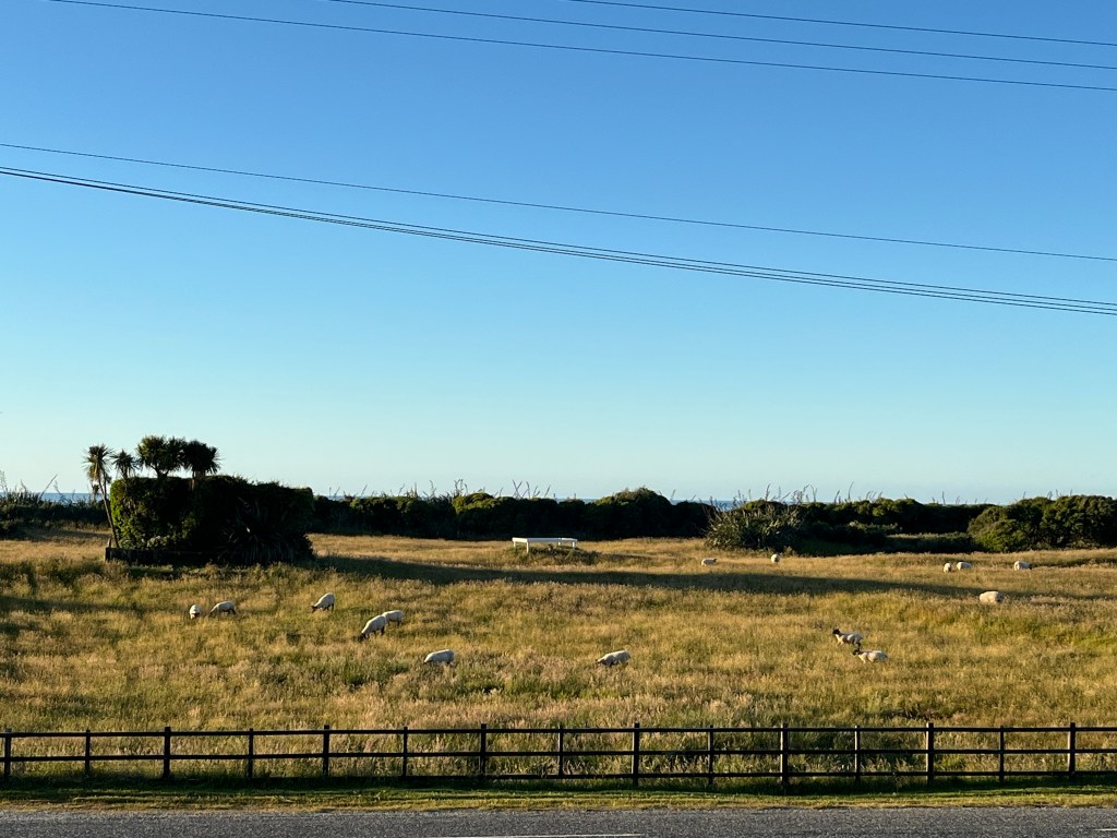 Then we got back in the car for our lest leg to Haast. That stretch of the highway was particularly winding and remote! But so beautiful. We stopped a few times at lookout points before arriving at our motel around 5:30pm, glad that we had broken up the drive into two days. The motel is great and, as advertised, remote. We have a view of…sheep! 🙂 You are never far from sheep when in New Zealand. There is also a little slice of the Tasman Sea that we can see which is about a 5 minute walk away.