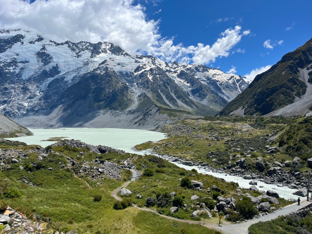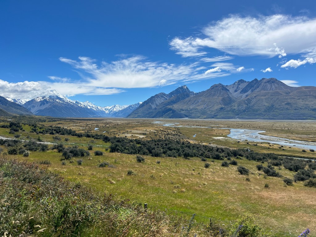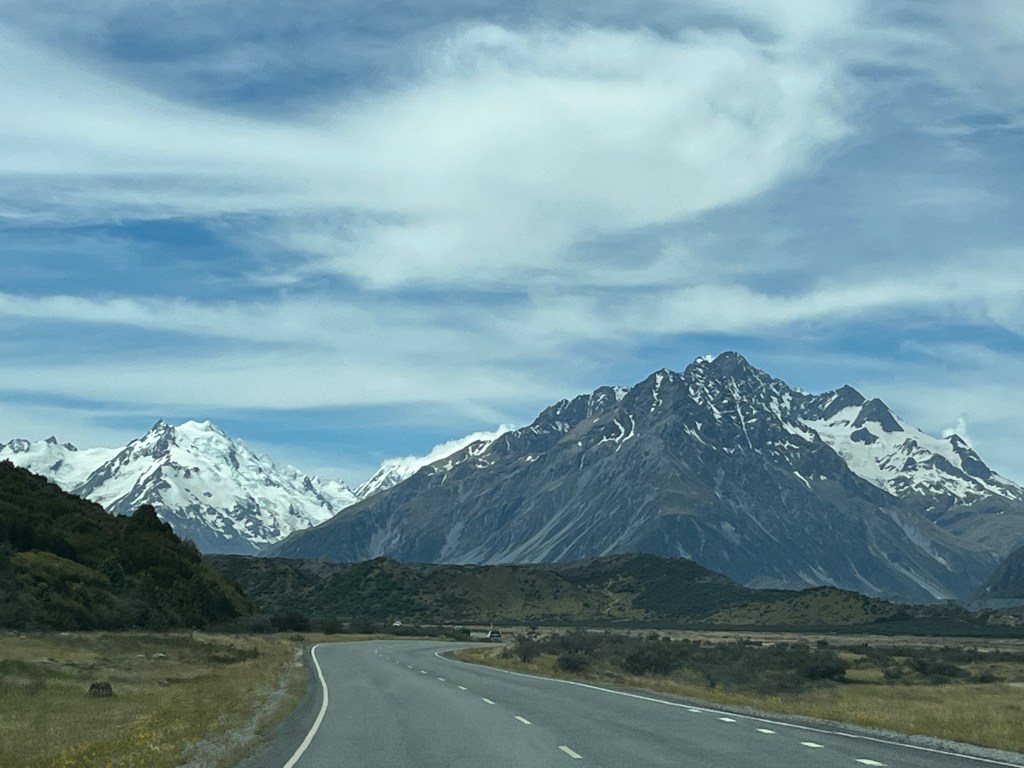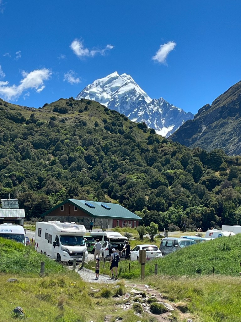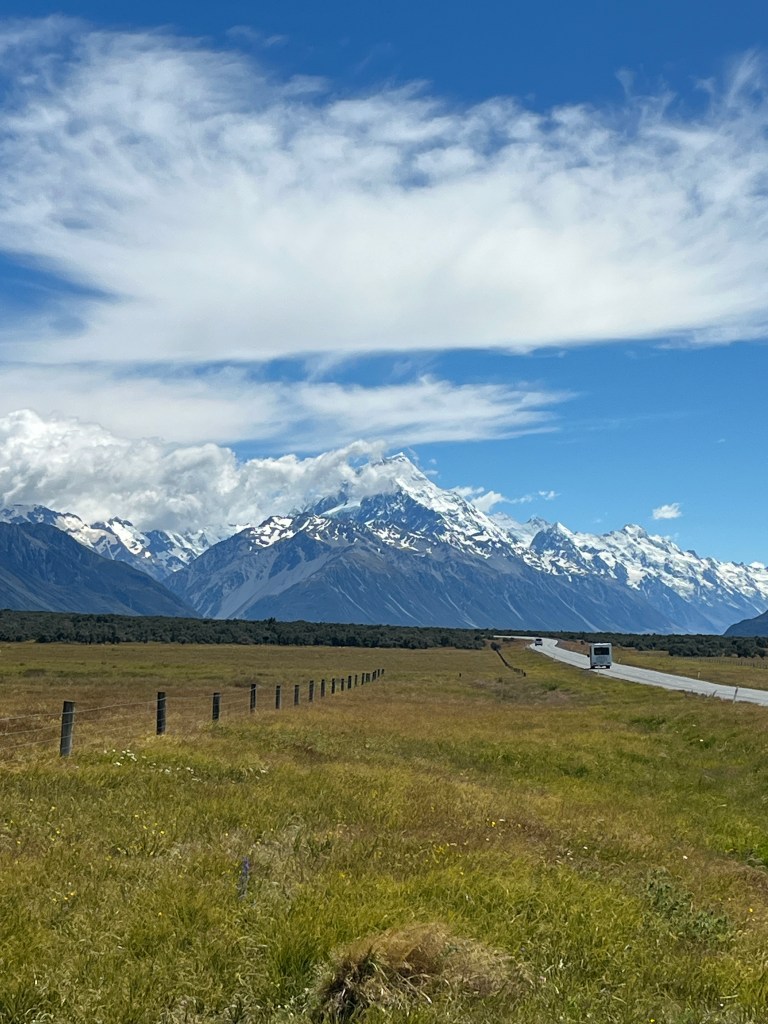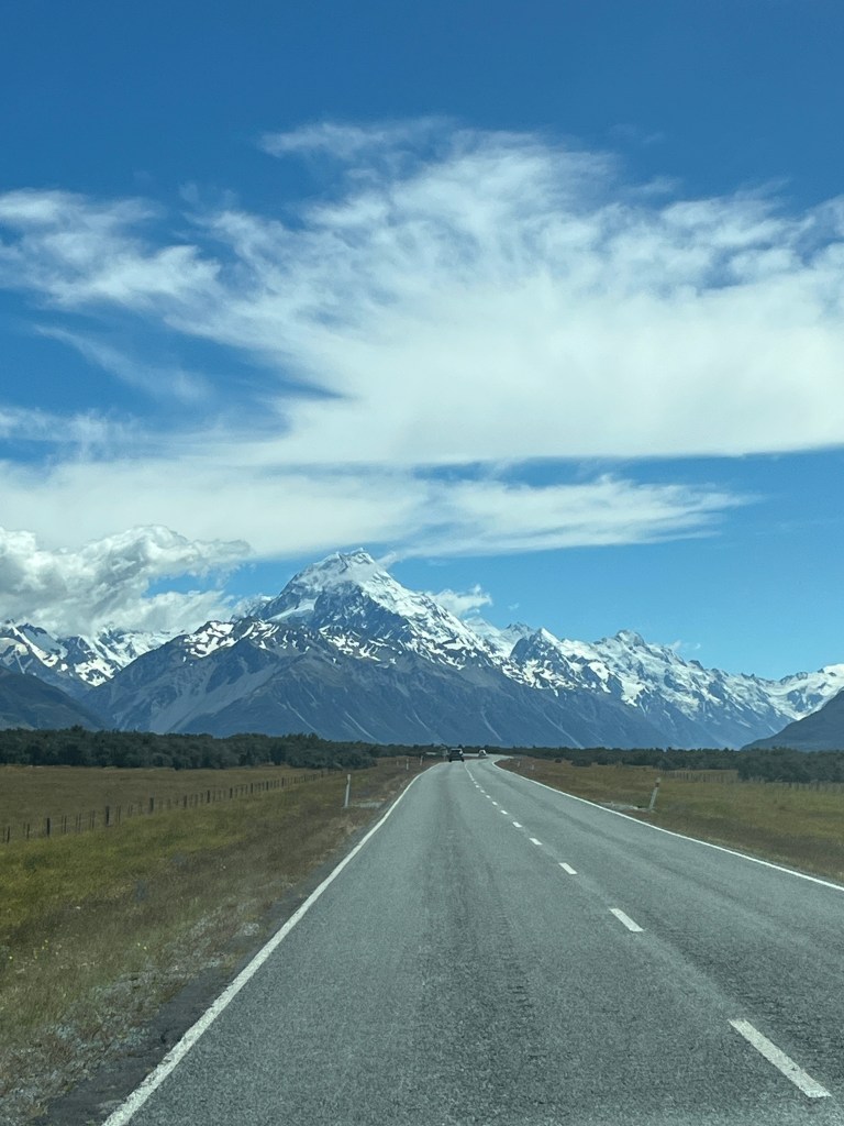 From there we drove towards Mt Cook and saw a hitchhiker on the side of the road. We picked him up, and he was a very nice Spanish man who has been travelling full-time for over 18 months. It was so fun to compare places we had in common and swap stories. He had just spent an extended period of time in Australia, so has some good tips for us. As we approached the parking lot, we were lucky enough to get some amazing views!