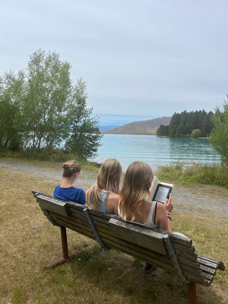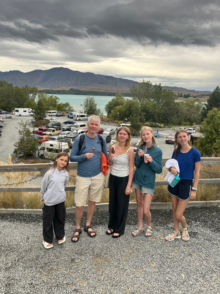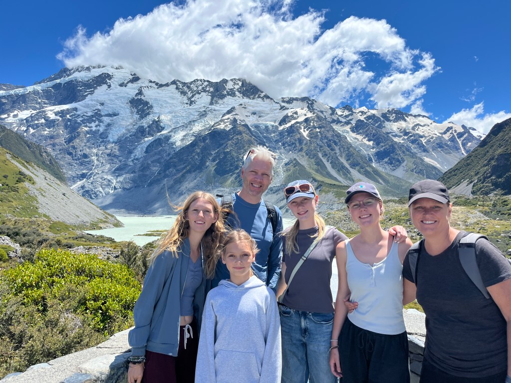On Friday, we wanted to visit Aoraki (aka Mt Cook) but first Olivia and Charlotte had to meet up (virtually) with their science teacher. Unfortunately both wifi and cellular service were limited at the campground, so we had to drive into town to do the call. Hannah also did her schoolwork then, and Luisa and I enjoyed a lovely breakfast together.