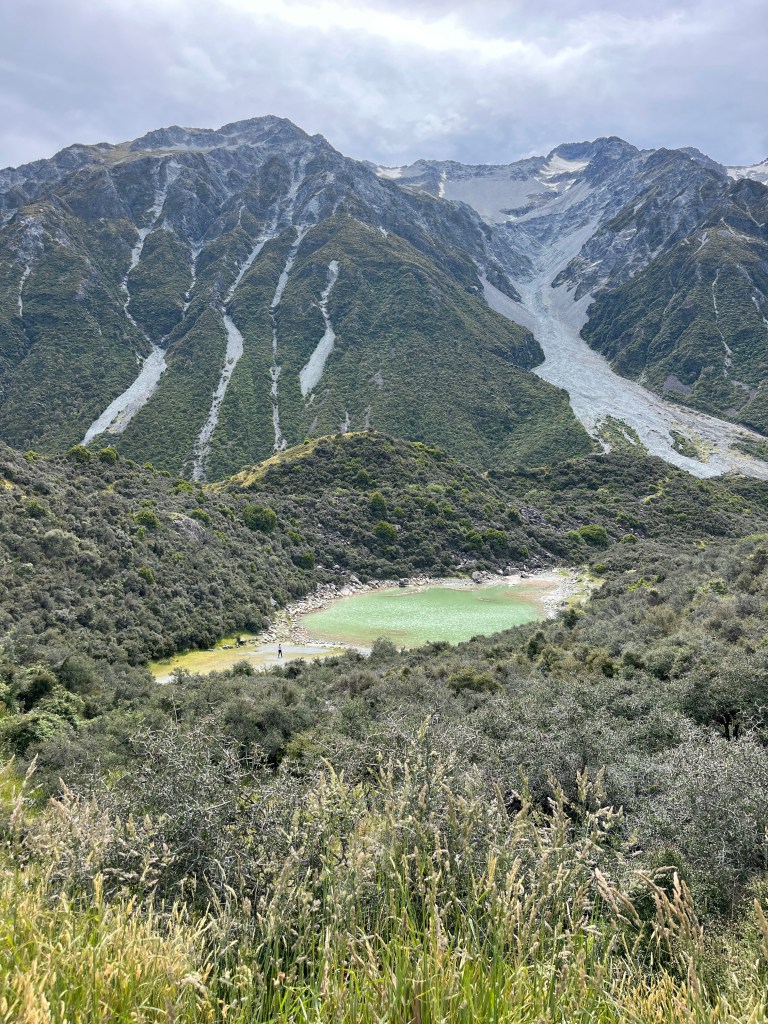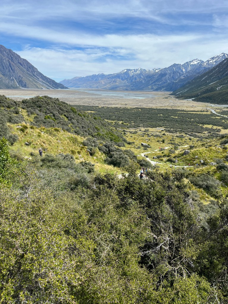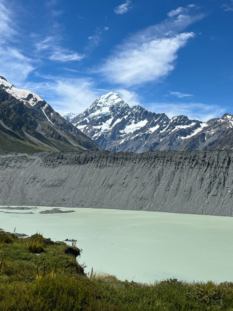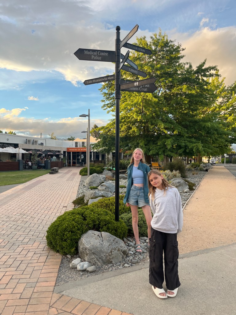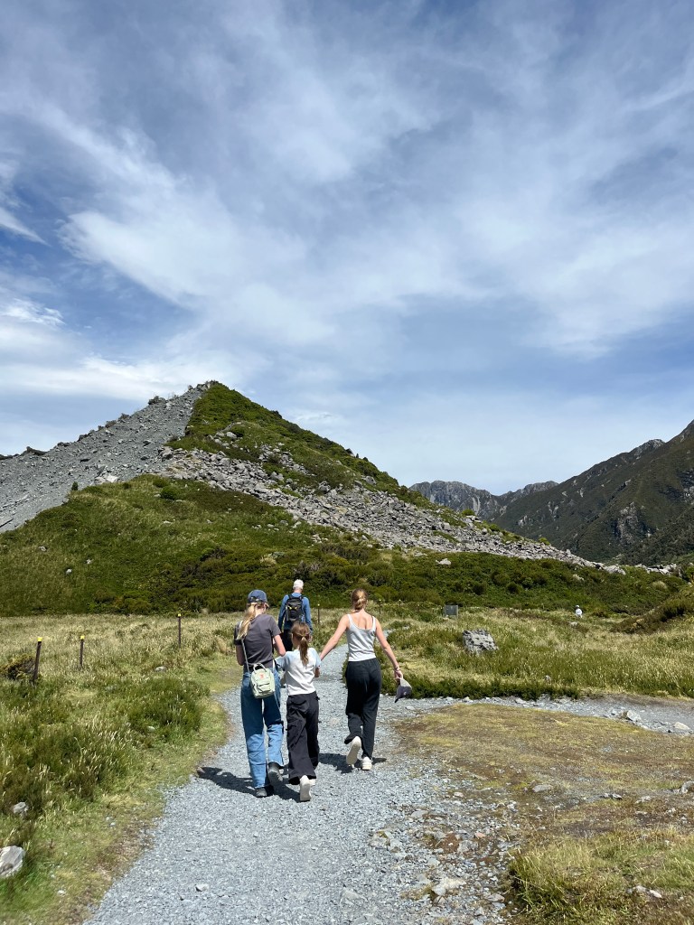 From there we drove to our final stop, the Tasman Glacier View Track. The Tasman Glacier is the longest glacier in New Zealand and you can see it (underneath all the sand) where it ends in the lake. There are also some sobering signs showing you how it has shrank over the years and the rapidly in which it is currently retreating. I feel very lucky that we have gotten to see this and that the girls have, too. I think it’s so important for them to learn about and experience these environmental degradation in order to take climate crisis seriously.