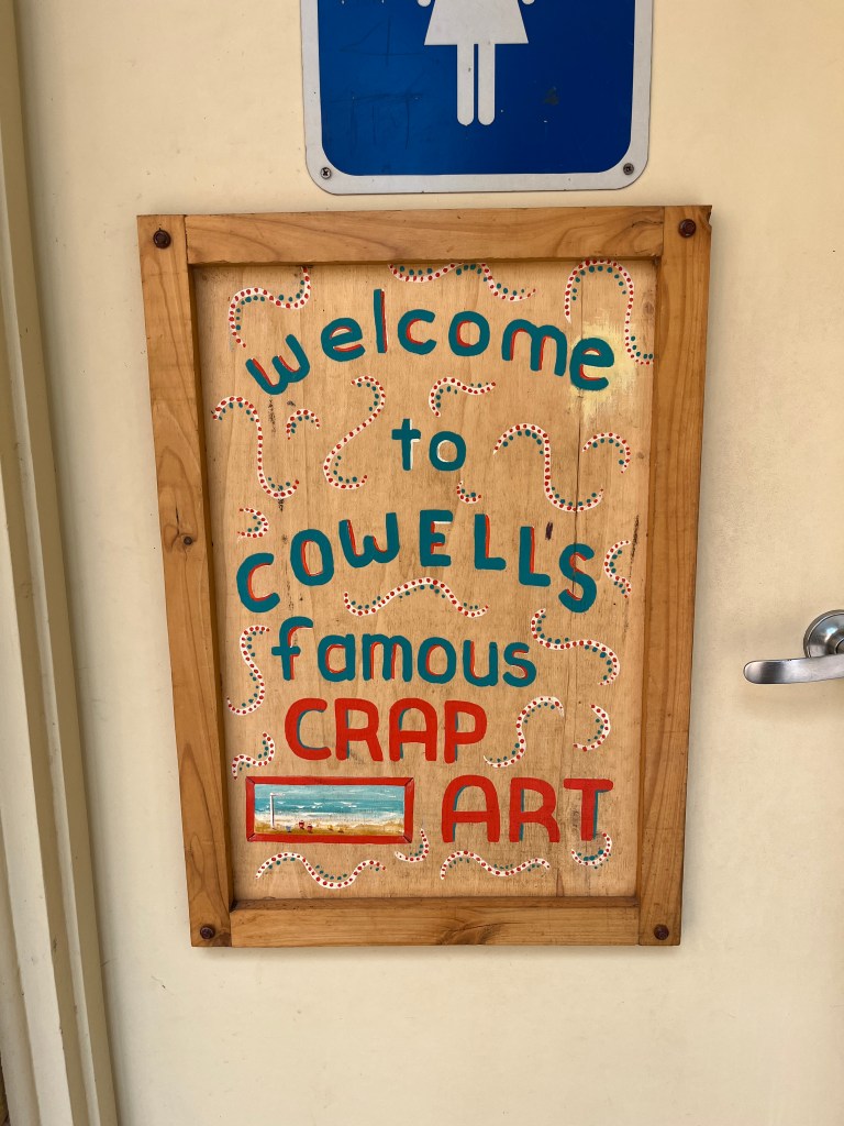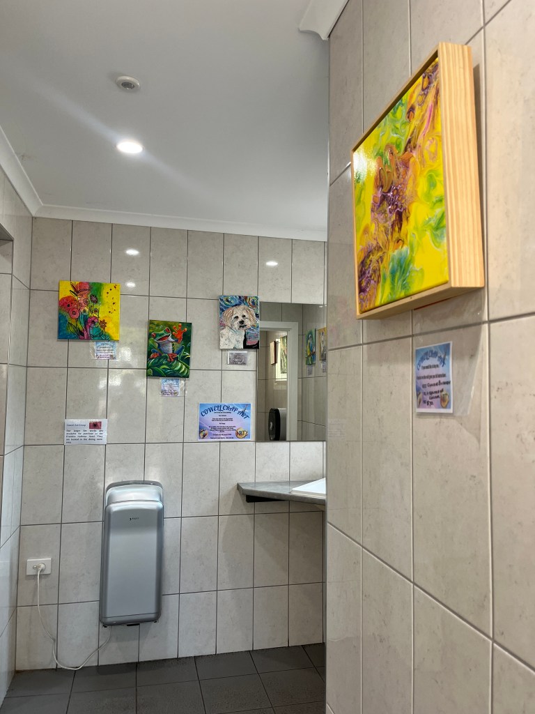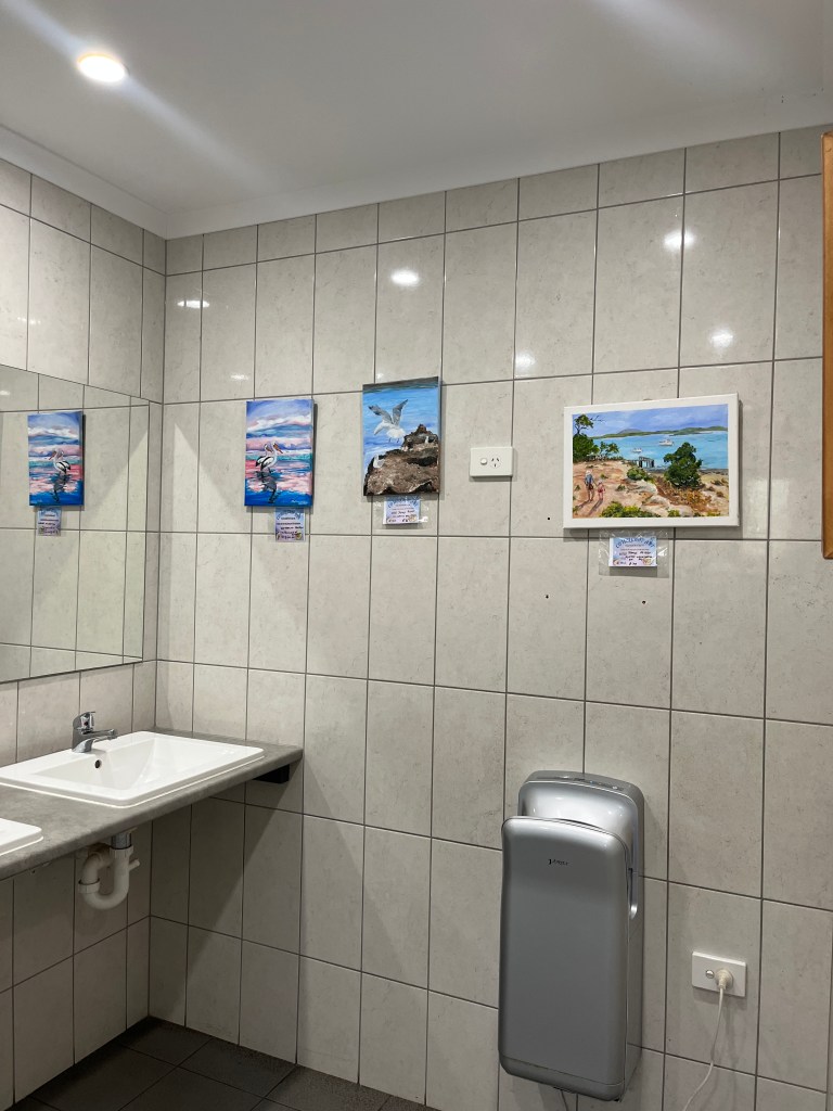 On Wednesday, February 11th, we were back in the car, this time for a longer drive to Port Lincoln. We stopped in Cowell for lunch and came across a unique public bathroom–an art gallery! Very fun.