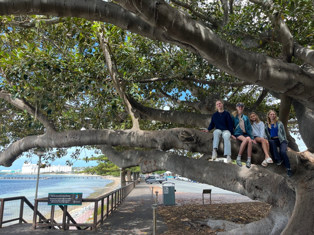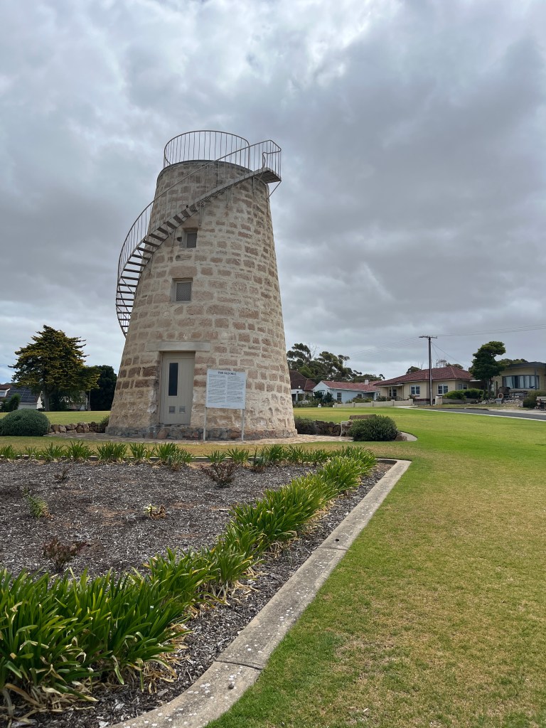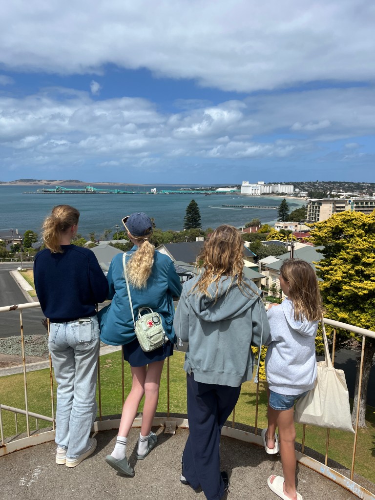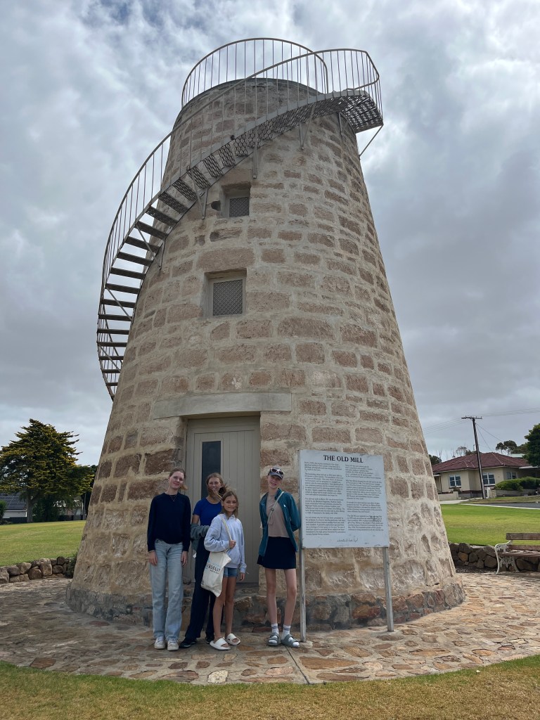 That afternoon the girls and I walked to the town jetty area where there is a “pool” in the ocean where people can swim safely away from the sharks. Unfortunately it was a bit too cold to swim so we continued our walk to the old mill. Then we went back into town for some playground time and ice cream. Then that evening we all went for a drive to the Winter Hill Lookout and then down to the marina for a glimpse of the cages used for shark diving. Port Lincoln is home to the largest commercial fishing fleet in the Southern Hemisphere so the marina is quite important.