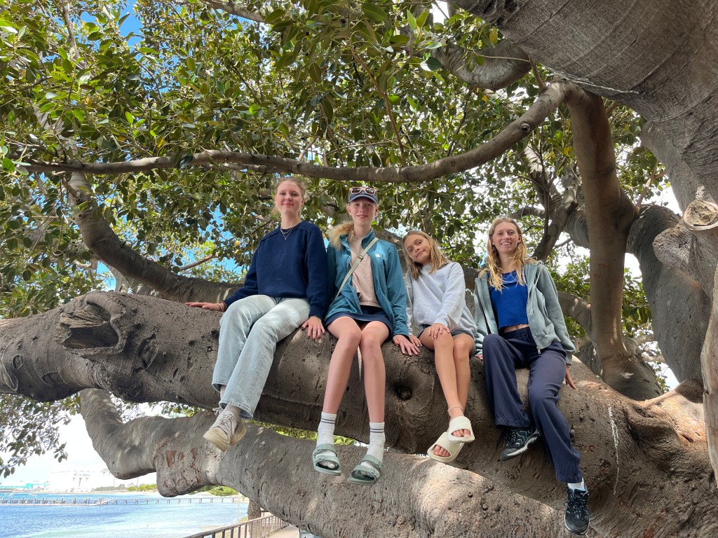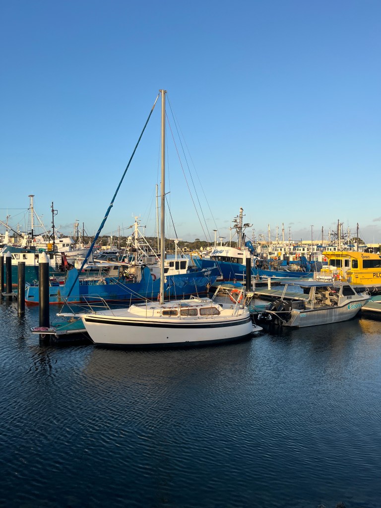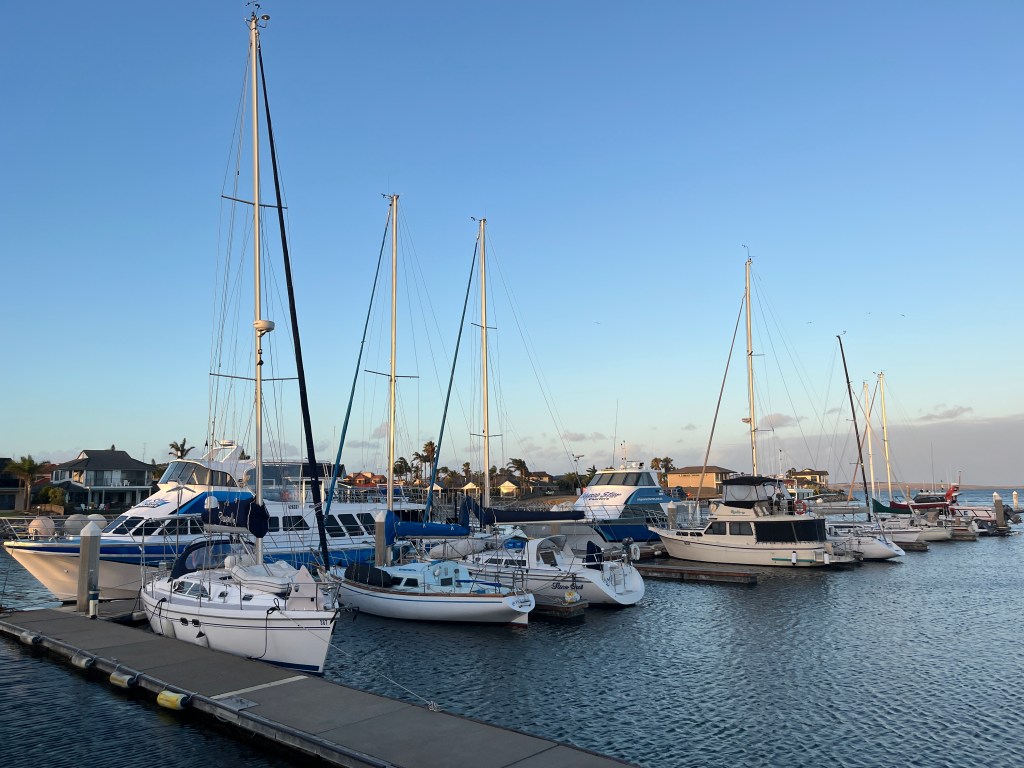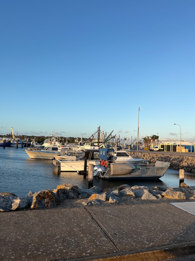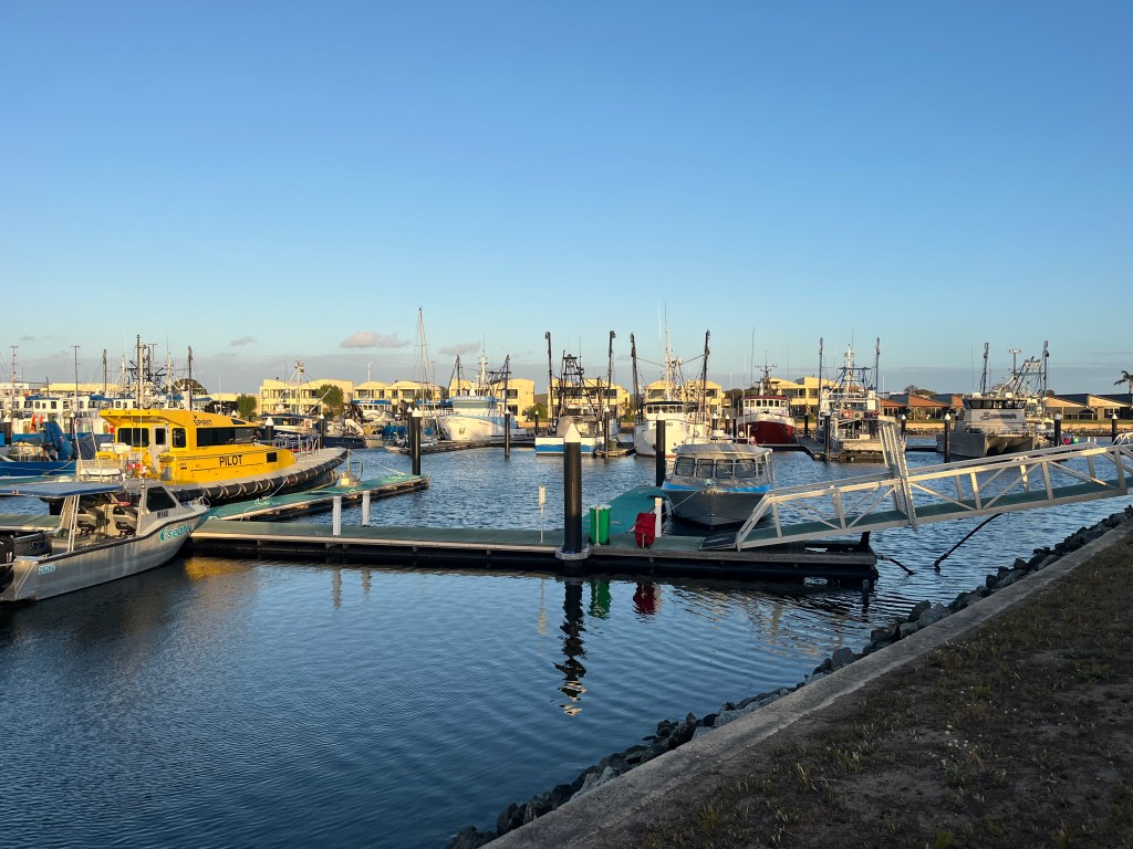 That afternoon the girls and I walked to the town jetty area where there is a “pool” in the ocean where people can swim safely away from the sharks. Unfortunately it was a bit too cold to swim so we continued our walk to the old mill. Then we went back into town for some playground time and ice cream. Then that evening we all went for a drive to the Winter Hill Lookout and then down to the marina for a glimpse of the cages used for shark diving. Port Lincoln is home to the largest commercial fishing fleet in the Southern Hemisphere so the marina is quite important.