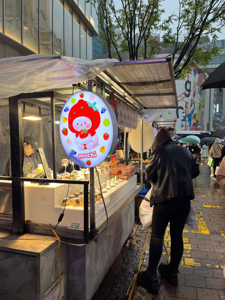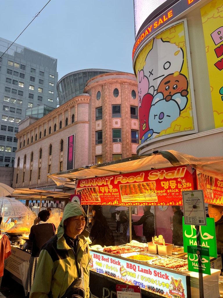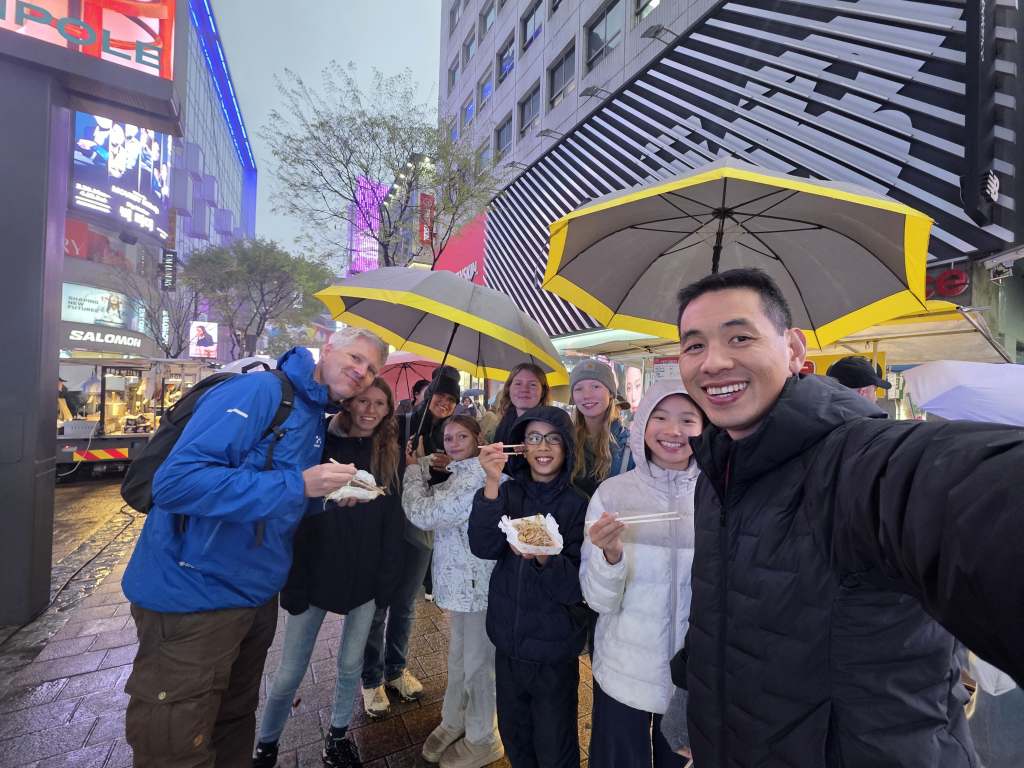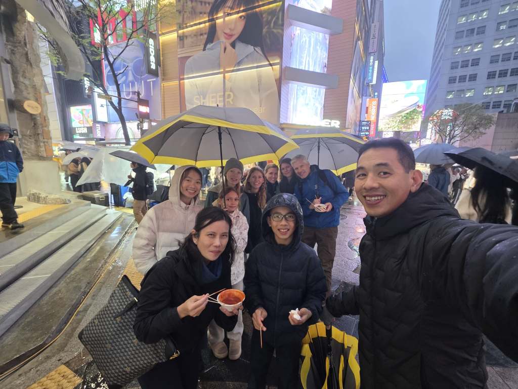 After that, we did something very fun. We surprised our friends from Melbourne!! Well, the wife and kids. We had met up with the husband while we were in Sydney and realized that we had about 36 hours of overlap in Seoul, so we started plotting. He kept it a secret from his family, so we surprised them in their hotel lobby Thursday evening. Very fun! From their hotel we walked through the rain to the Myeongdong Night Market. We sampled several different stalls, having fun trying bites of this and that while trying to remain somewhat dry. And, of course, we snuck into a shop or two along the way. We ended the evening in the warmth of the Starbucks where we could catch up a bit better.