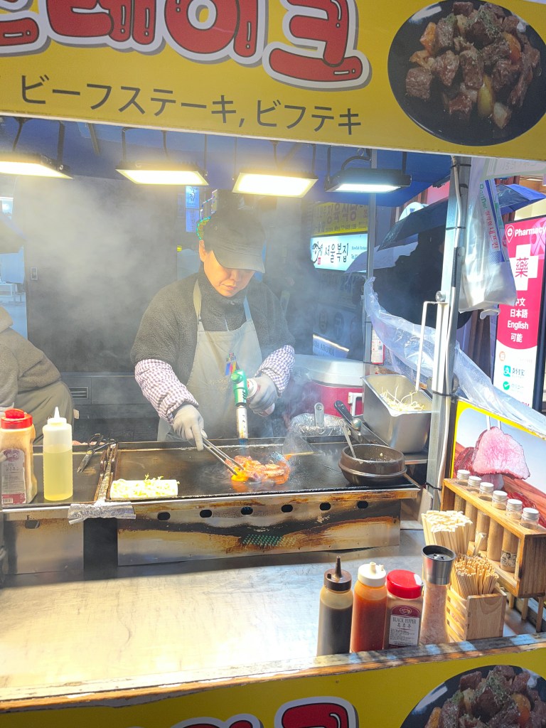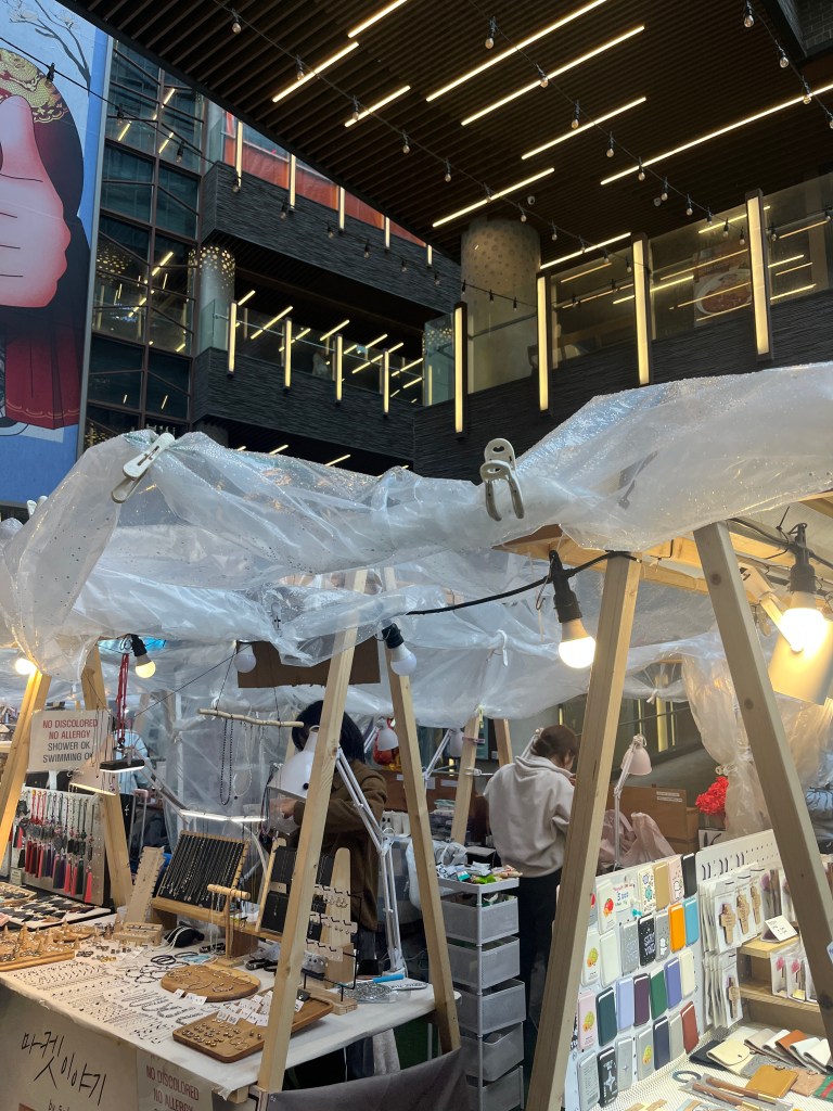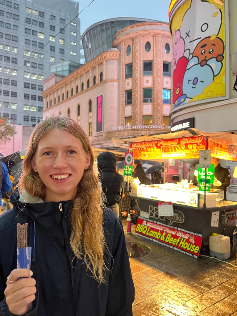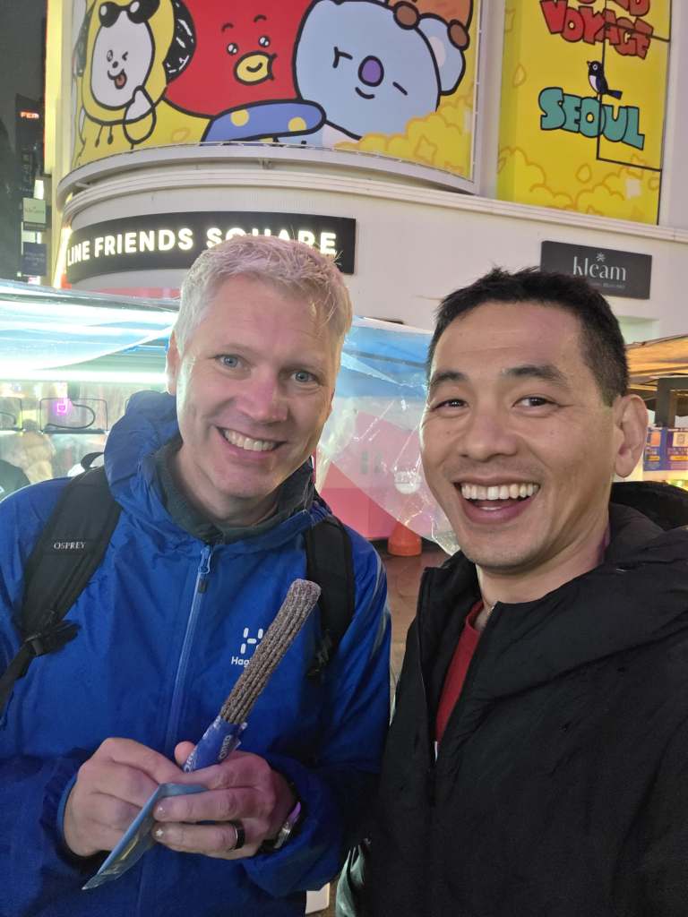 After that, we did something very fun. We surprised our friends from Melbourne!! Well, the wife and kids. We had met up with the husband while we were in Sydney and realized that we had about 36 hours of overlap in Seoul, so we started plotting. He kept it a secret from his family, so we surprised them in their hotel lobby Thursday evening. Very fun! From their hotel we walked through the rain to the Myeongdong Night Market. We sampled several different stalls, having fun trying bites of this and that while trying to remain somewhat dry. And, of course, we snuck into a shop or two along the way. We ended the evening in the warmth of the Starbucks where we could catch up a bit better.