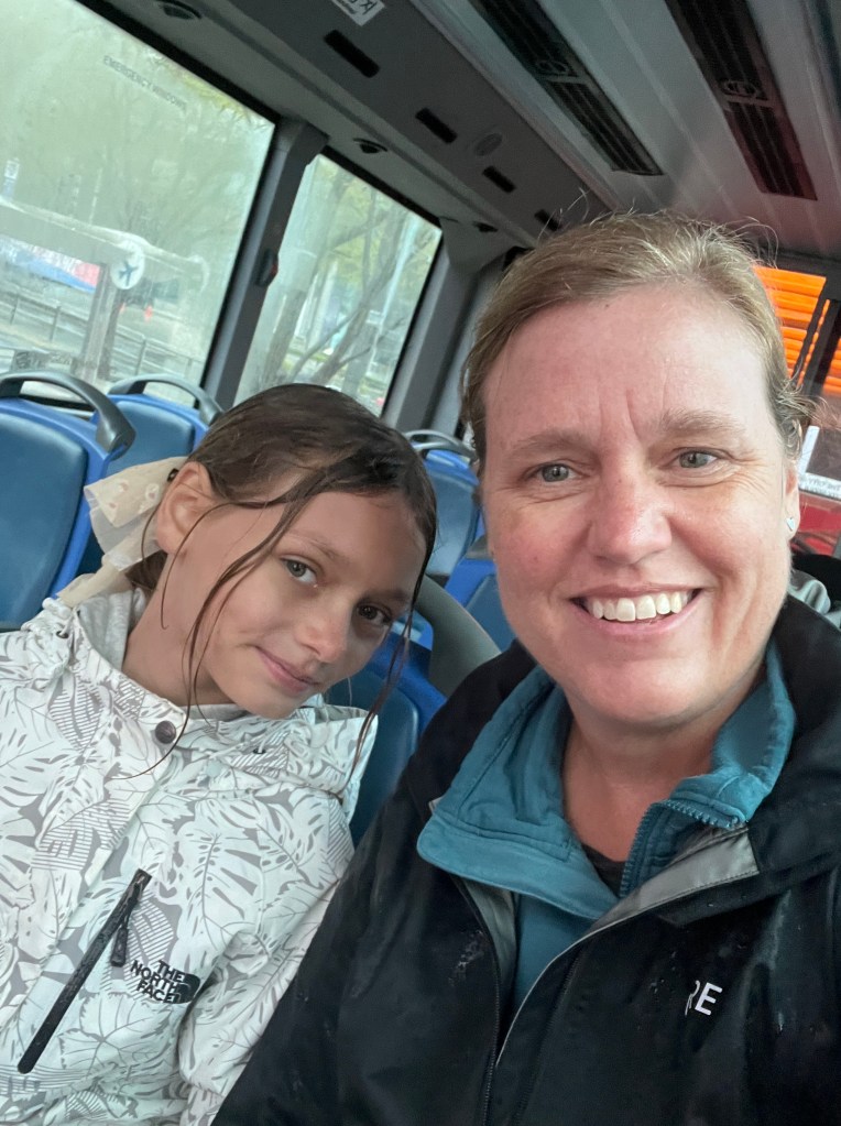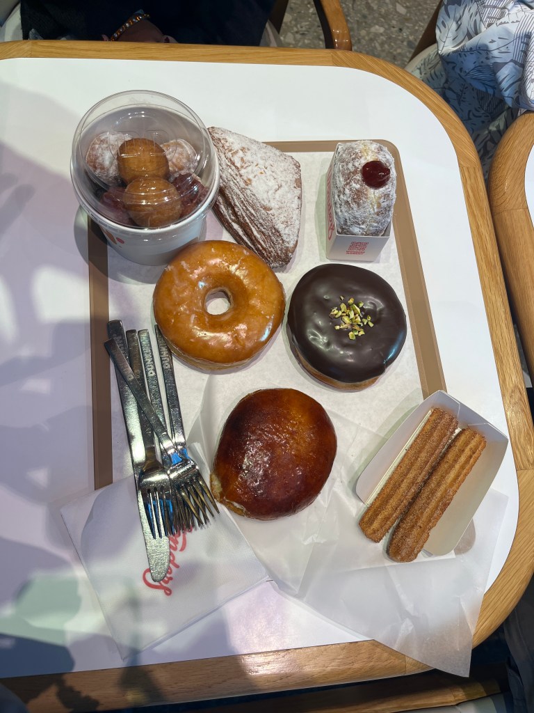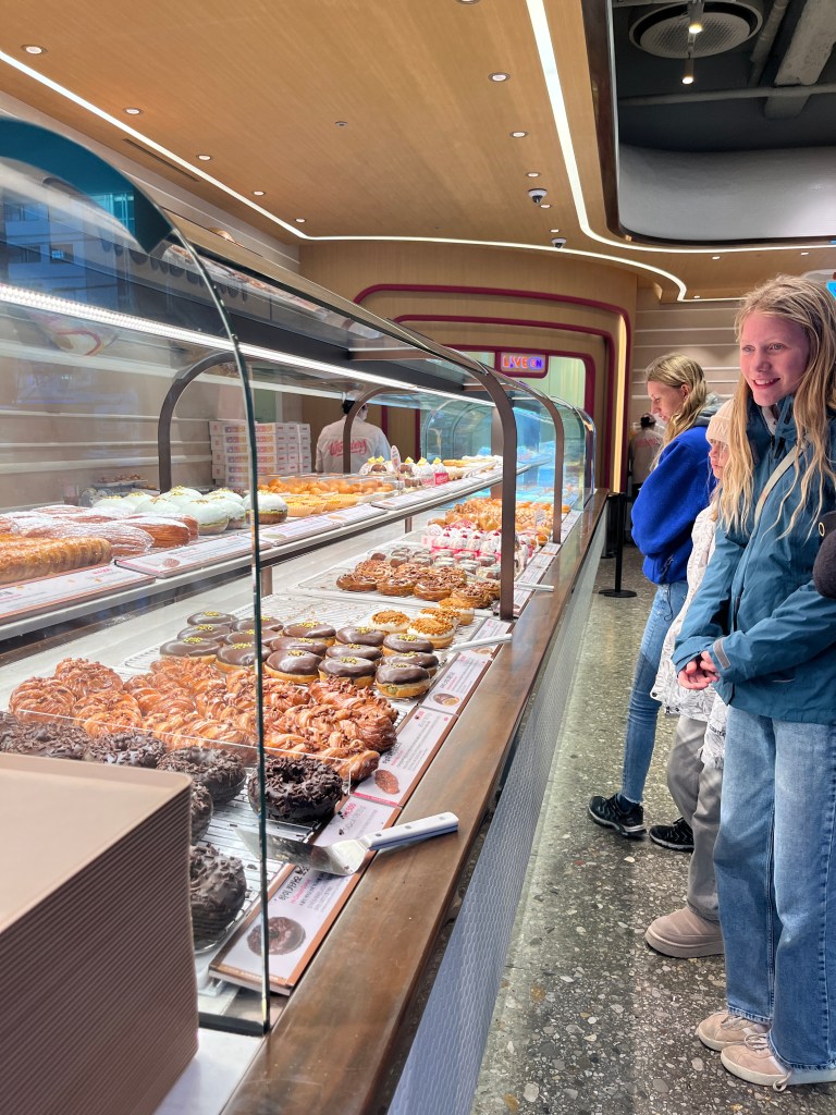 From there we made our way all.the.way across the city (in traffic!) to see a giant Dunkin Donuts (Olivia’s current obsession). We were rewarded with a beautiful view as we searched for the bus stop on the way there. And the treats were wonderful! By then, we were all exhausted from our long day and ready for bed.