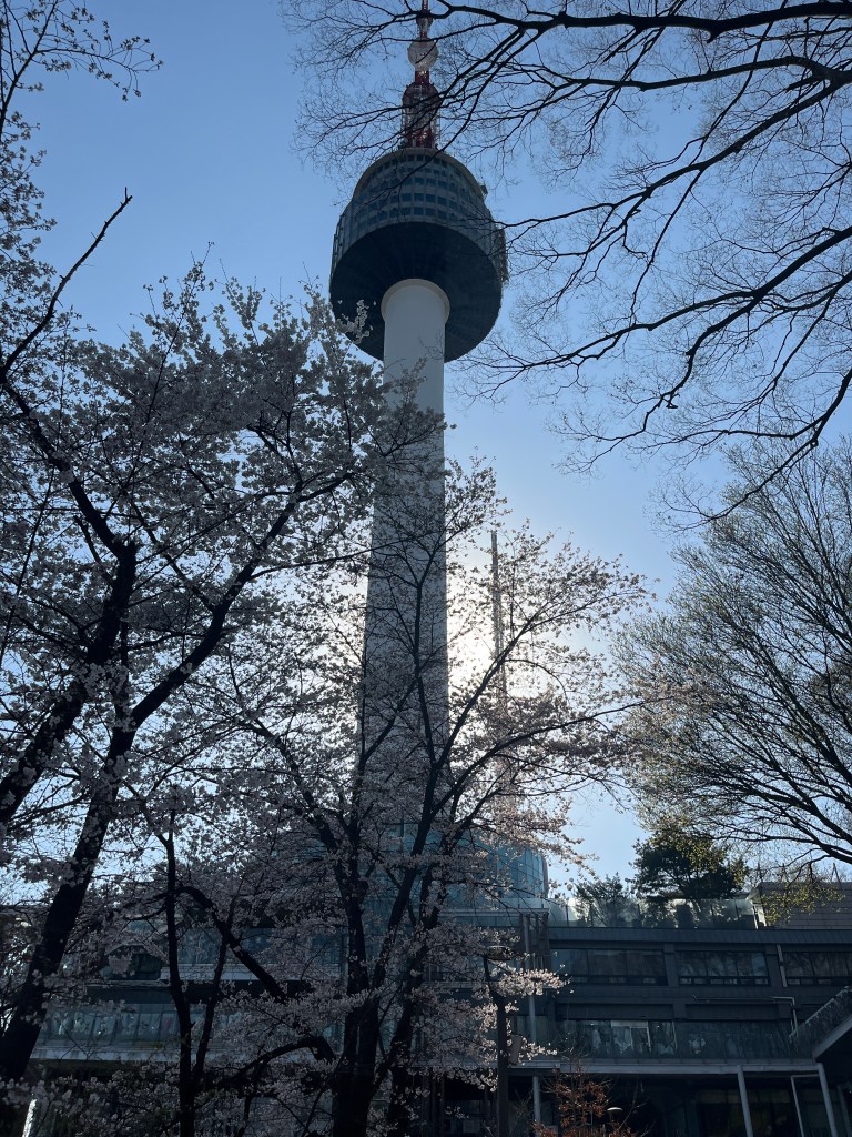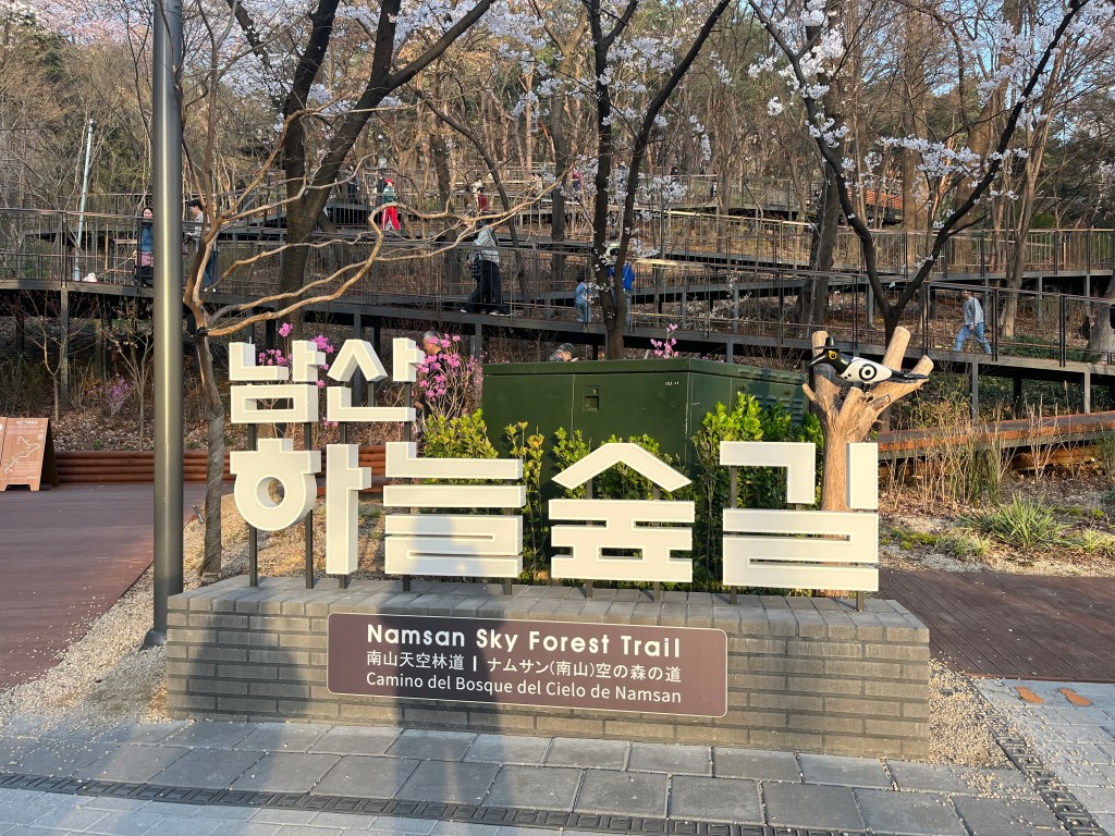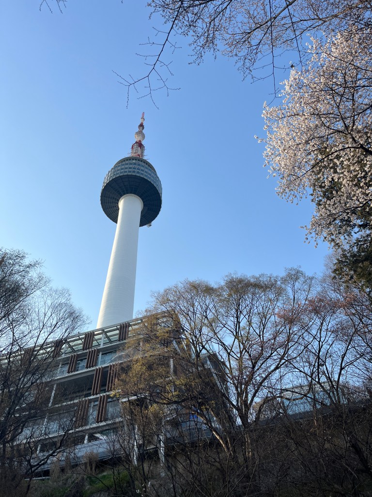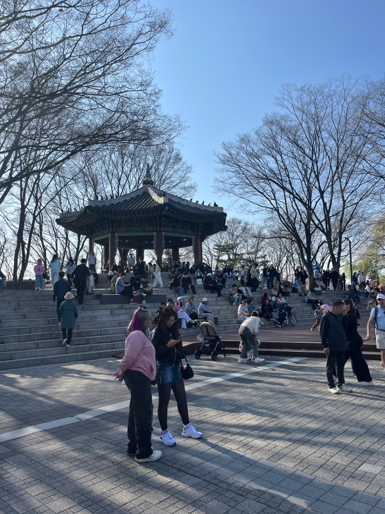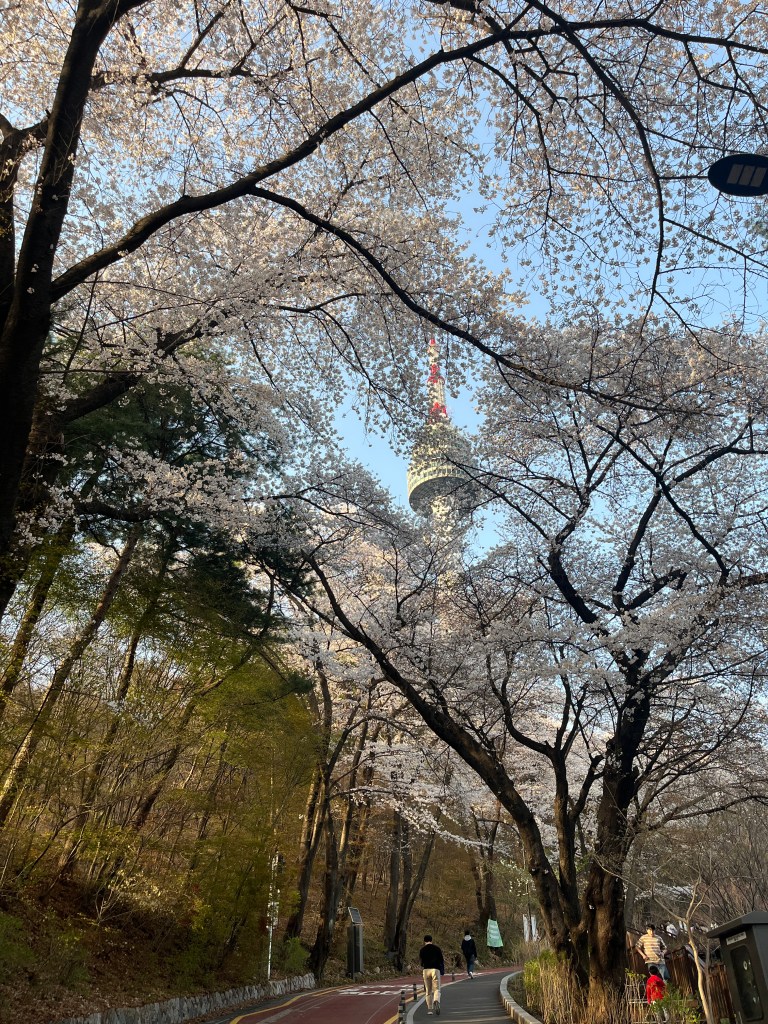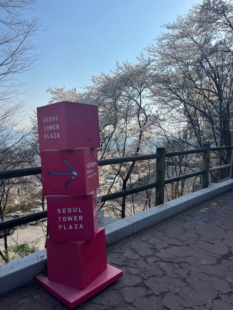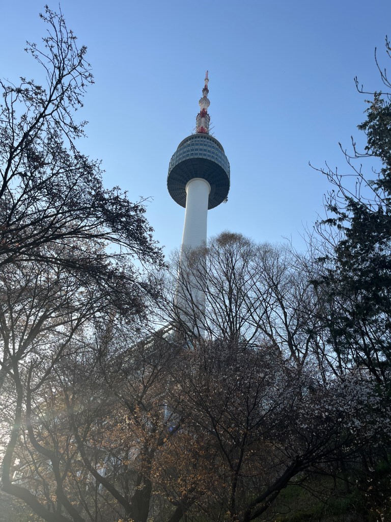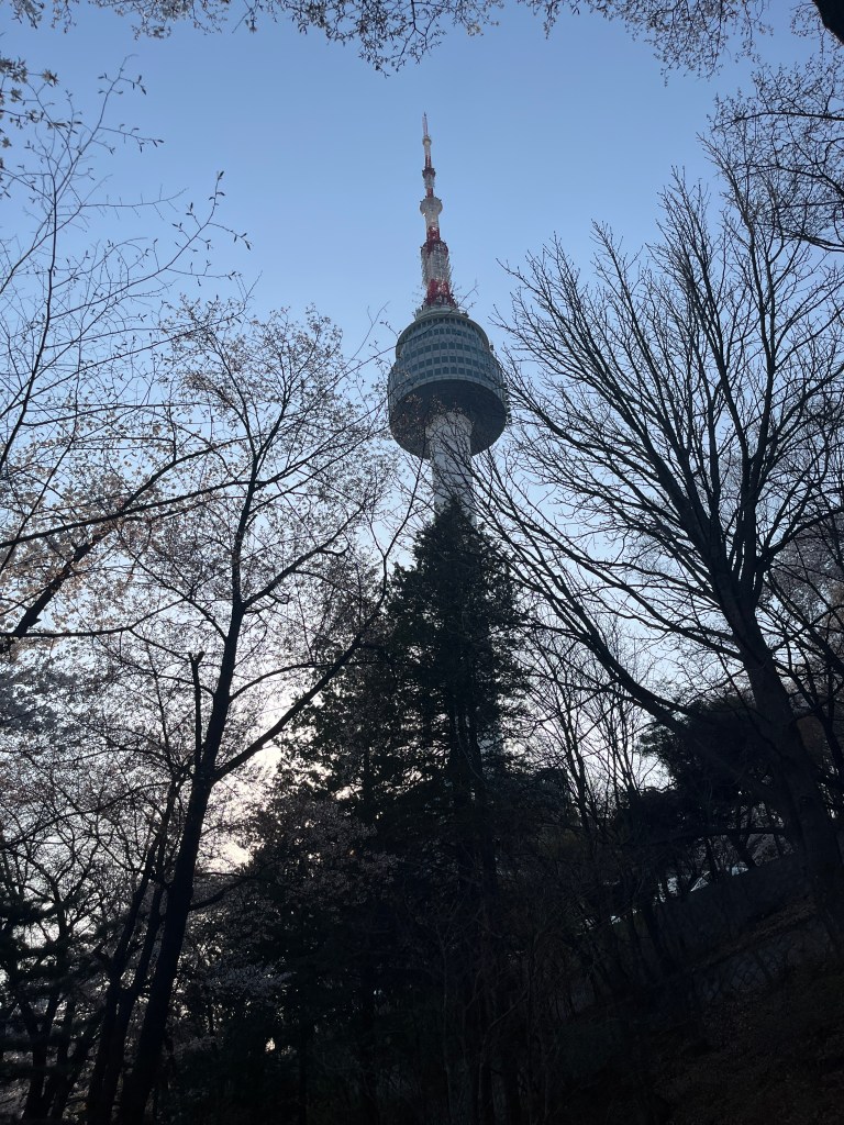 Then in the afternoon, Hannah, Charlotte, Luisa and I went out to explore while Olivia recuperated and Steffen helped her. We took the bus over to N Seoul Tower and then took a walk through Namsan park. The bus was very easy to figure out, though the traffic in Seoul is terrible! Not chaotic but a lot of it. I’m still amazed at how little traffic there was in Tokyo…. We spotted these traffic signals in the street that I had heard about online. What I had heard was they placed them there so that people would notice the signal change while looking at their phones, but when we saw them in action at night, it was clear how much safer they are. We enjoyed wandering the streets a bit and taking everything in.