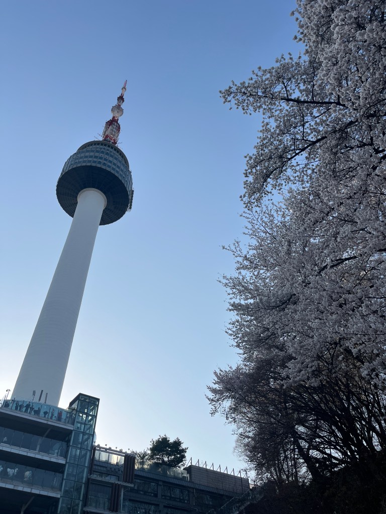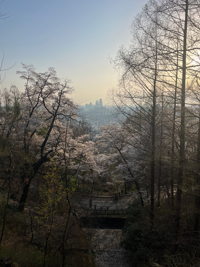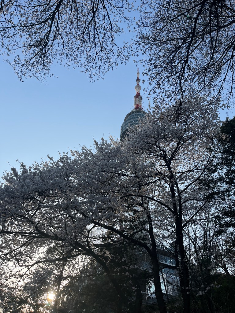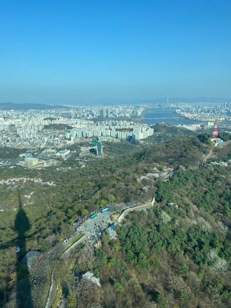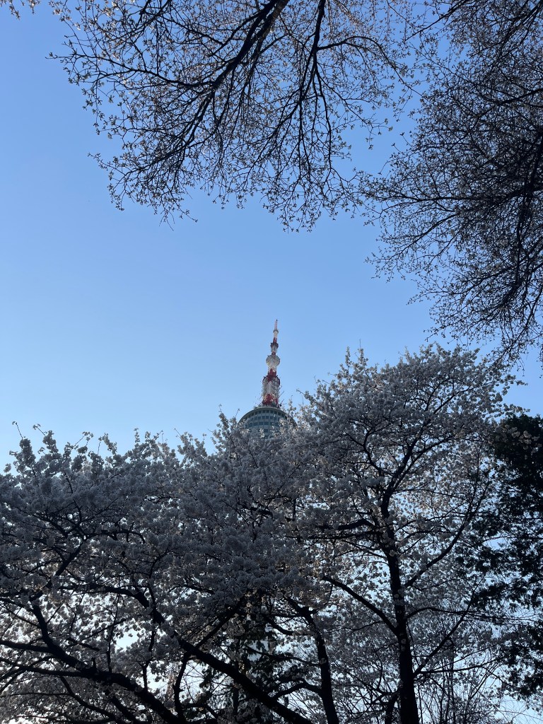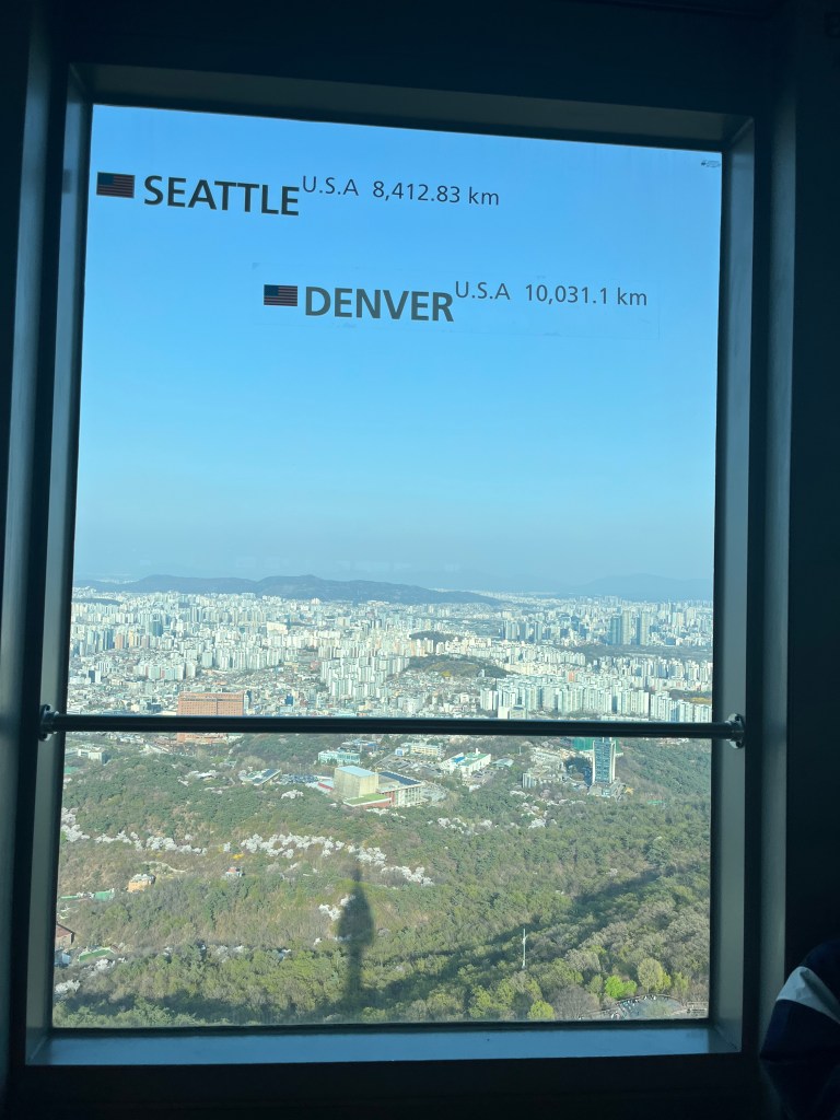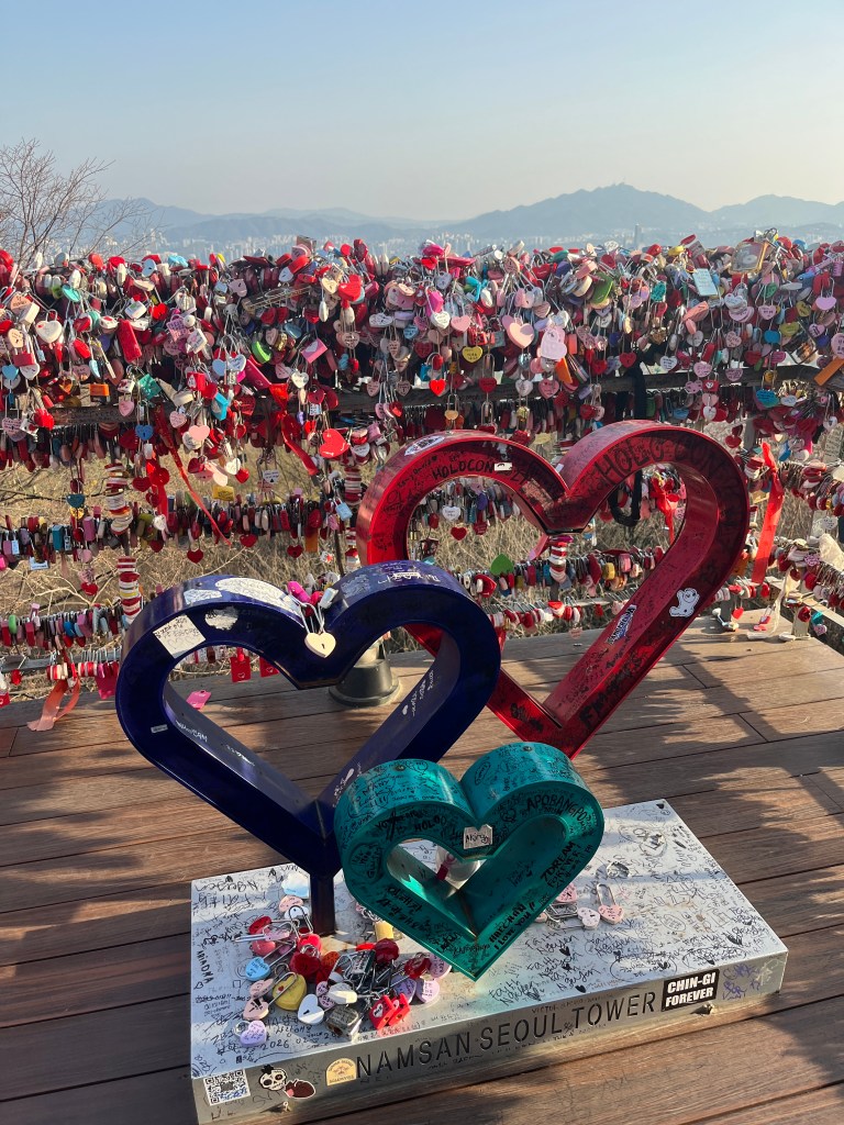Then in the afternoon, Hannah, Charlotte, Luisa and I went out to explore while Olivia recuperated and Steffen helped her. We took the bus over to N Seoul Tower and then took a walk through Namsan park. The bus was very easy to figure out, though the traffic in Seoul is terrible! Not chaotic but a lot of it. I’m still amazed at how little traffic there was in Tokyo…. We spotted these traffic signals in the street that I had heard about online. What I had heard was they placed them there so that people would notice the signal change while looking at their phones, but when we saw them in action at night, it was clear how much safer they are. We enjoyed wandering the streets a bit and taking everything in.