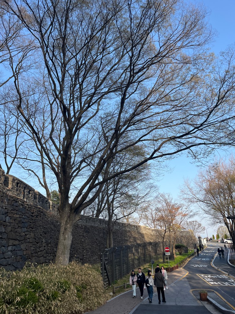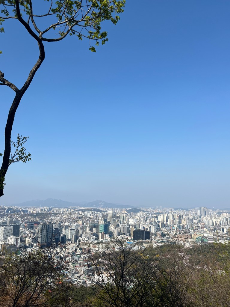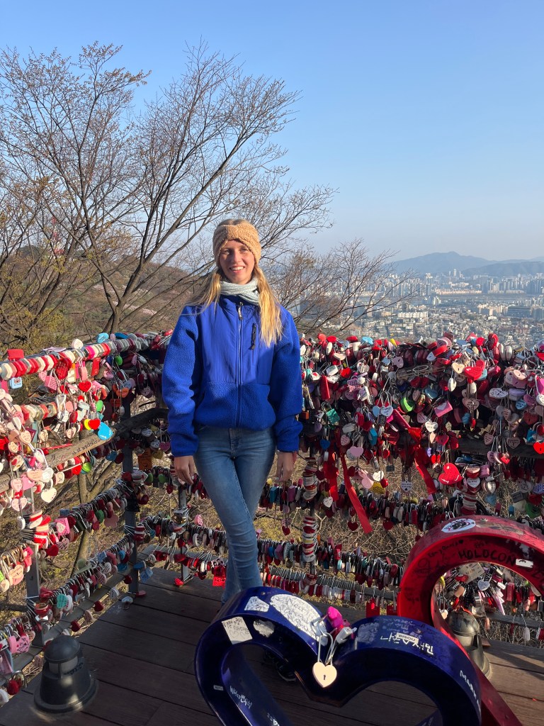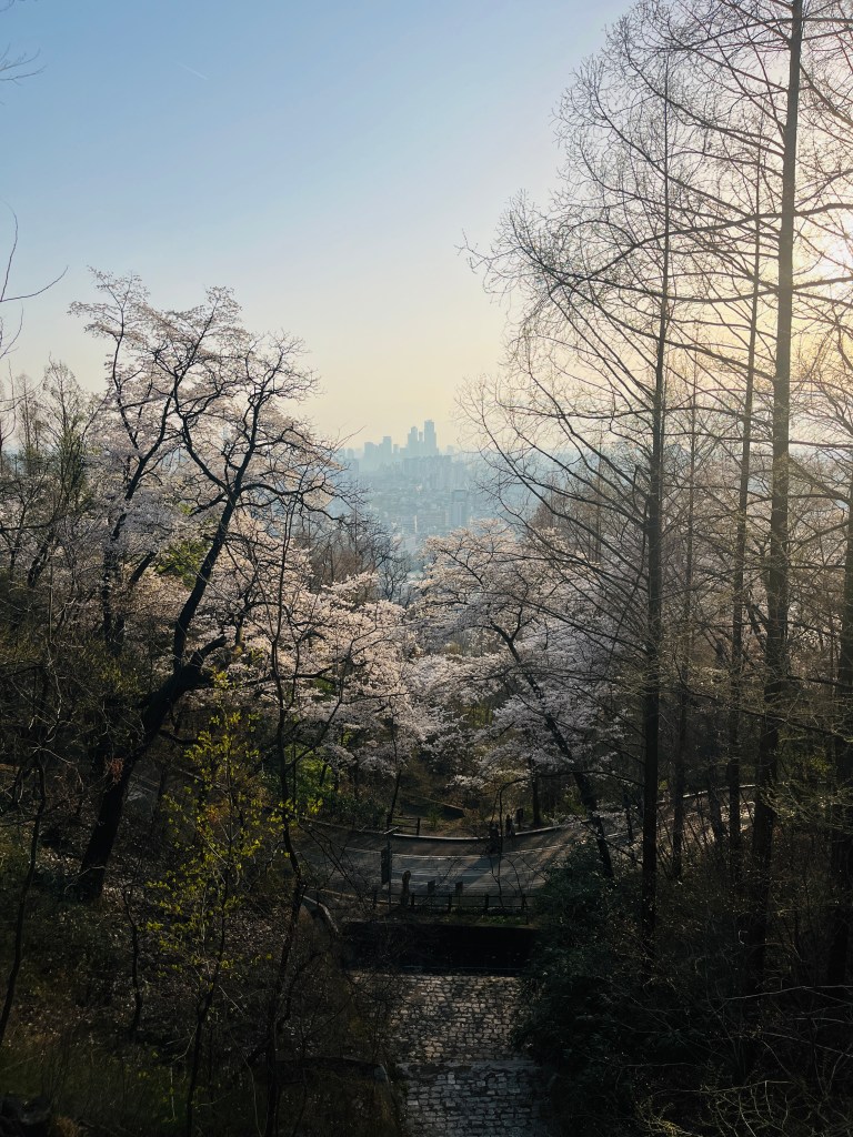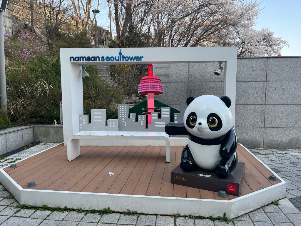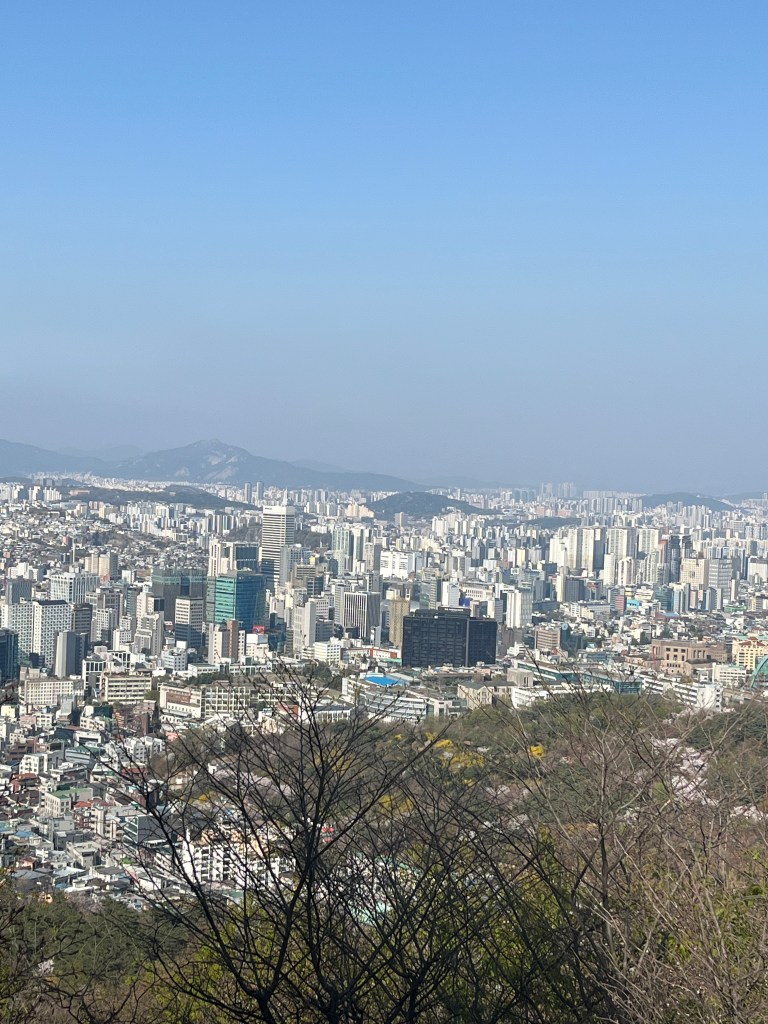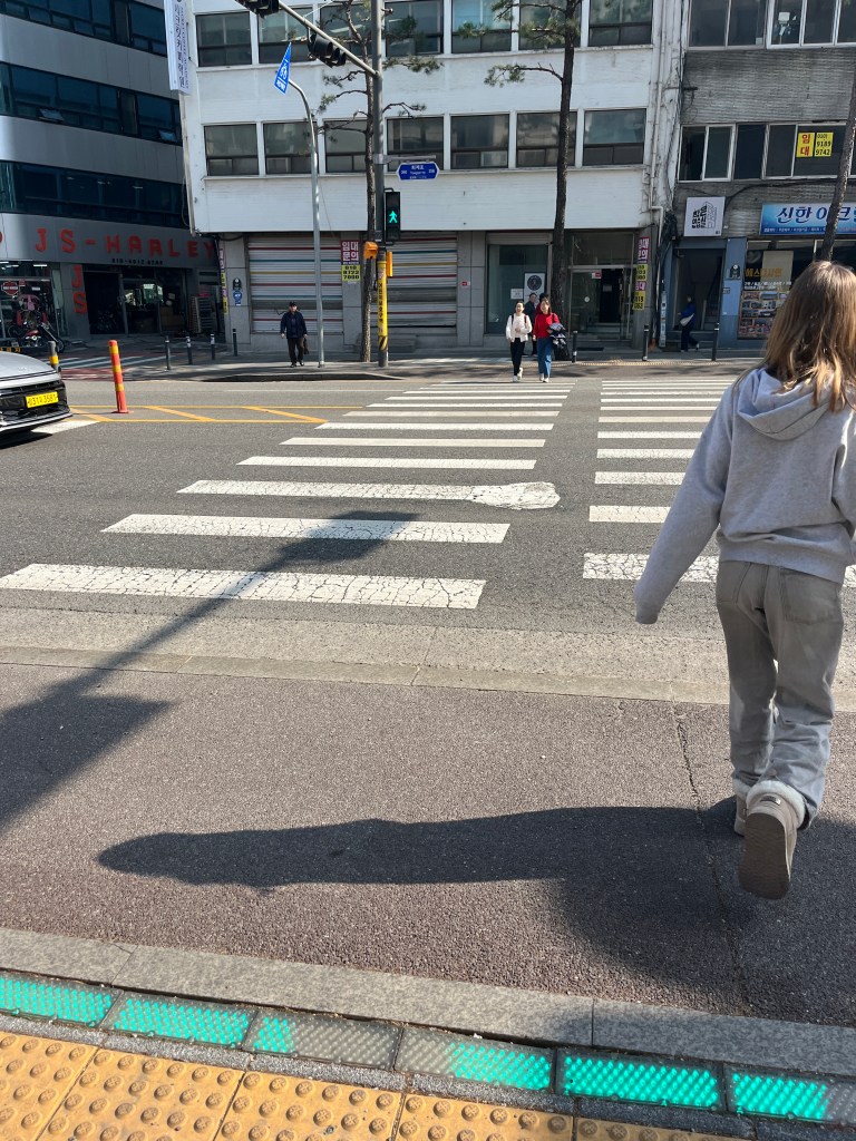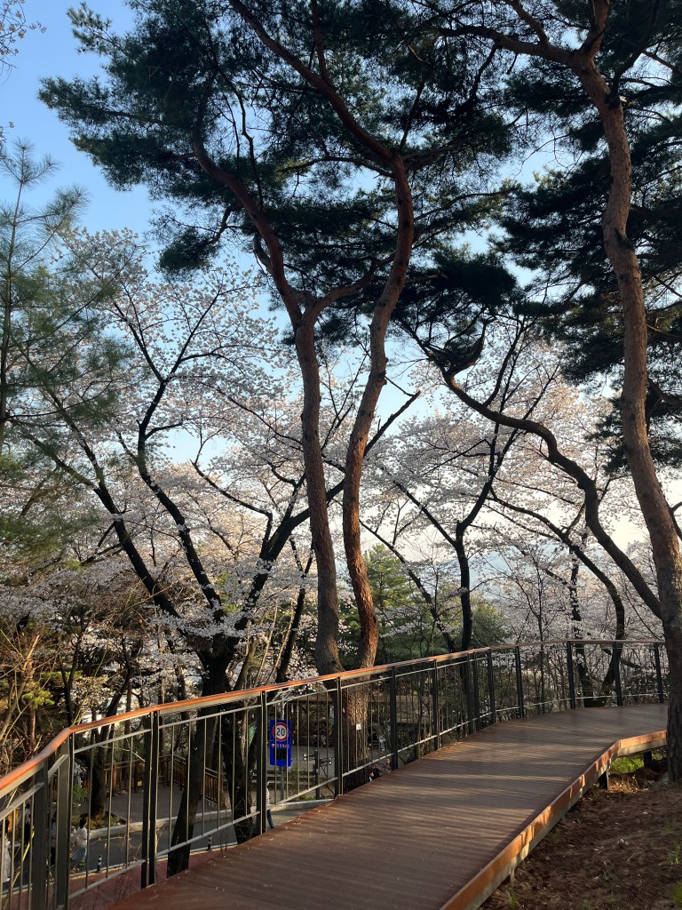 Then in the afternoon, Hannah, Charlotte, Luisa and I went out to explore while Olivia recuperated and Steffen helped her. We took the bus over to N Seoul Tower and then took a walk through Namsan park. The bus was very easy to figure out, though the traffic in Seoul is terrible! Not chaotic but a lot of it. I’m still amazed at how little traffic there was in Tokyo…. We spotted these traffic signals in the street that I had heard about online. What I had heard was they placed them there so that people would notice the signal change while looking at their phones, but when we saw them in action at night, it was clear how much safer they are. We enjoyed wandering the streets a bit and taking everything in.
