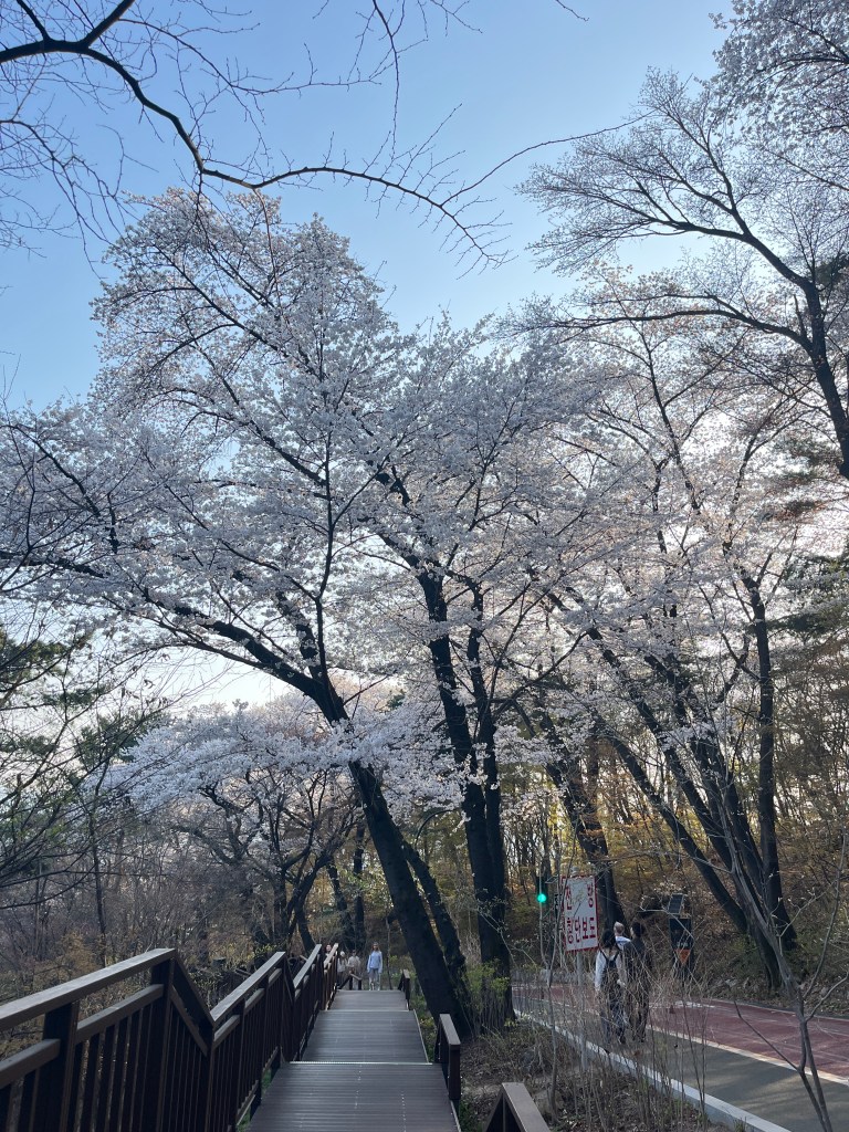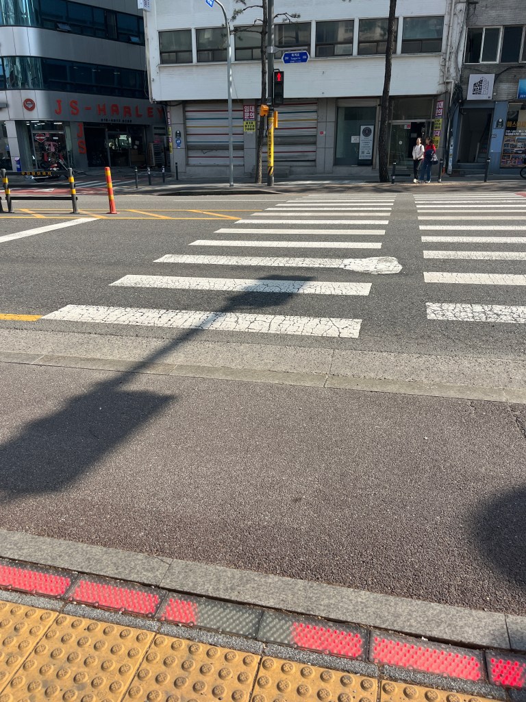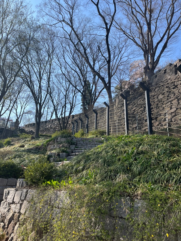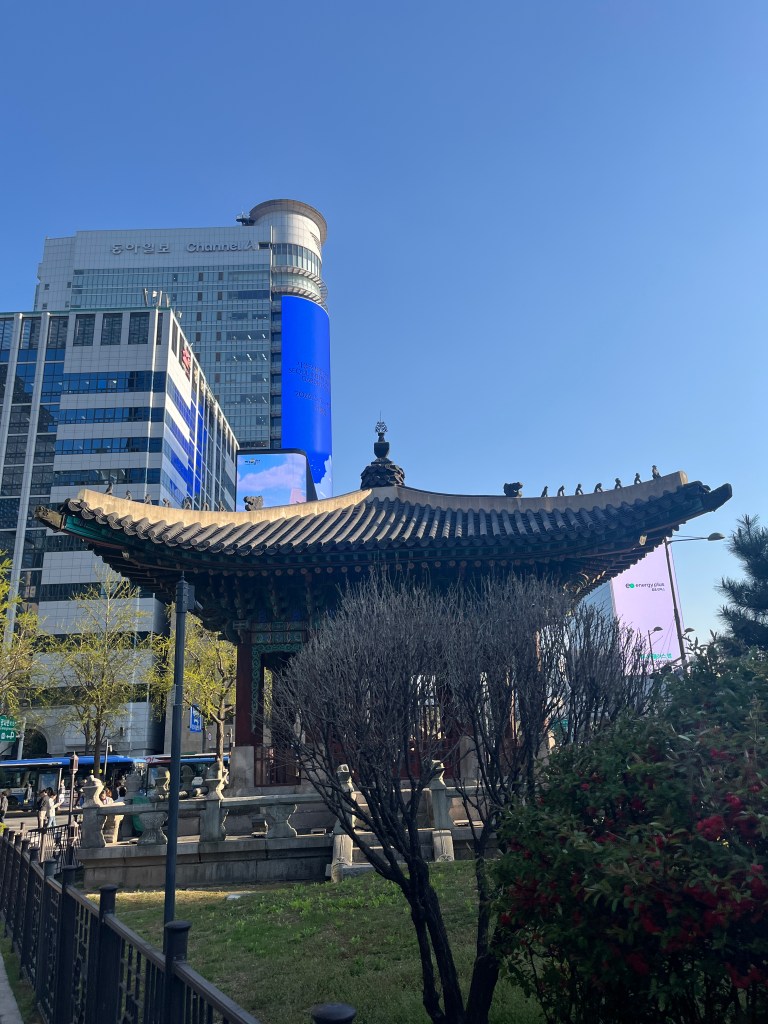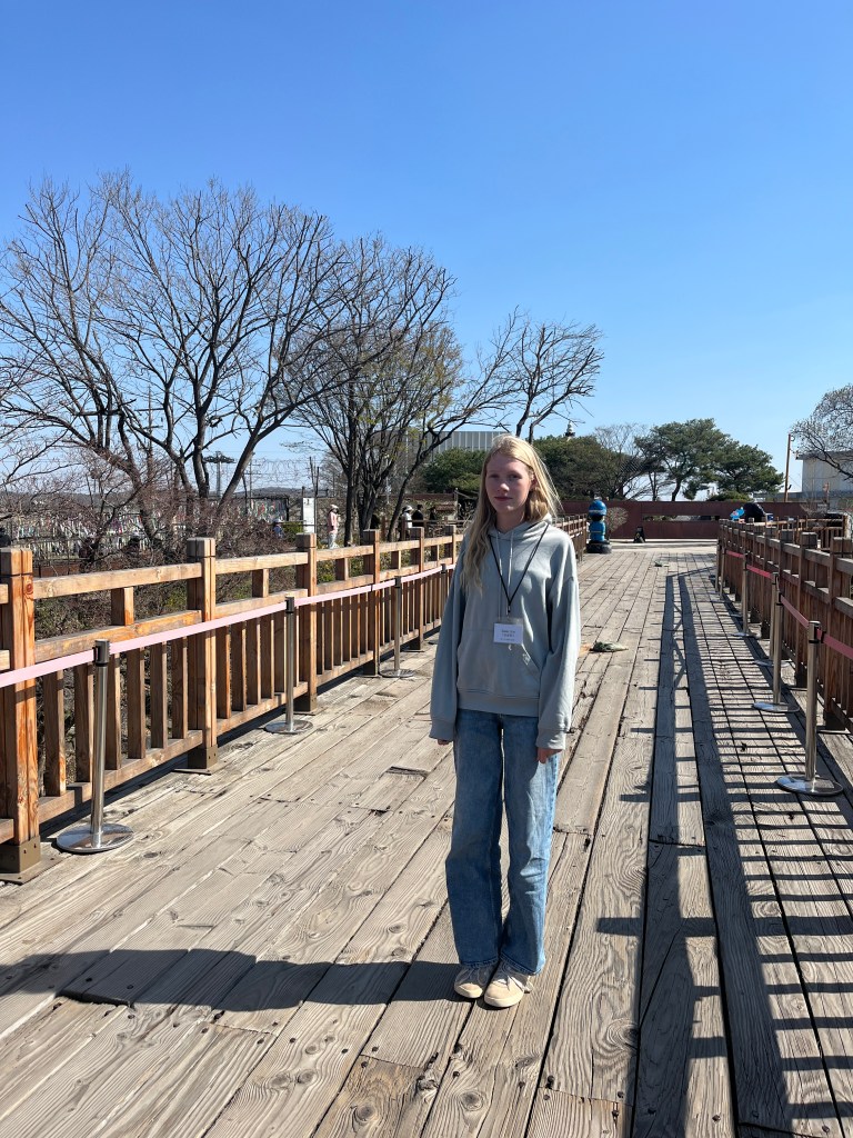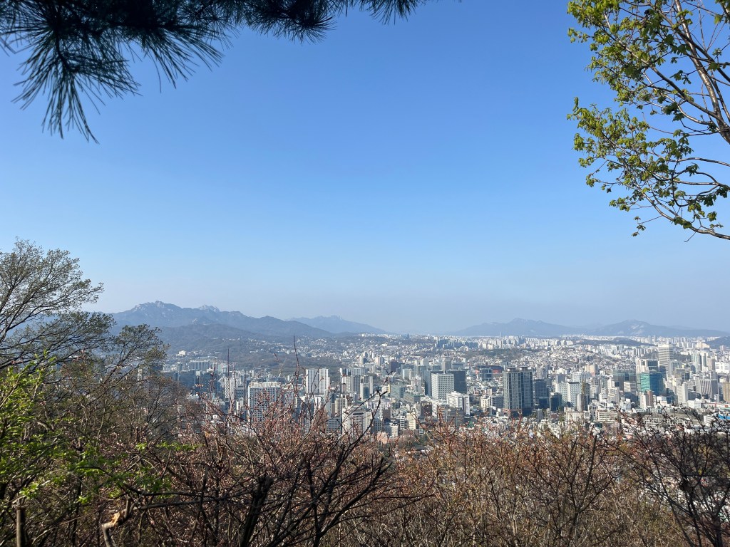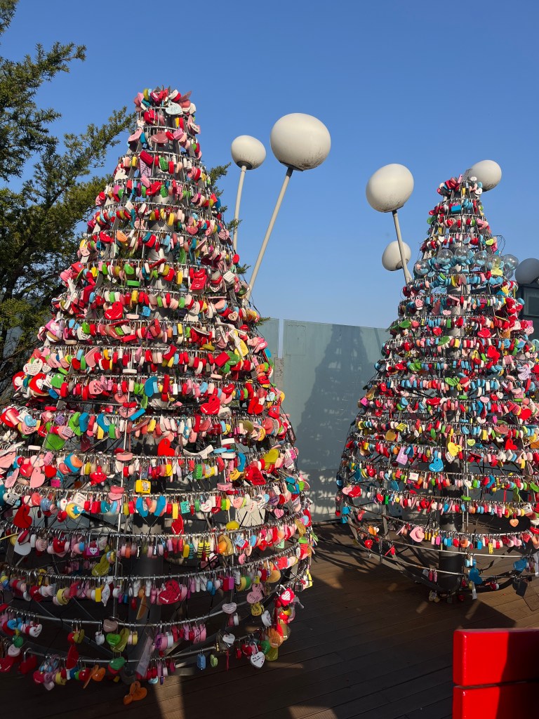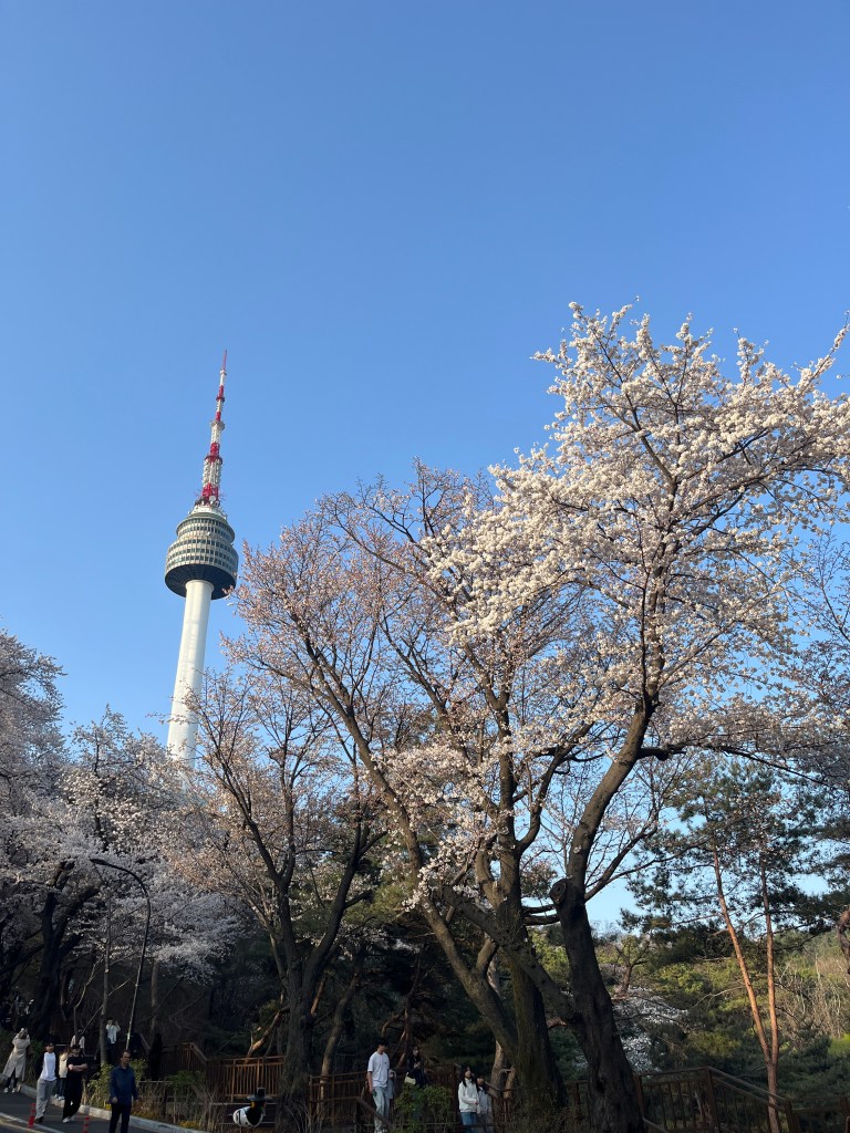 Then in the afternoon, Hannah, Charlotte, Luisa and I went out to explore while Olivia recuperated and Steffen helped her. We took the bus over to N Seoul Tower and then took a walk through Namsan park. The bus was very easy to figure out, though the traffic in Seoul is terrible! Not chaotic but a lot of it. I’m still amazed at how little traffic there was in Tokyo…. We spotted these traffic signals in the street that I had heard about online. What I had heard was they placed them there so that people would notice the signal change while looking at their phones, but when we saw them in action at night, it was clear how much safer they are. We enjoyed wandering the streets a bit and taking everything in.