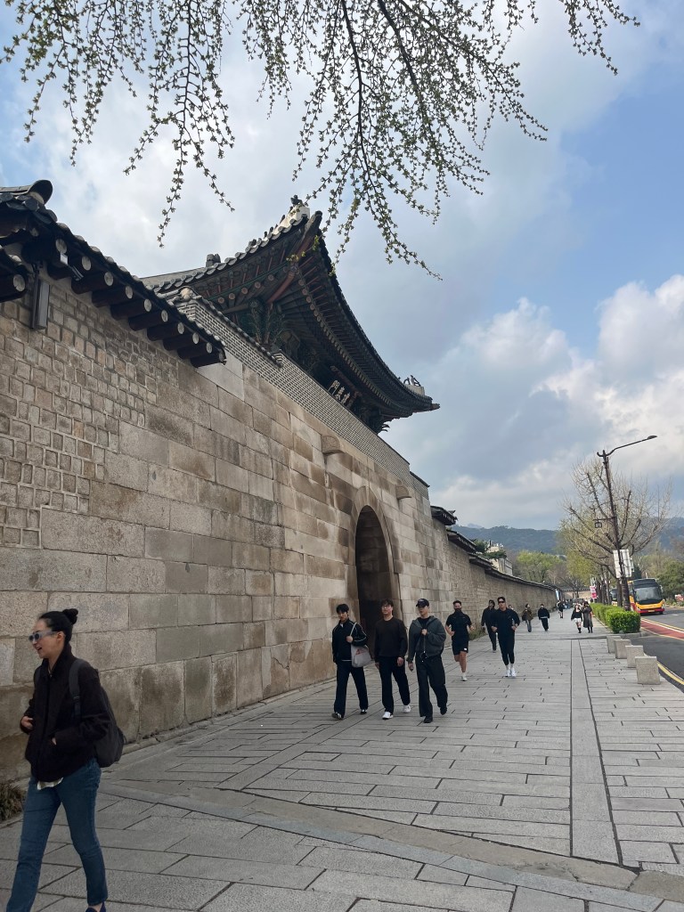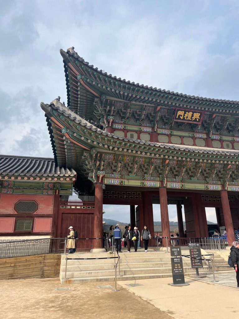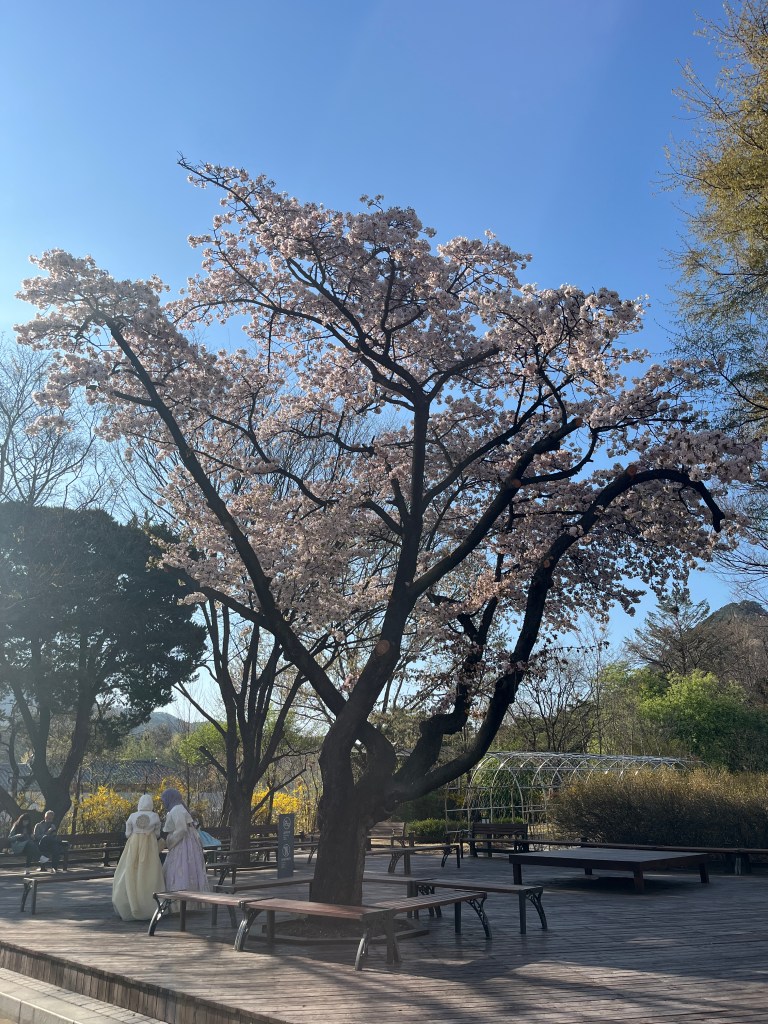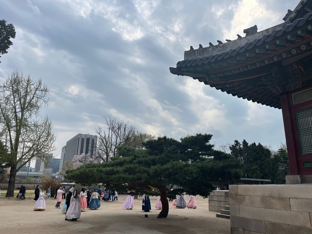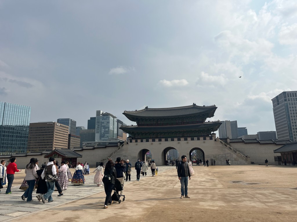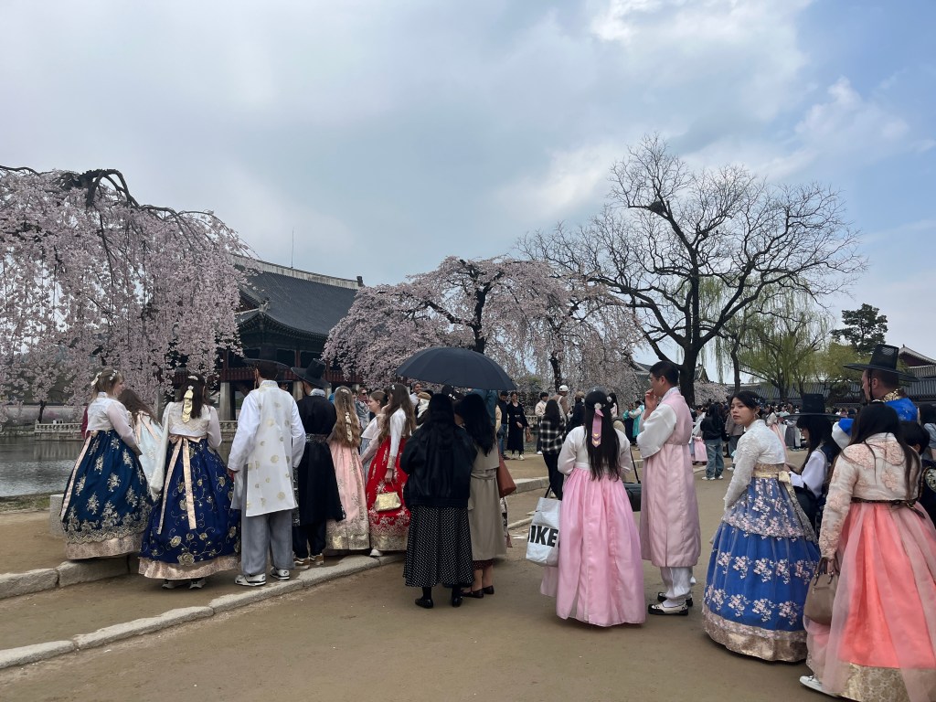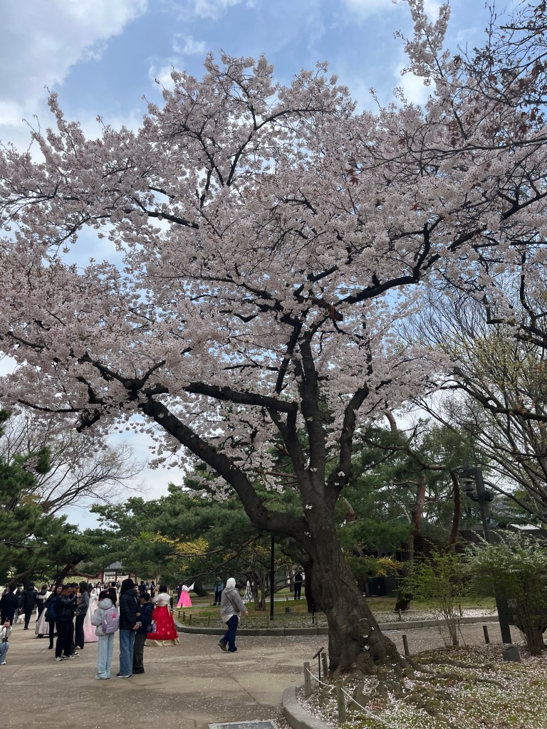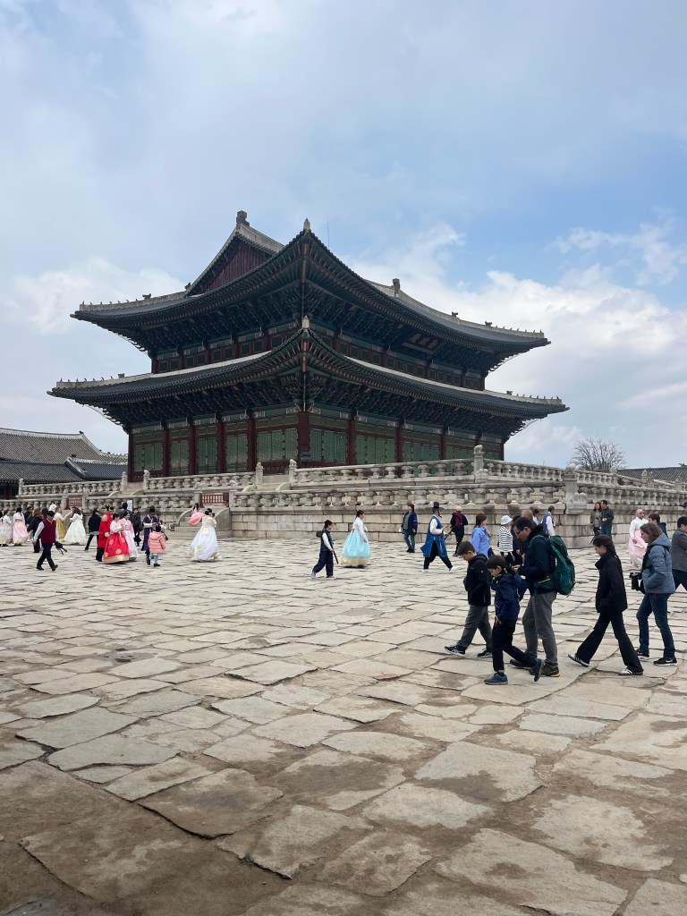 Since Olivia still wasn’t feeling well so she and Steffen stayed home another day, while the rest of us went and explored more. Our first stop was Gyeongbokgung Palace where we wandered the grounds, admired the beautiful hanboks that many tourists and locals wear to visit the palace, and caught a few more cherry blossom trees blooming.