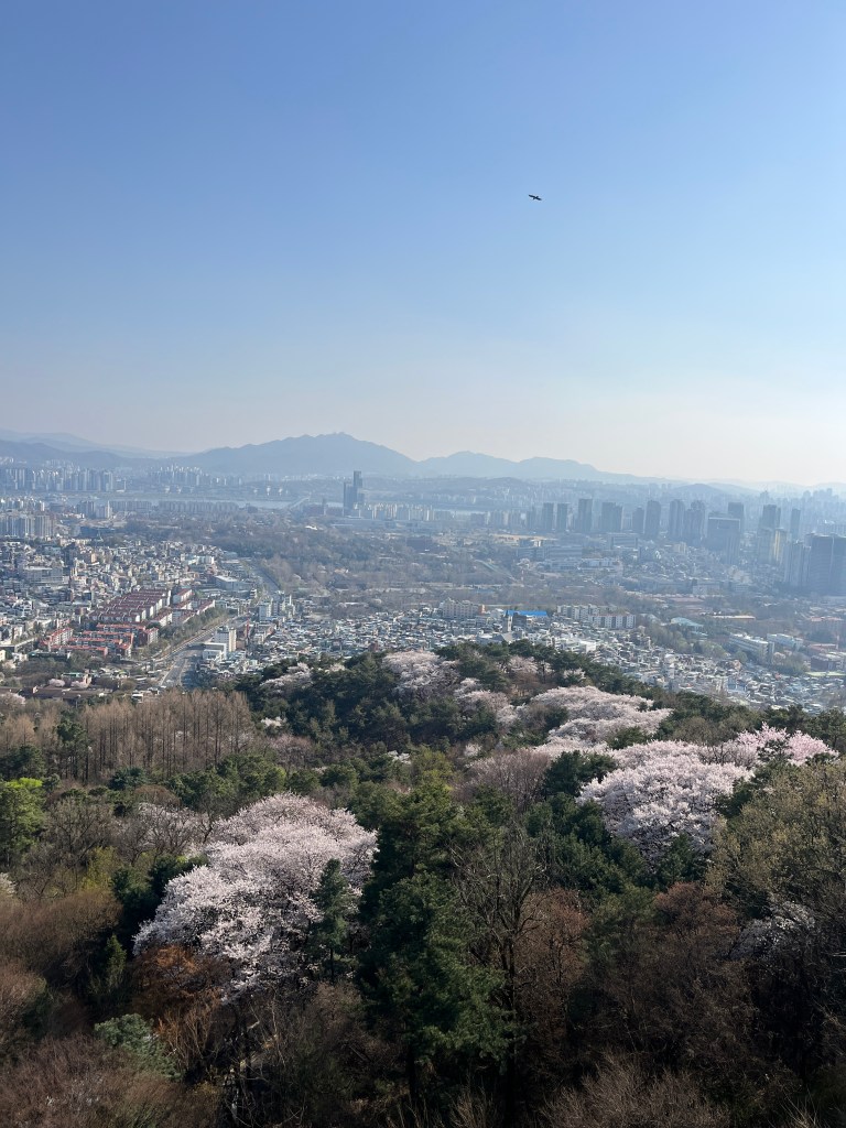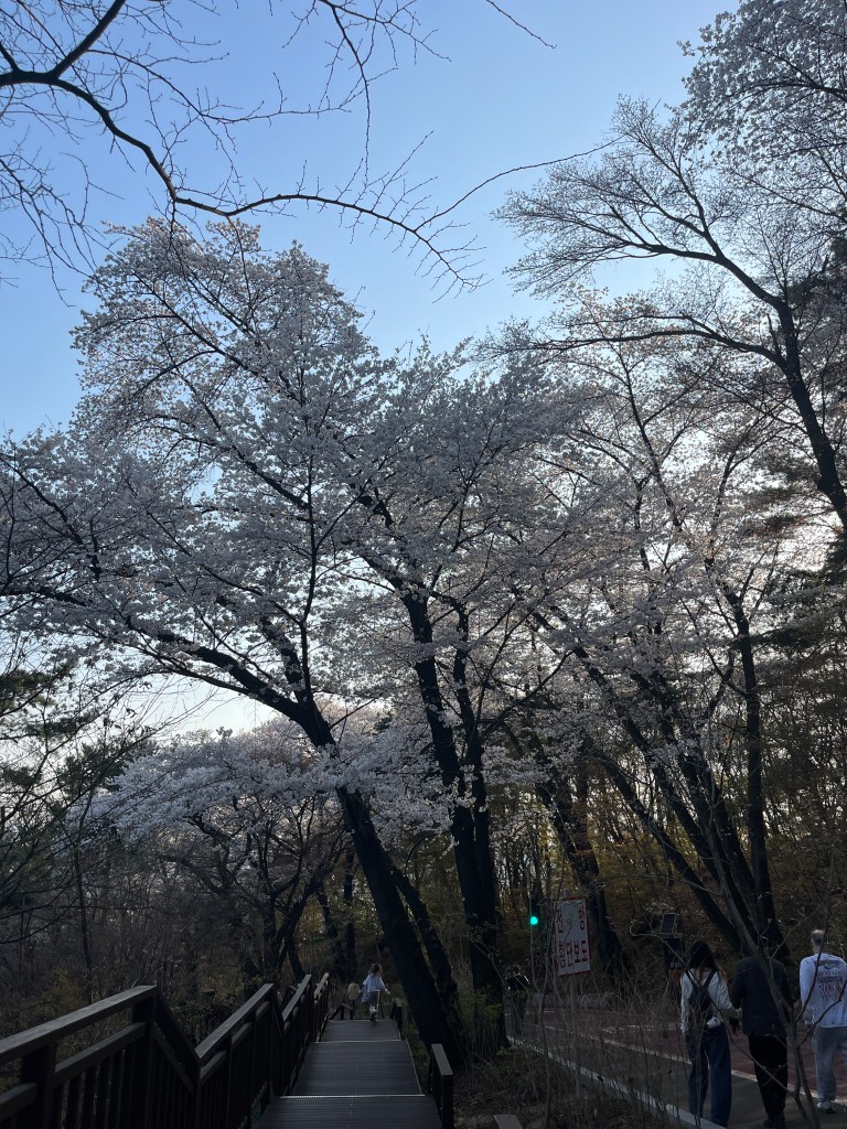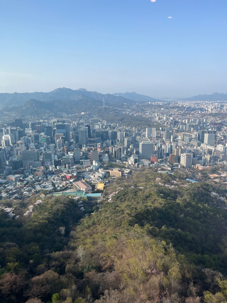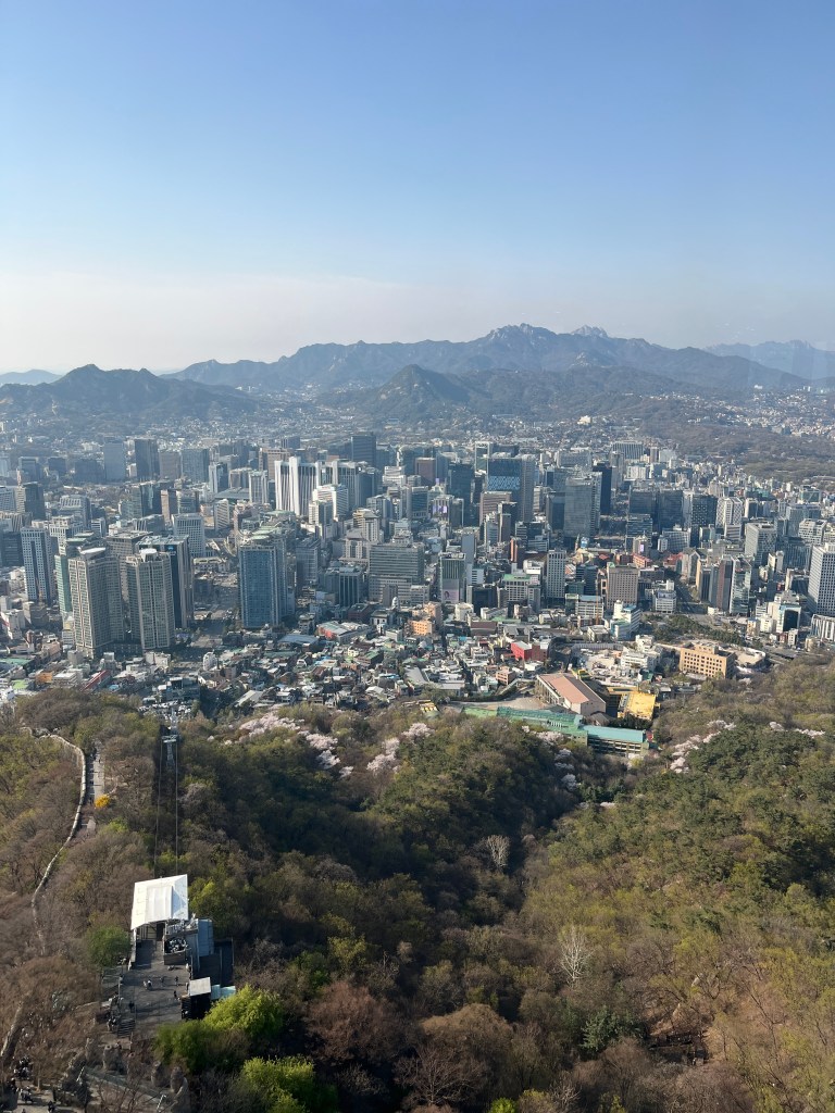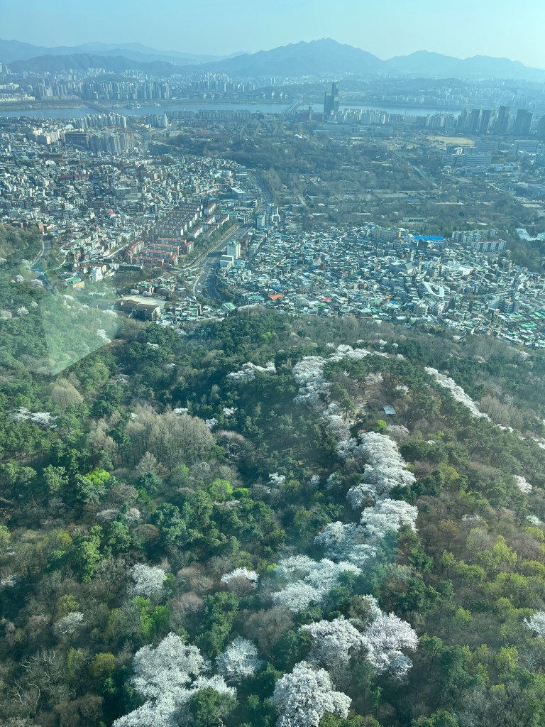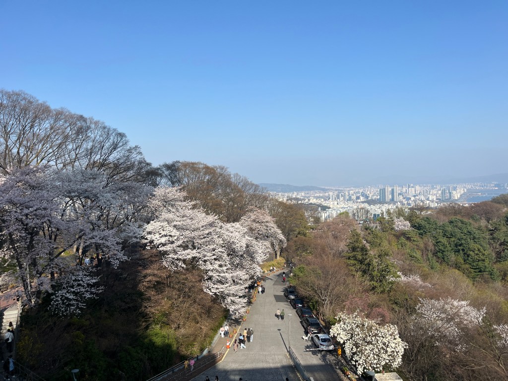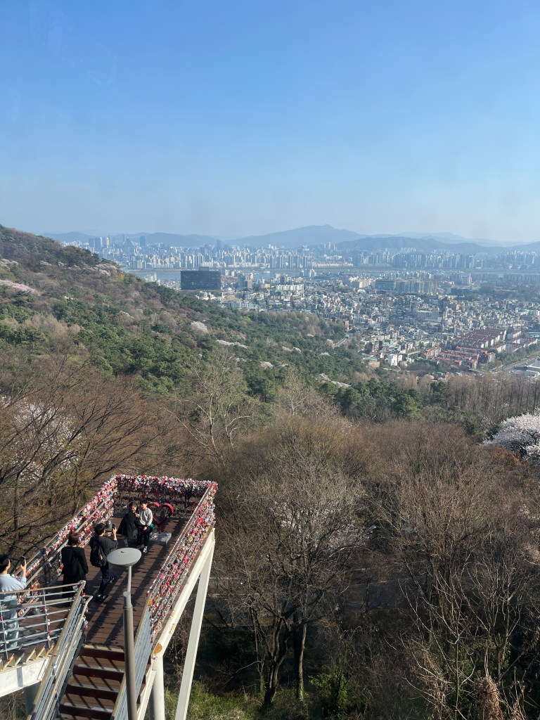 We went with the bus to the top of the hill where the tower starts. We were so happy to see so many cherry blossoms still blooming. That didn’t really occur to me when we made plans to come here so it was a very happy surprise! And there are mountains surrounding Seoul! I had no idea. (Can you tell that Seoul was a last minute addition to our itinerary? I didn’t do very much research.)